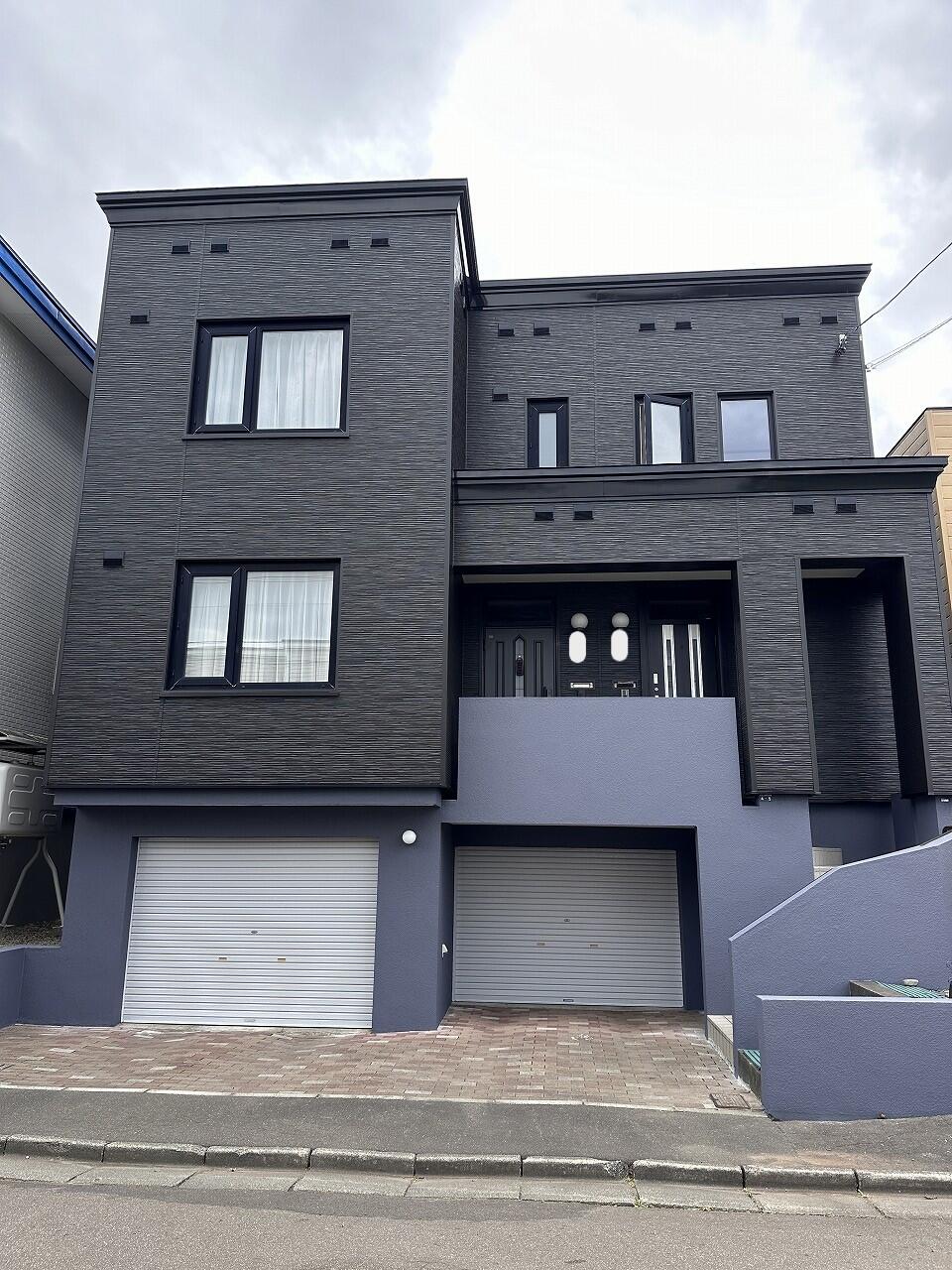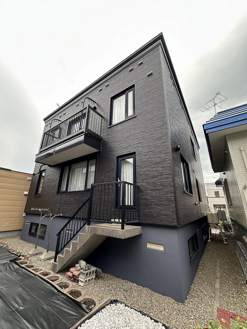 新たに金属製外壁材(金属系サイディング)を採用し、種類はお施主様のご要望とお好みに合わせた『ニチハ ネオレリーフプレミアム』を選定しました。 これまでの雰囲気とは大きく変わり、深みのあるダークトーンな高級感のある仕上がりとなりました。