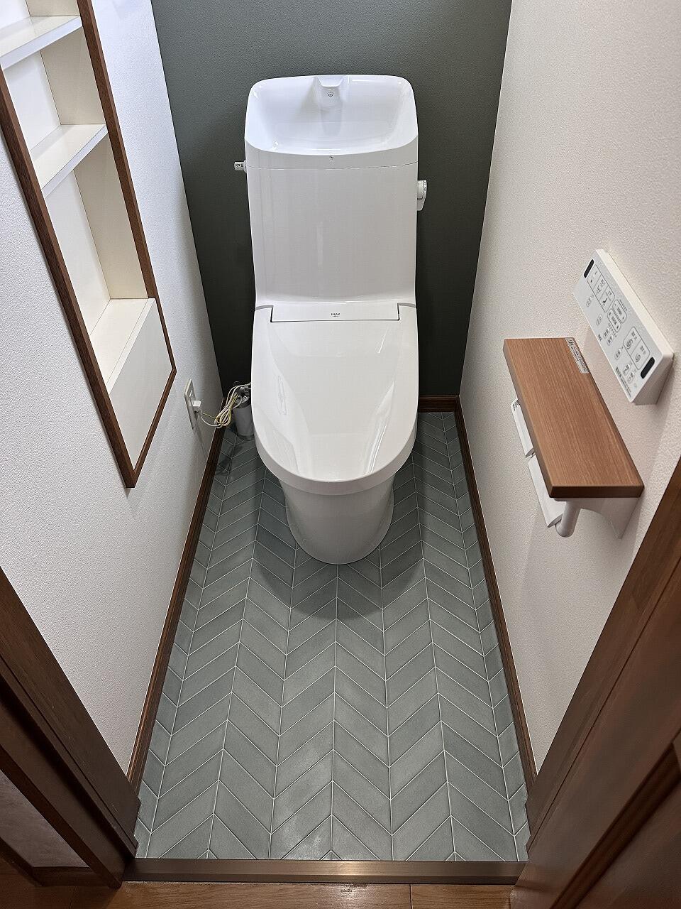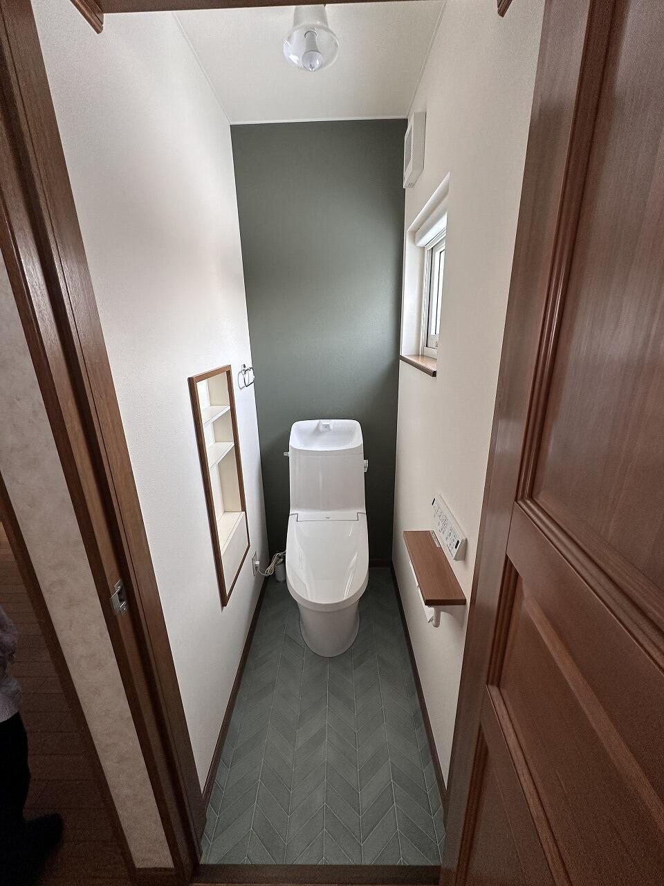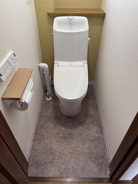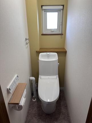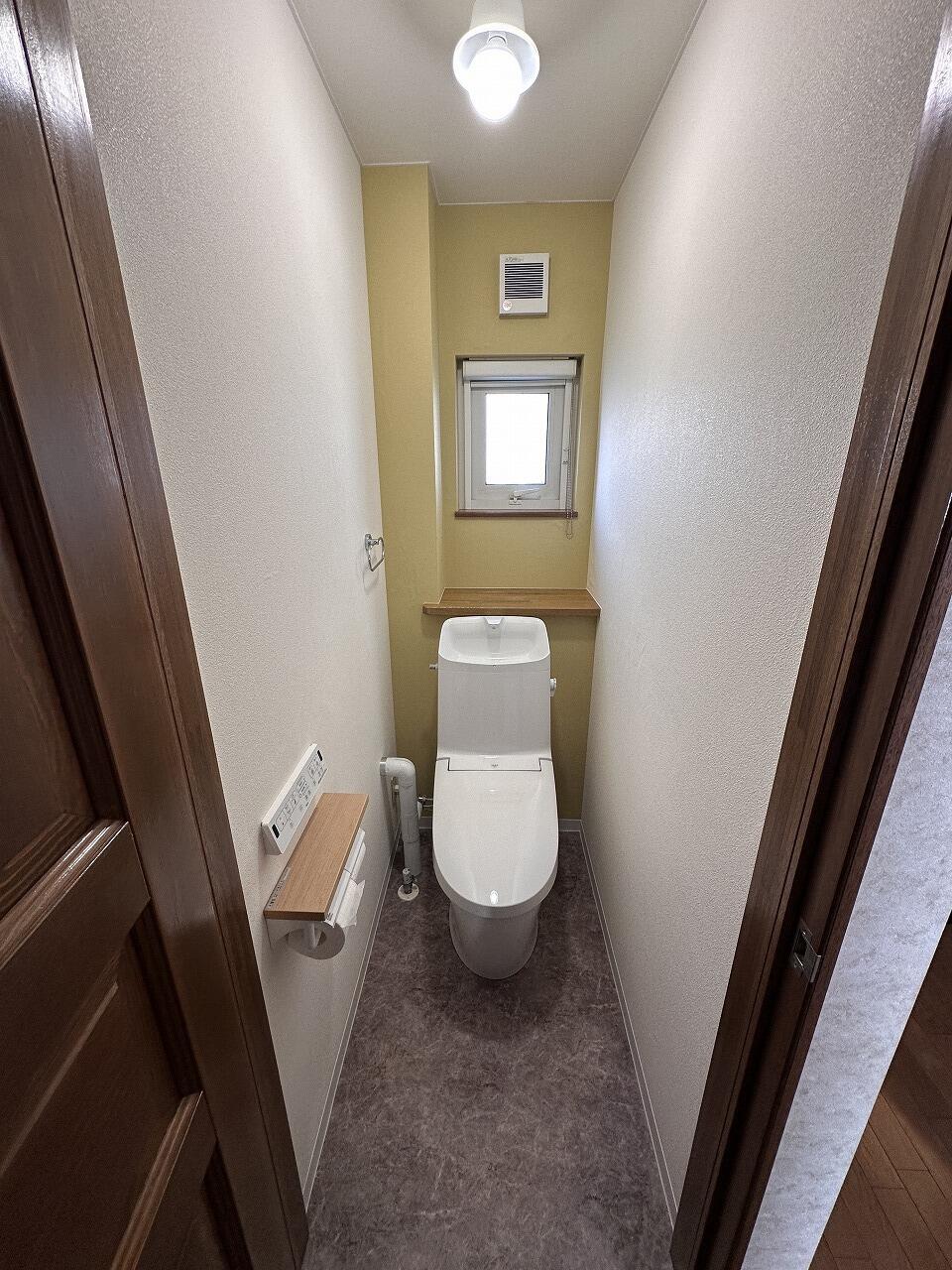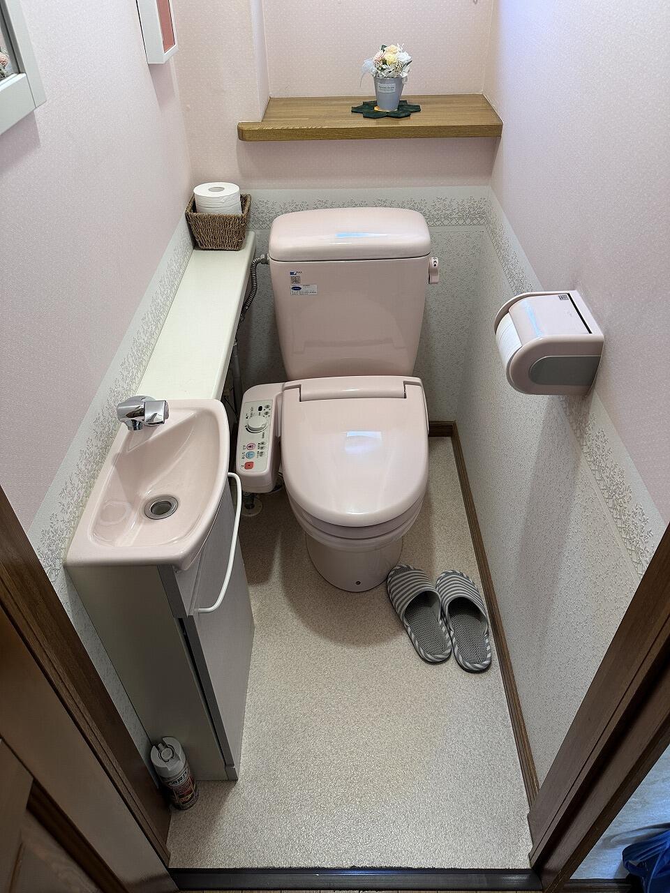 1階のトイレは既存の手洗い器を撤去し、手洗い付きのトイレとすることで、空間を広くしました。 2階のトイレも同時に工事をし、どちらもクロスやクッションフロアを貼り替えたことで、これまでとは違った雰囲気の仕上がりとなりました。 ※48万円