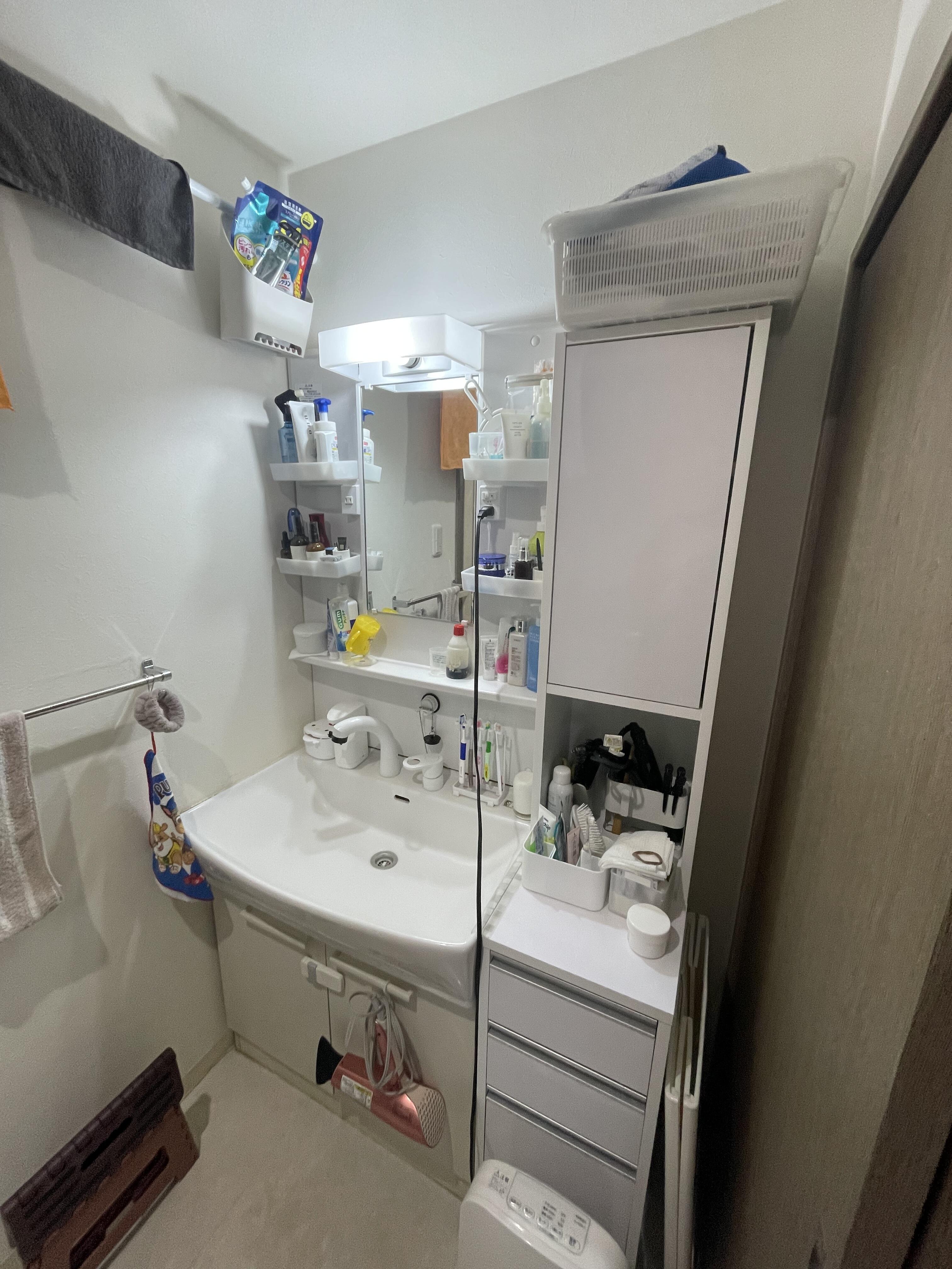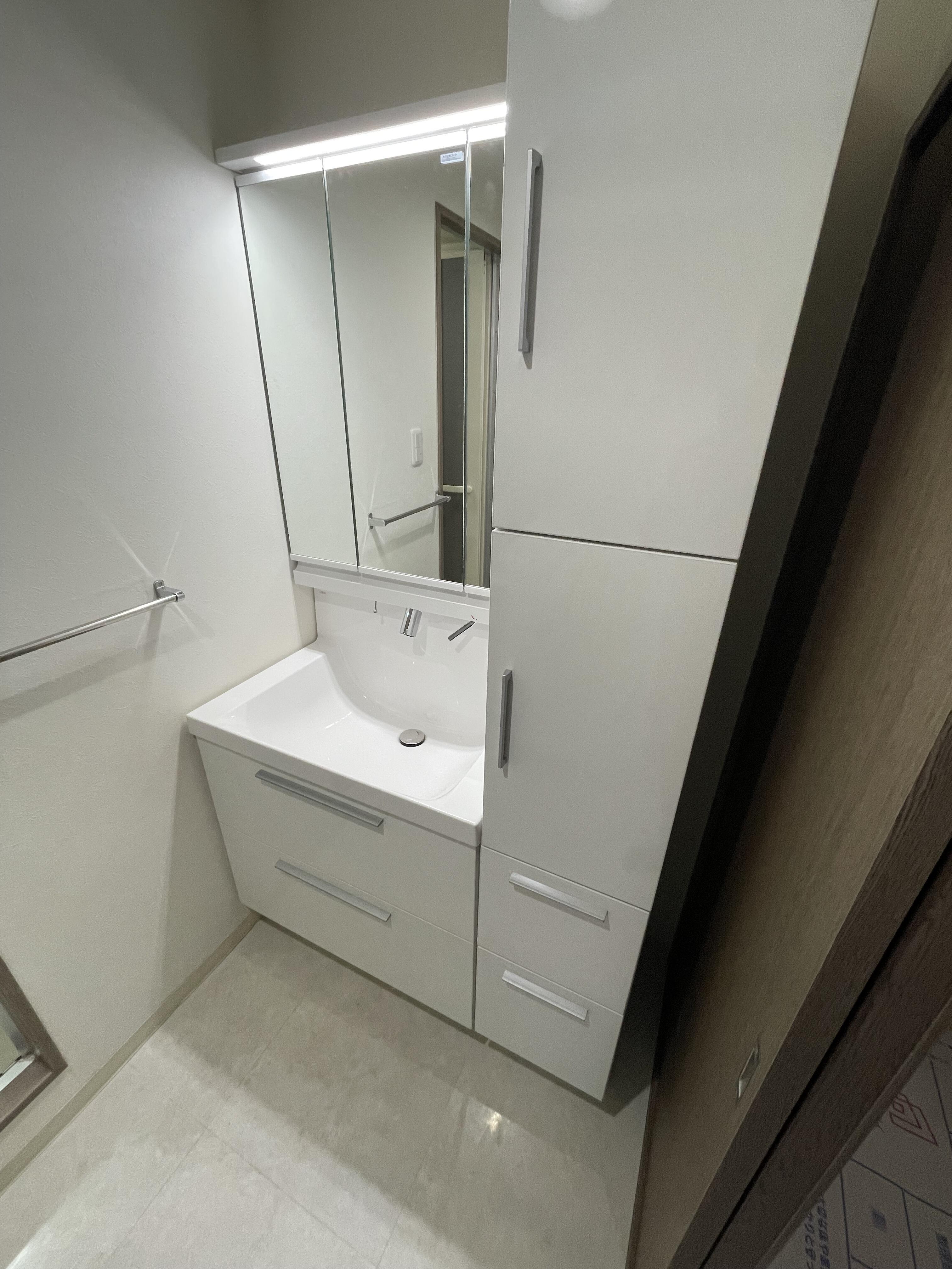 洗面ボウルの陶器にヒビが入っていた為、交換することになりました。元々は一面鏡で収納部がオープンになっていましたが、3面鏡にすることで収納部を隠すことができ、すっきりした見た目になりました。また、サイドキャビネットも一緒に交換し収納量が増え、とても満足していただけました。