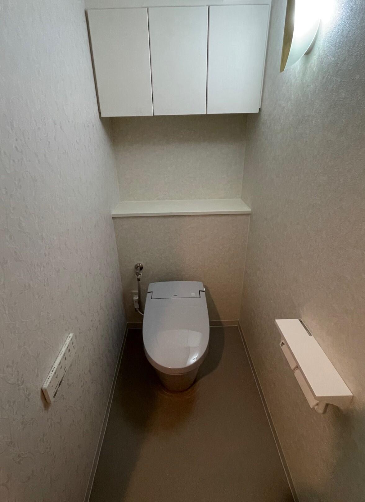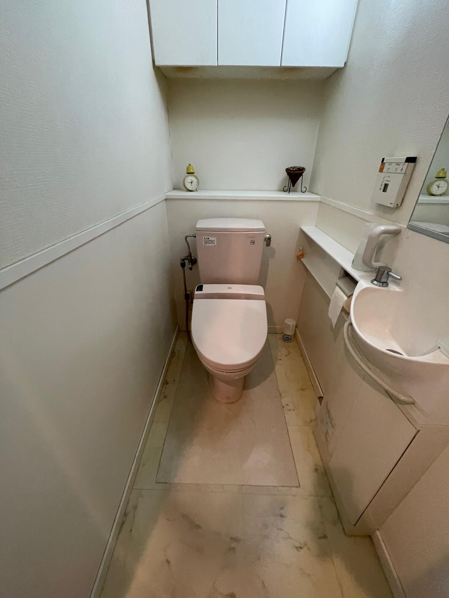 トイレ空間をスッキリさせたいというご要望にて一番奥行のスッキリできるLIXIL製のサティスSにて工事しました。 トイレのタンクがなくなったのと、横に設置していた手洗器も撤去したことで広く使用できるようになりました。 ※50万円