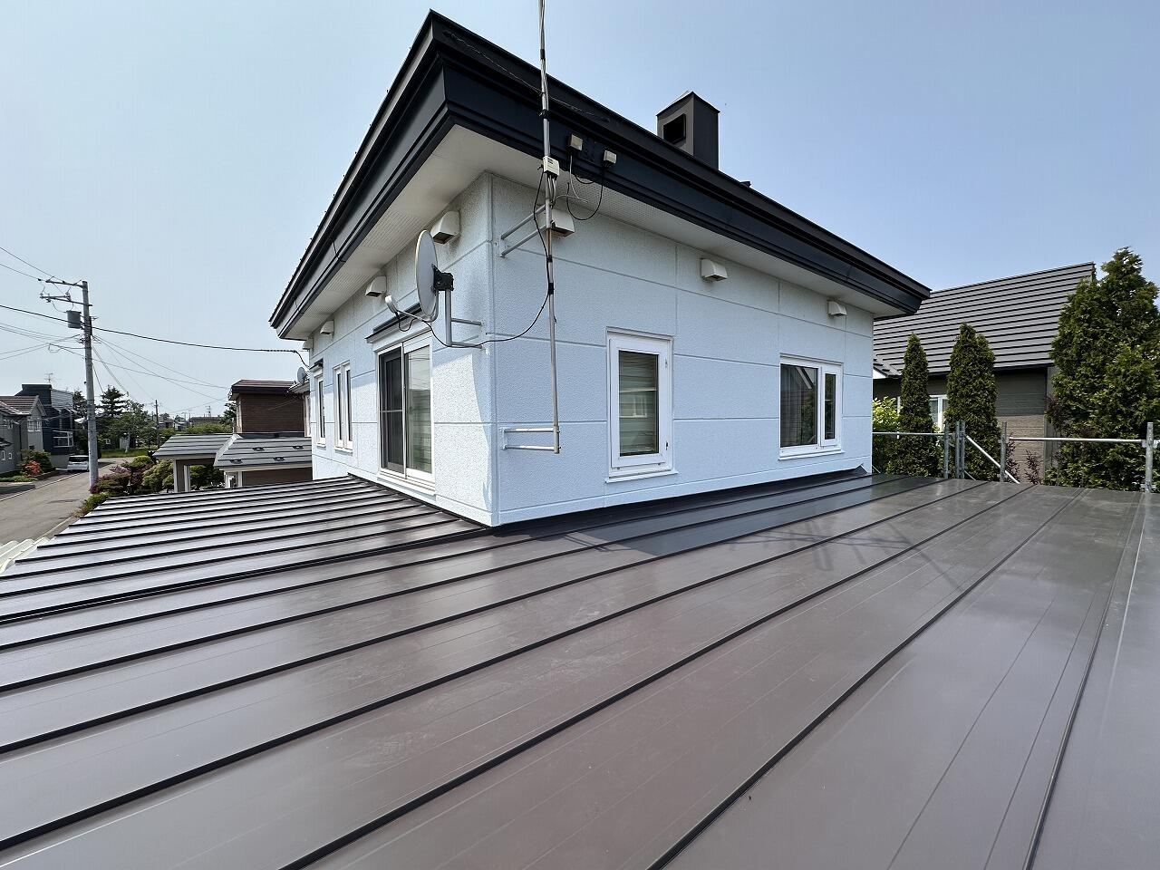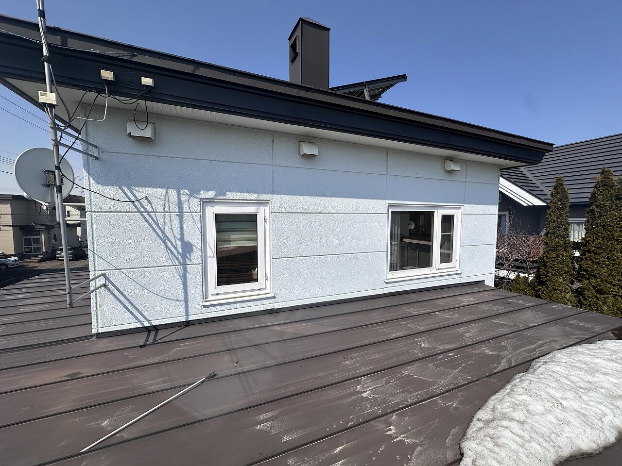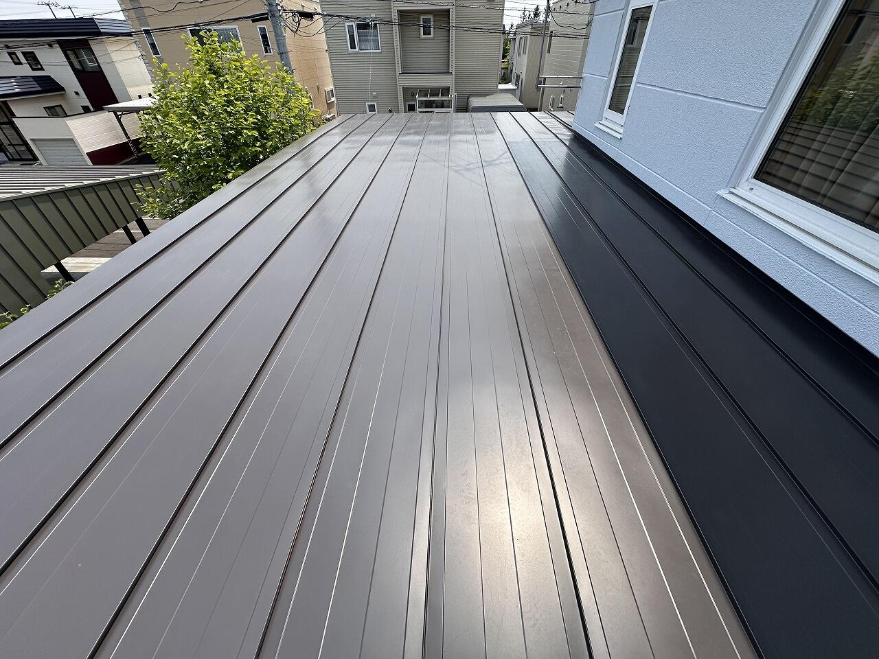 数年前に他社様にて屋根工事をされたとのことでしたが、屋根勾配が取れておらず、雨水が溜まることが原因で出窓から雨漏れが発生しておりました。 新築時の屋根板金+前回工事時の屋根板金を撤去し、大工工事にて木下地を調整し、板金を葺き替えました。