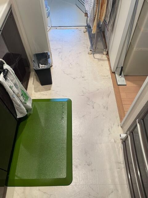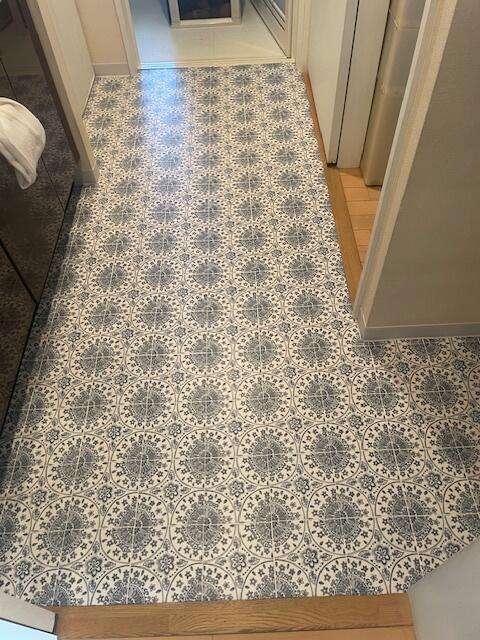 浴室の入り口部分の床が水の拭き残しにより剥がれが生じていて、貼替工事をさせていただきました。 柄も大きく変更し、華やかになりました。