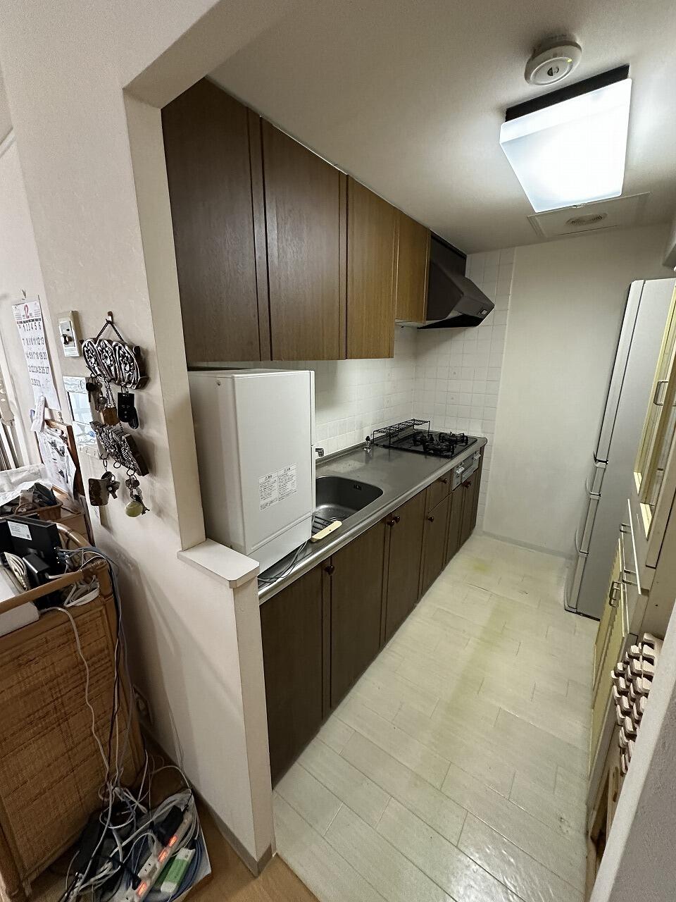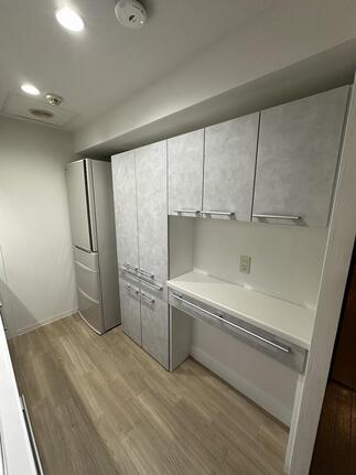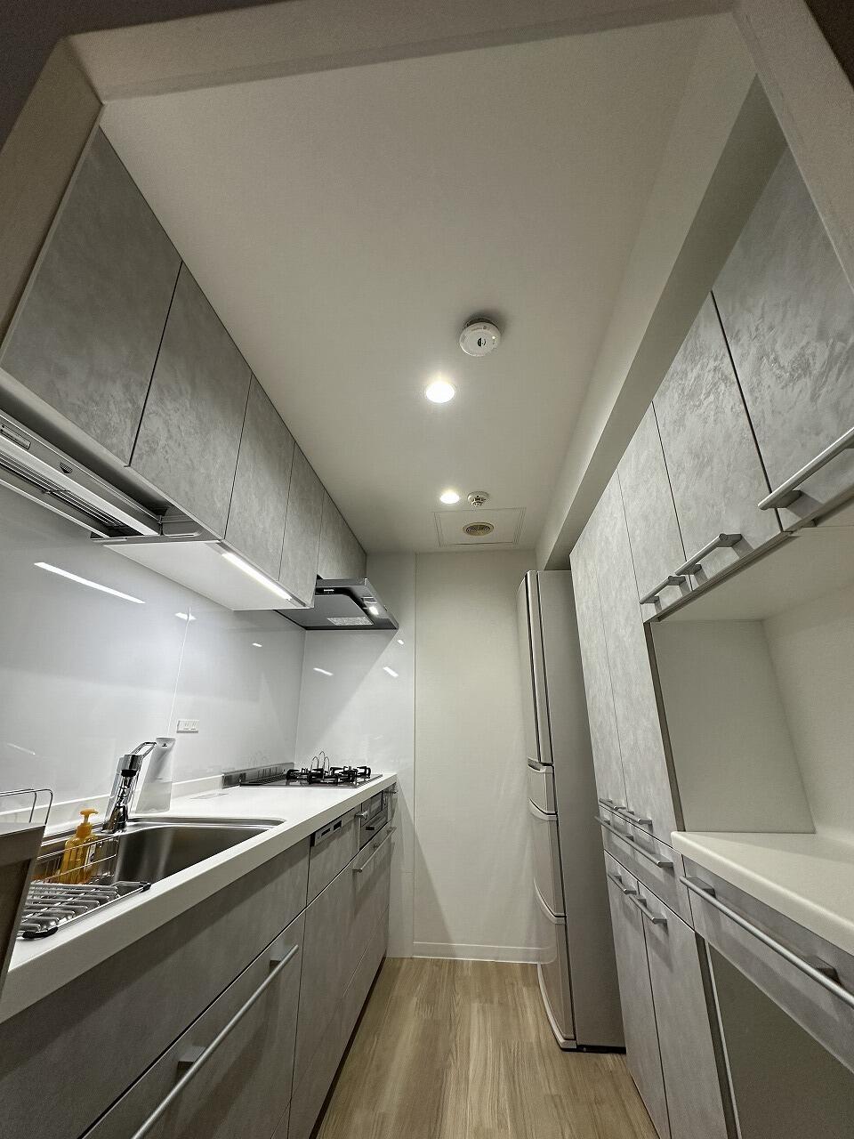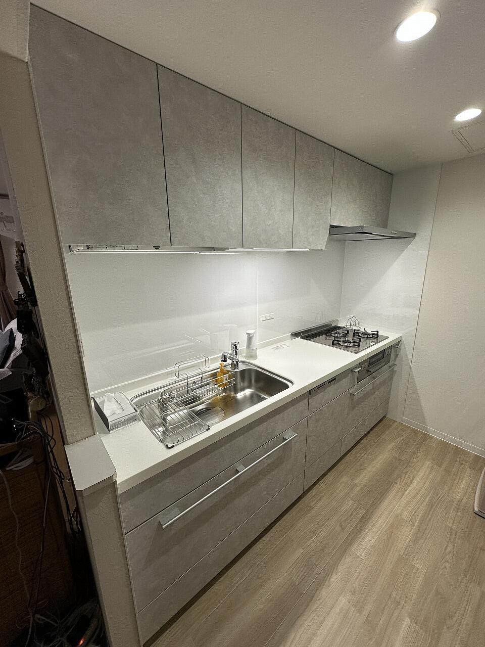 ご家族でキッチンに立つことが多く、今よりも人が立つスペースを広く、尚且つ収納スペースも確保したいとのご相談でした。 キッチンとカップボードの奥行や高さ、冷蔵庫を置いた際の横幅や扉の開ききった位置など、入念にお打ち合わせを重ねていただきました。 壁や床も同時に工事させていただき、これまでとは違ったキッチンスペースが完成いたしました。