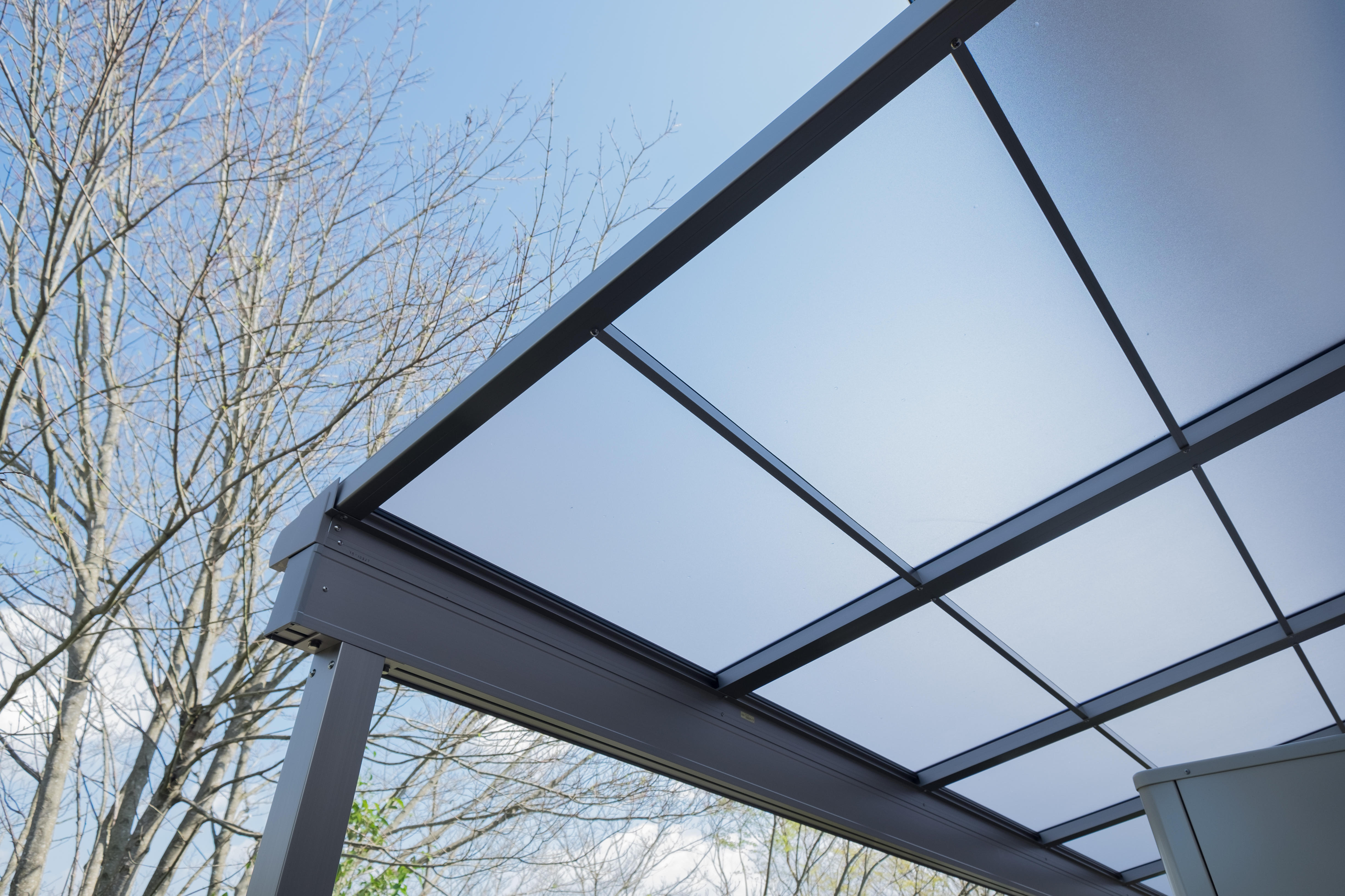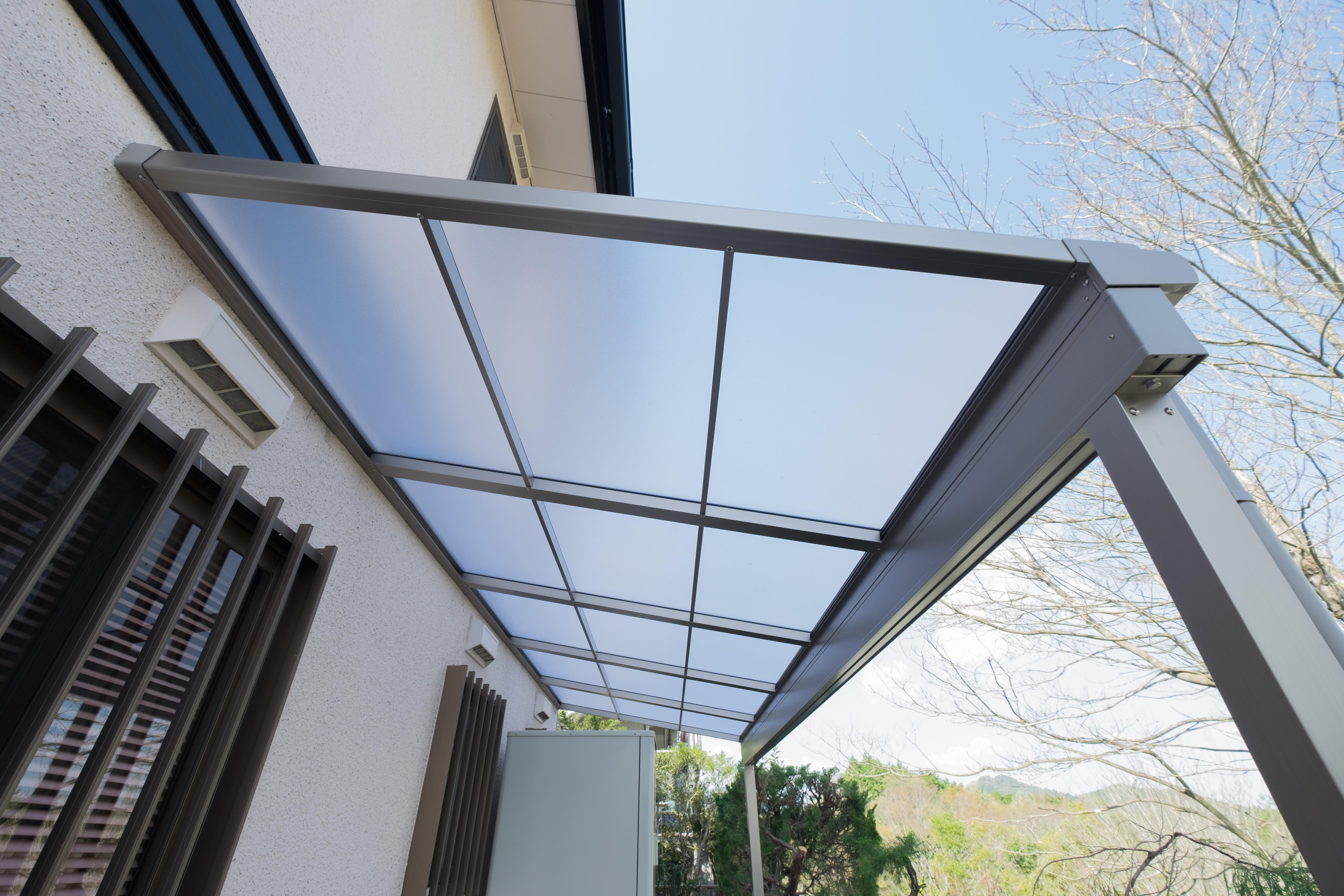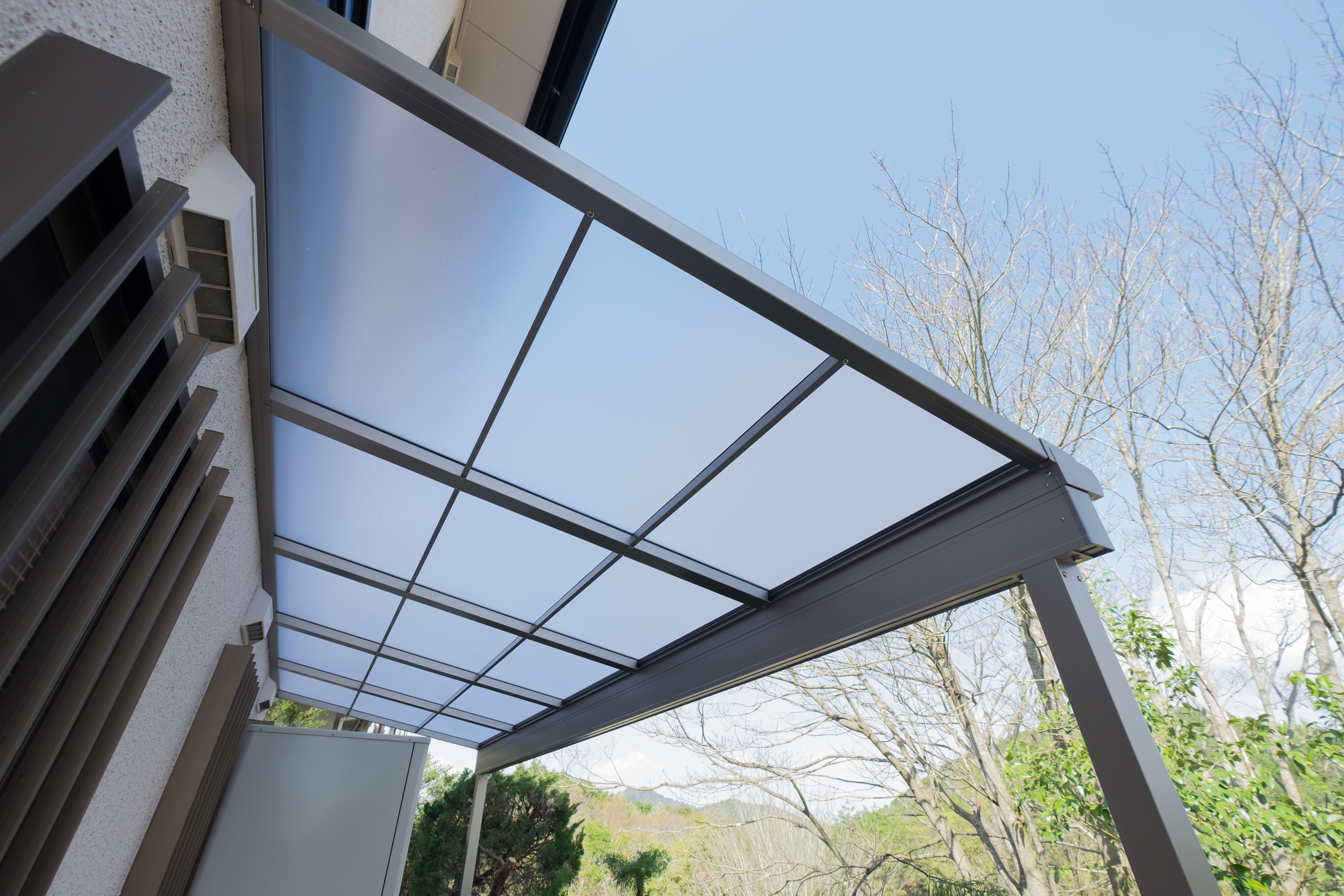 落雪により昔ながらの波板タイプのテラスが全壊したたために、テラス「SPEENE」を設置。お施主様の希望でスマートな形と採光性のある屋根材を希望されたため「SPEENE」をご提案させていただきました。