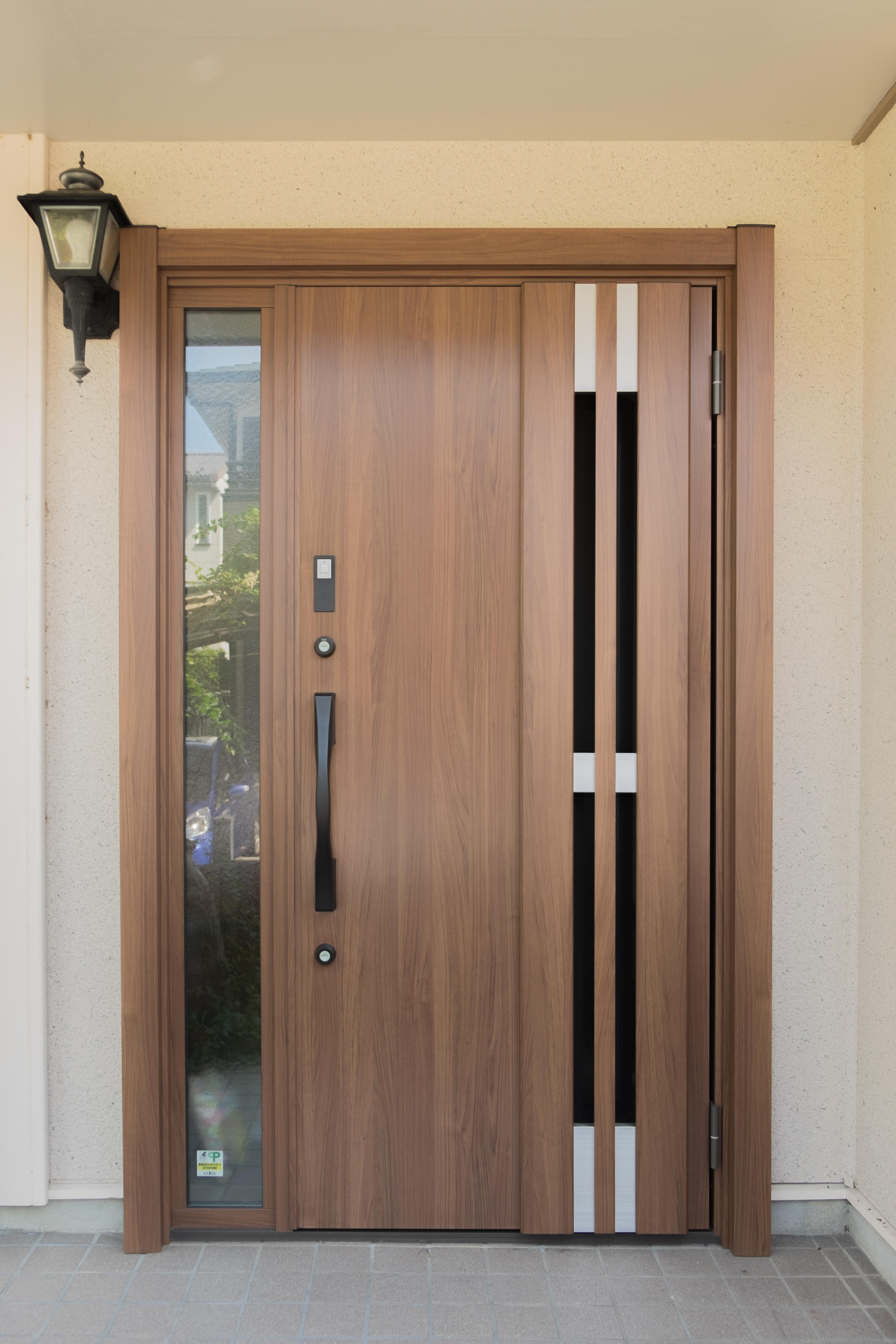 長い年月で傷んでいた玄関ドアを魅力的なドアへ。タイミングよくキャンペーン中だったため、カードを"かざす"だけで施解錠できる「カザスプラス」を無料で取付させていただきました。ちいさなお子さんもキレイに変化した玄関を大変気に入っていただけました。。