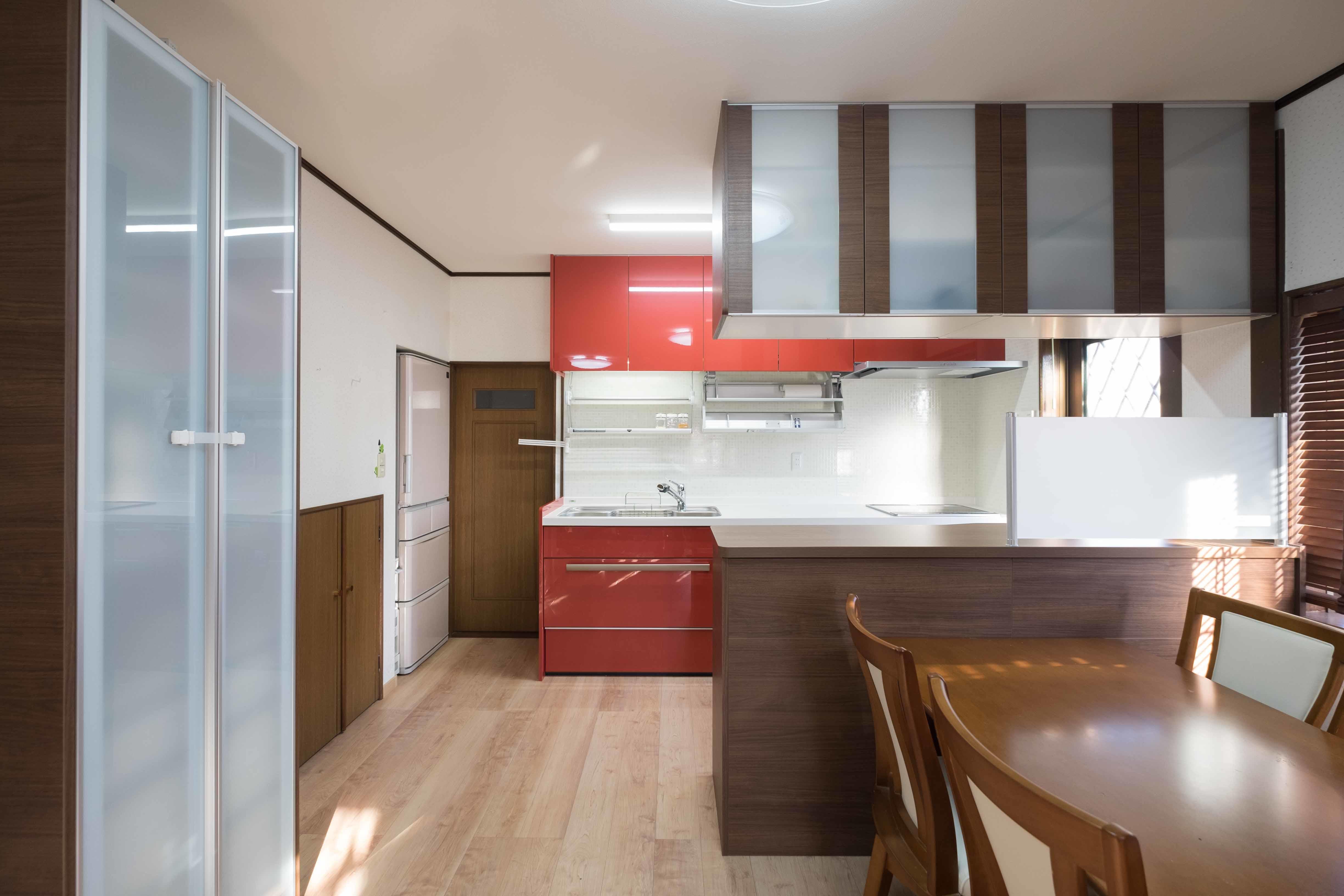 キッチンのワークスペースと収納スペースをたくさん欲しいというお施主様の希望で料理がもっと楽しくなるリシェルSIをお選び頂きました。LDKの床が傾いていたため、床も張替えさせていただき、同時に断熱材が入っていなかっために断熱材もいれさせて頂きました。
