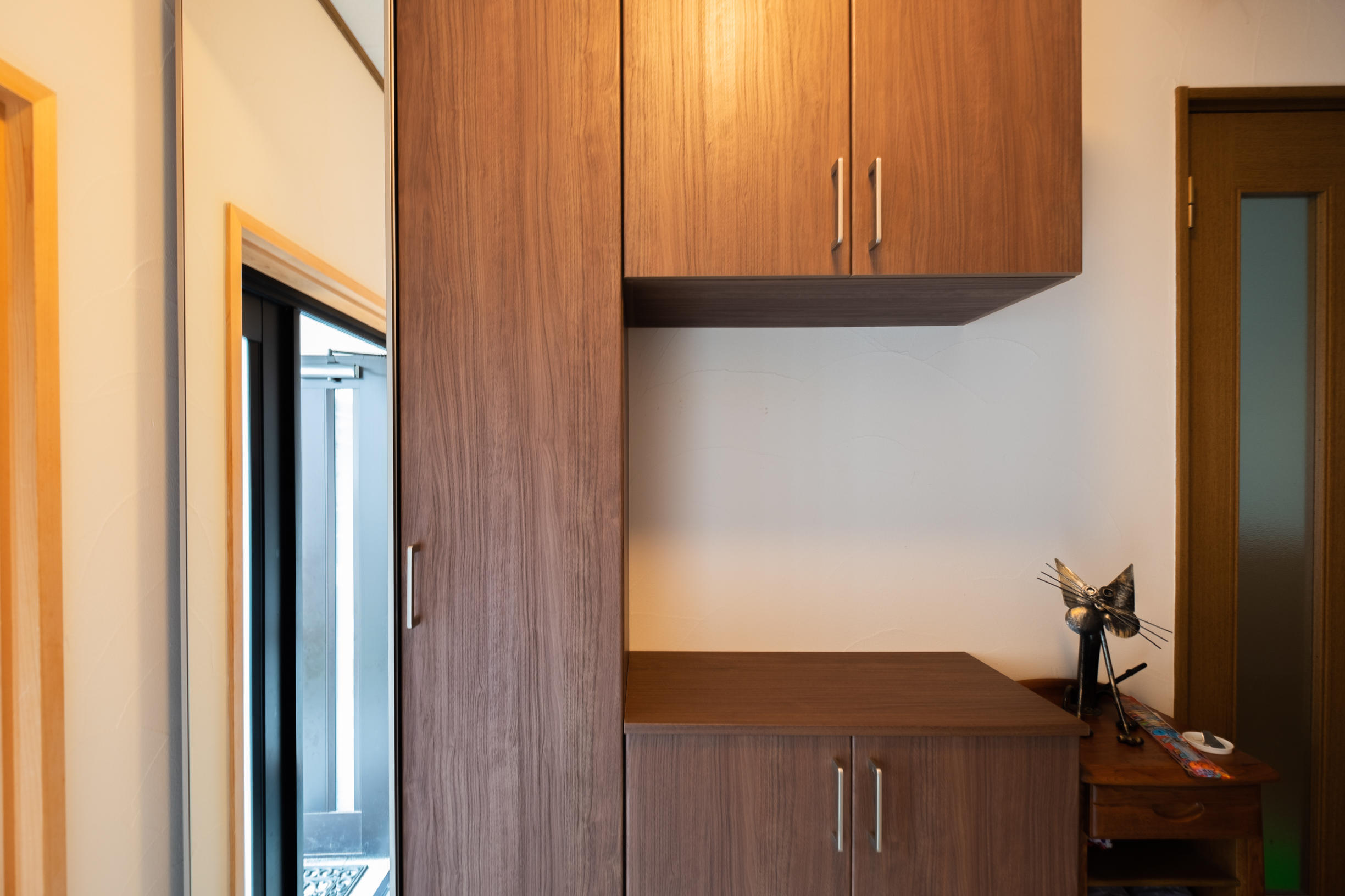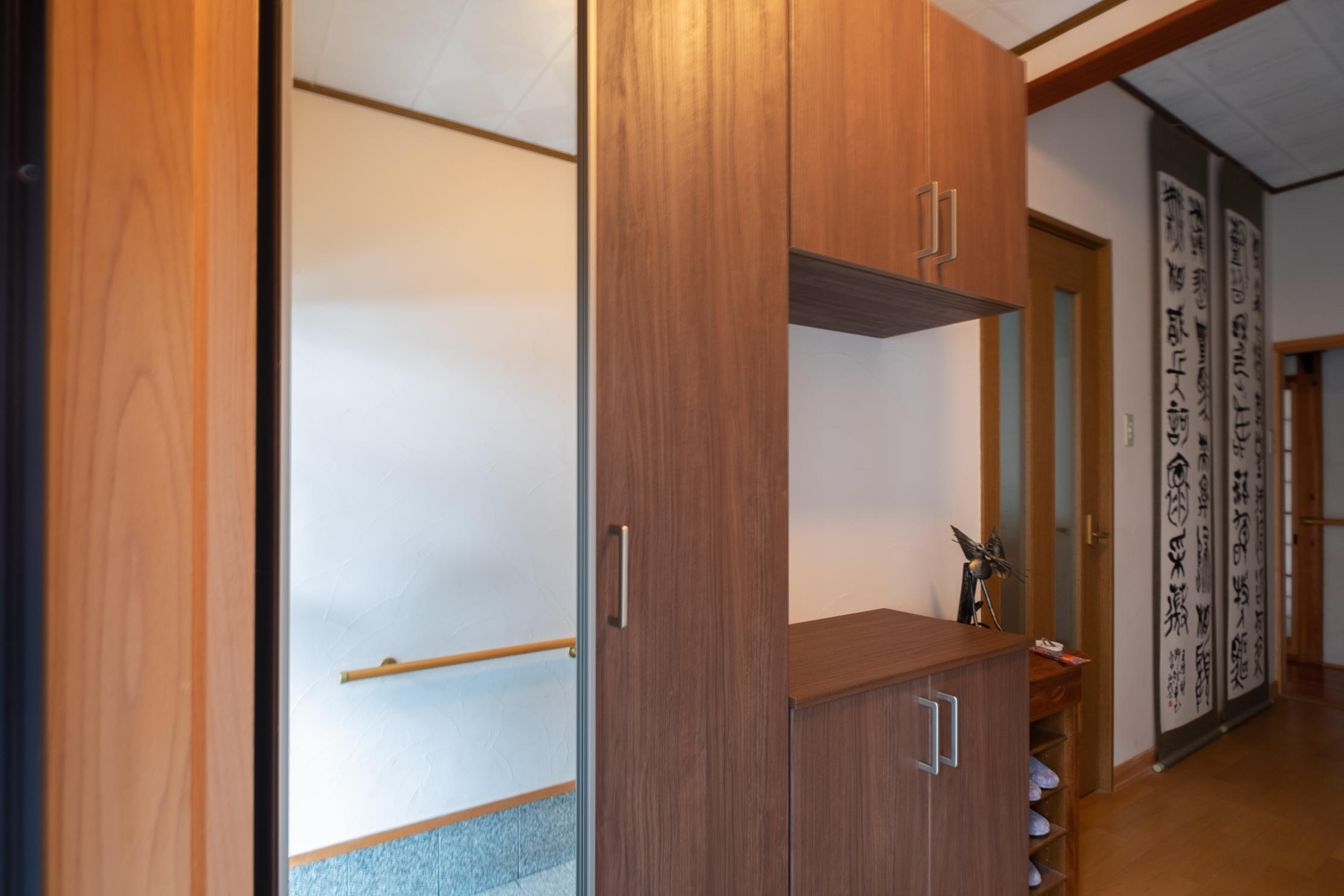 ご家族のシューズを多く収納したいというご希望で、収納量やスタイルに合わせて選べる玄関収納を1日施工のPATTOリフォームでお取付。ミラー扉仕様でお出かけ前の身だしなみをチェックできるようになりました。