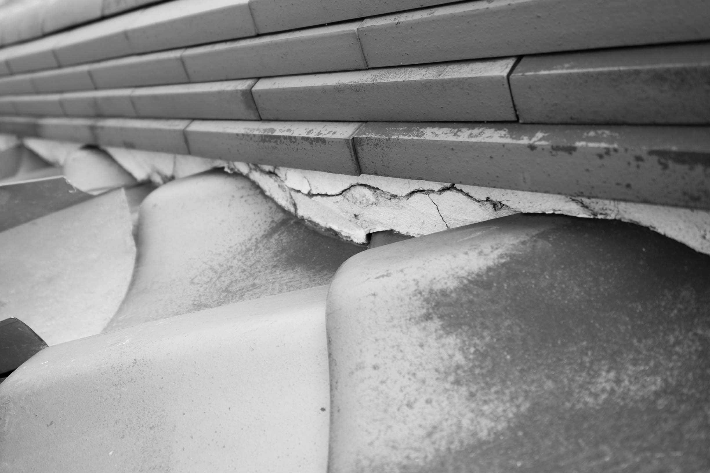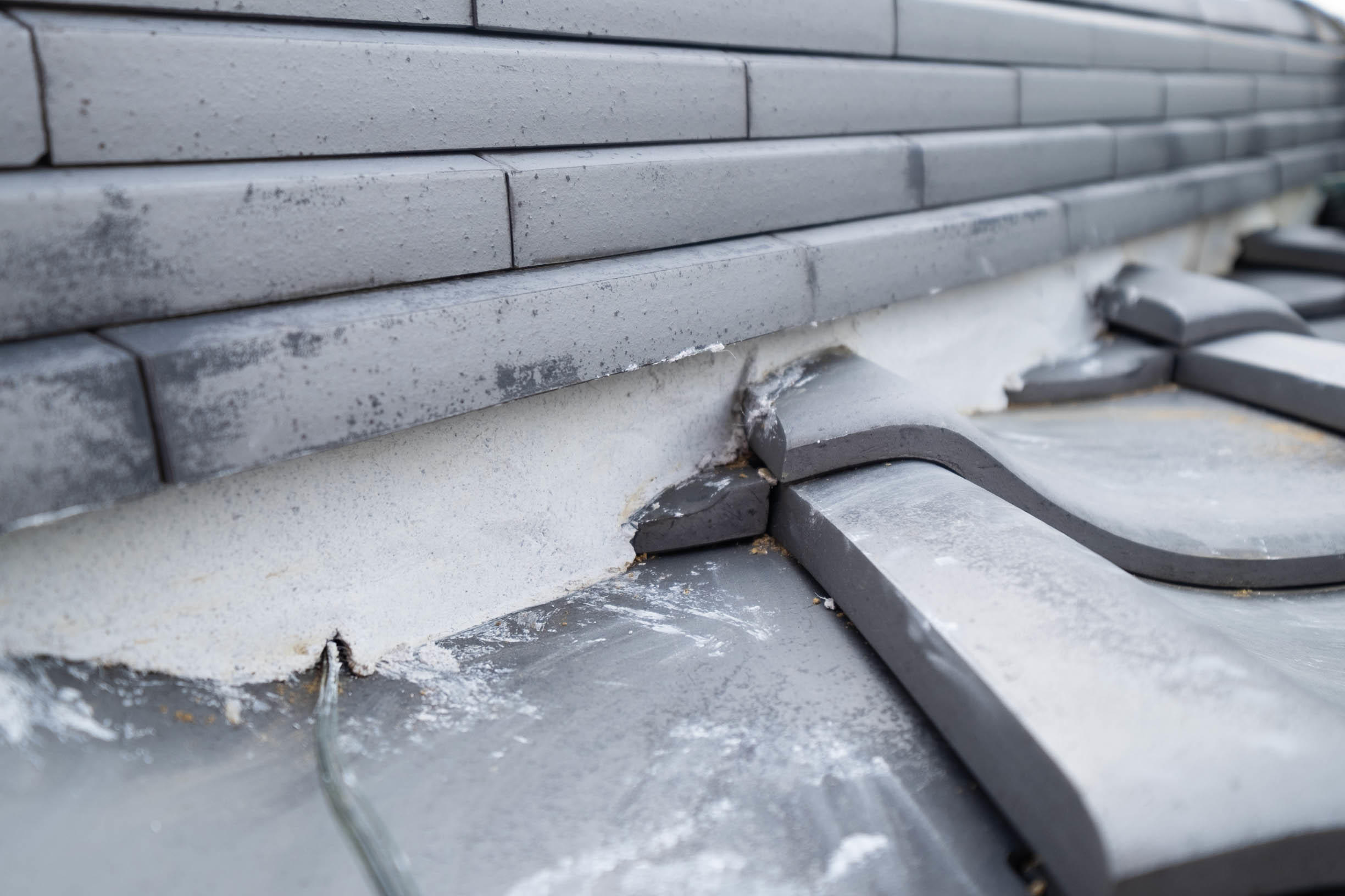 長年の雨風で傷んでいた「面戸」部分の漆喰補修。「大棟・隅棟」の「のし瓦・冠瓦」がずれて、雨水の侵入の痕跡があったため、その部分の修繕もさせて頂きました。