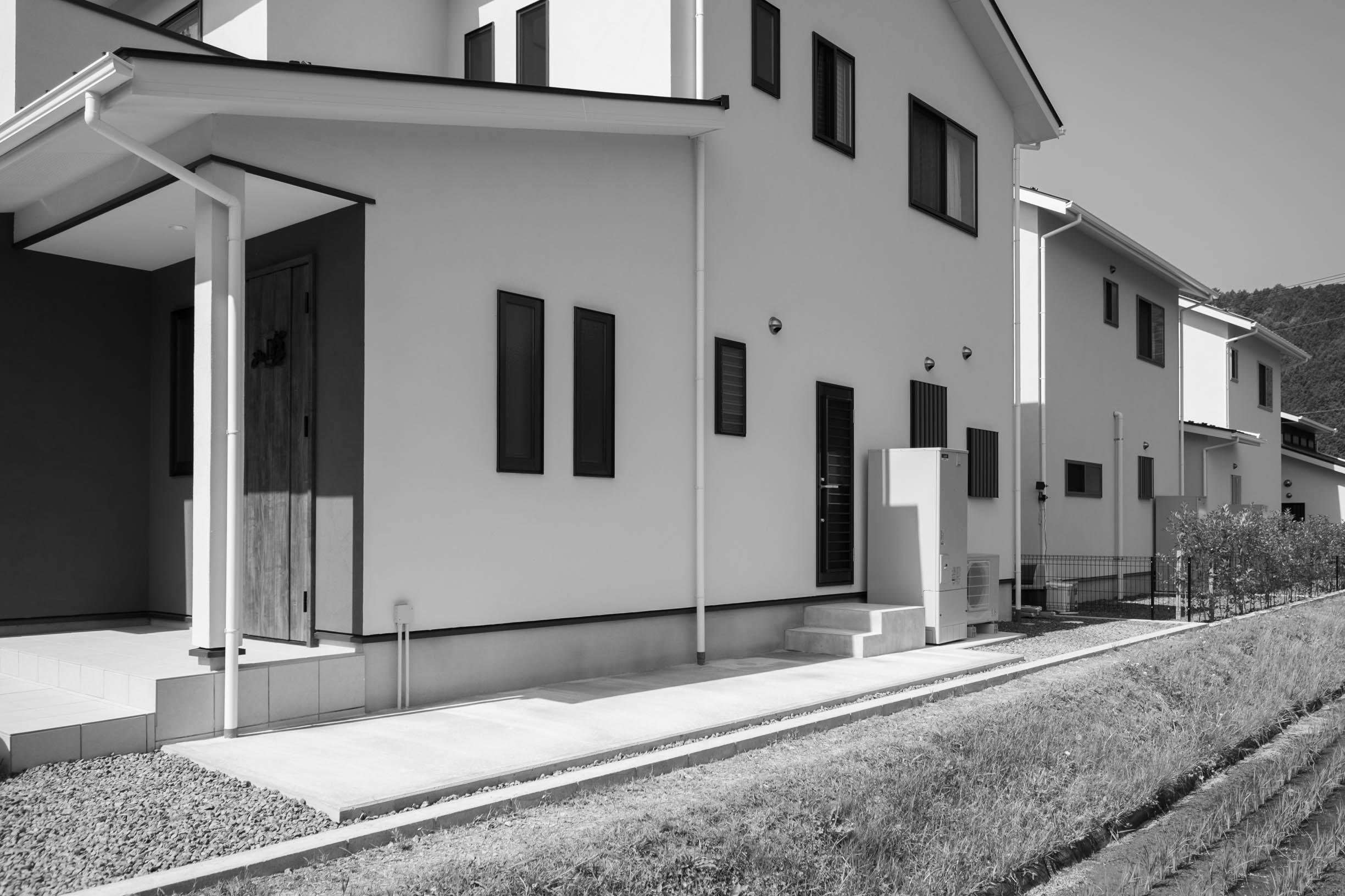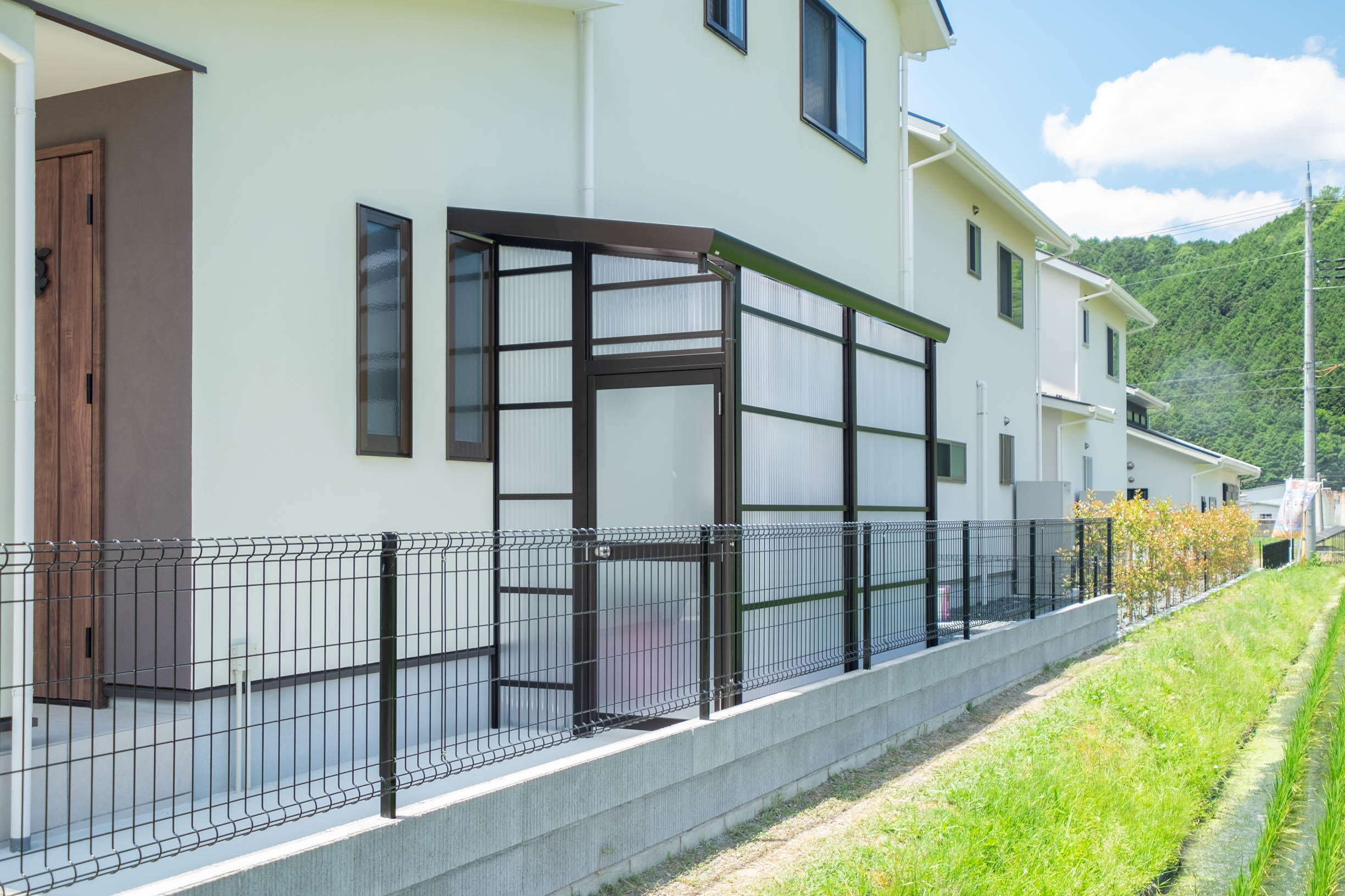三協アルミ「テラーネZ」。お家の勝手口側へ、波板テラスを設置。お隣さんとの境界線には、メッシュフェンスを取付させていただきました。