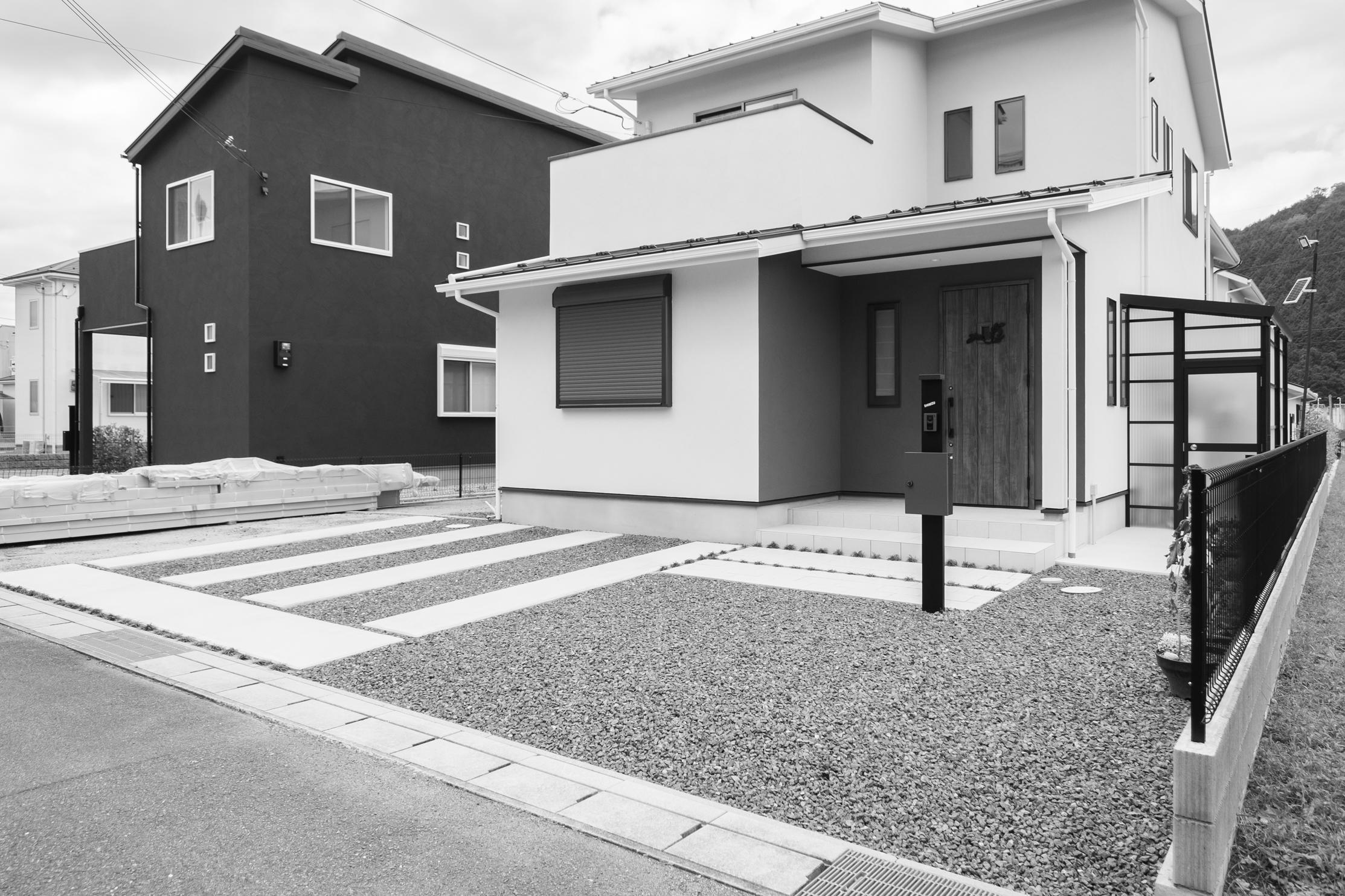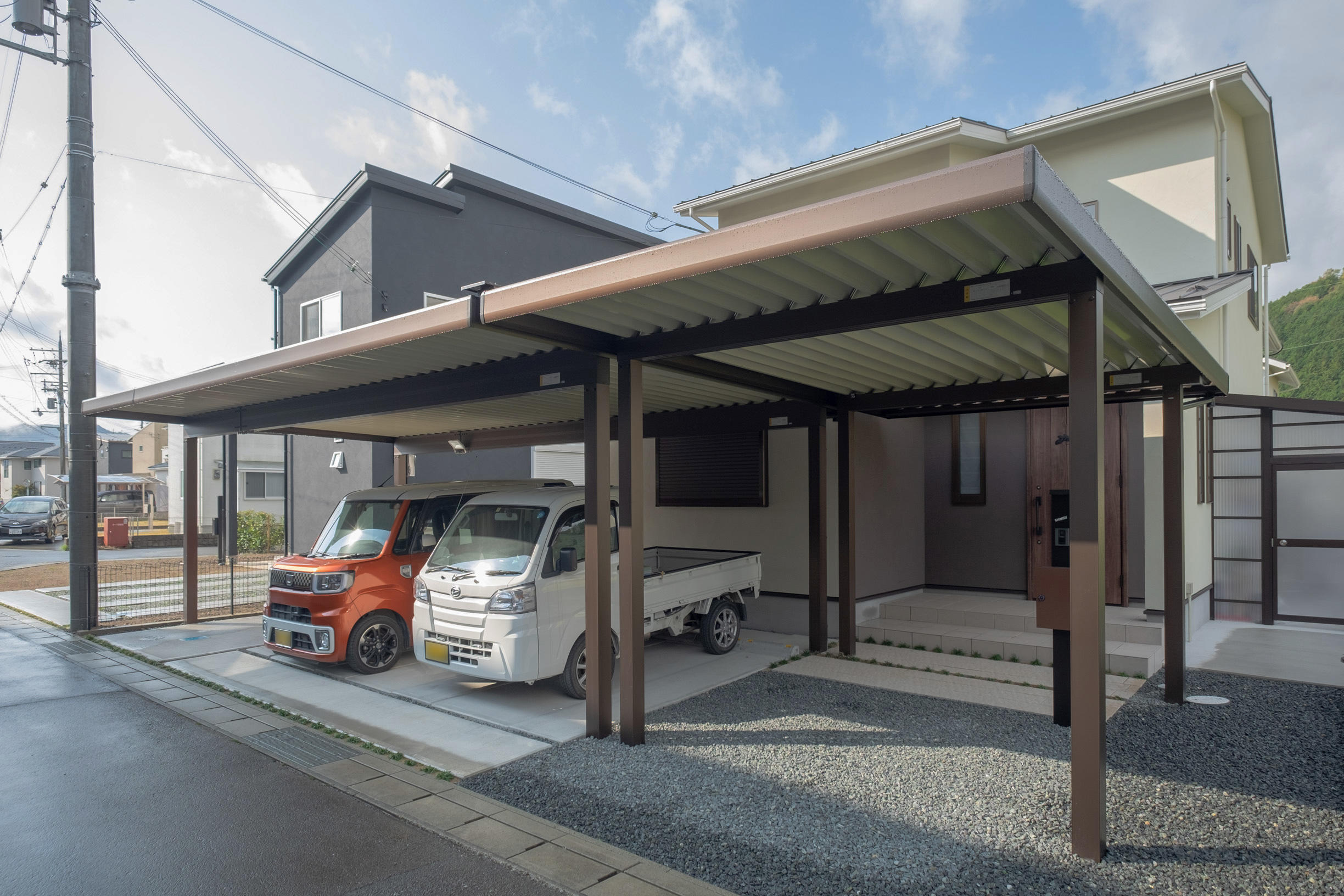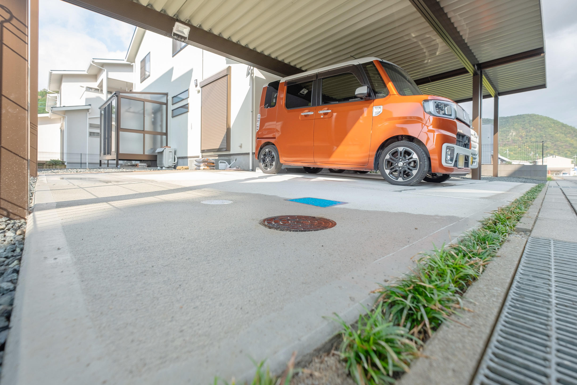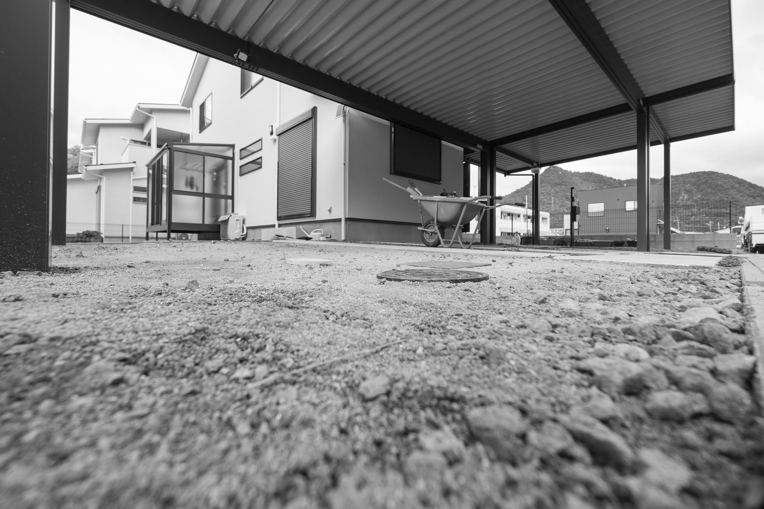 YKKap「レオンポートneo シリーズ」。台風の通り道となる地域、強い風の影響を受けやすい地域に最適なスチール折板屋根ふき材カーポート。一部の砕石部分には、新たにコンクリートの打設工事をさせて頂きました。