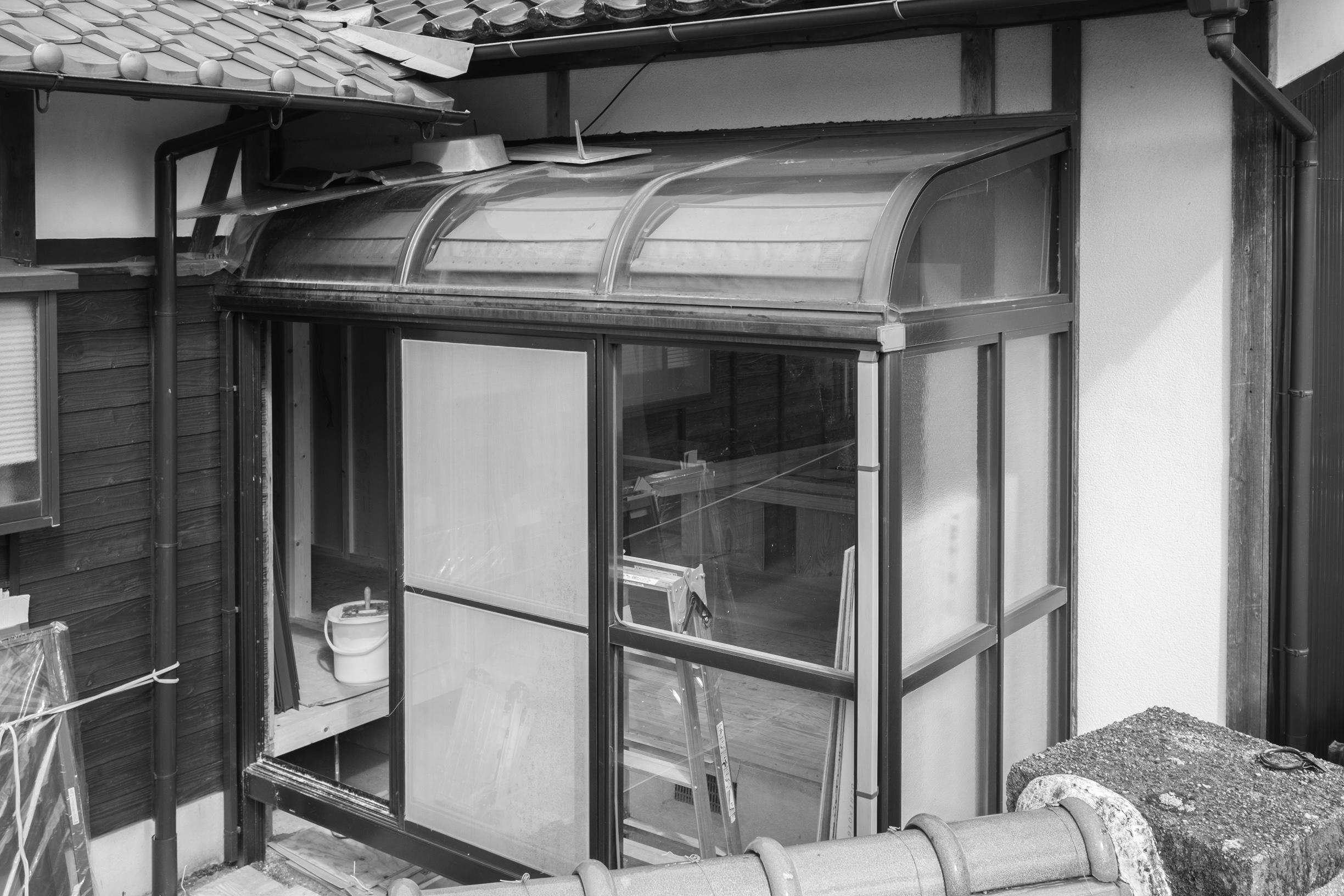 既設のテラスを解体撤去。そして、新しくシャッター付テラス窓を取付。外壁材には、焼杉板で仕上げ。