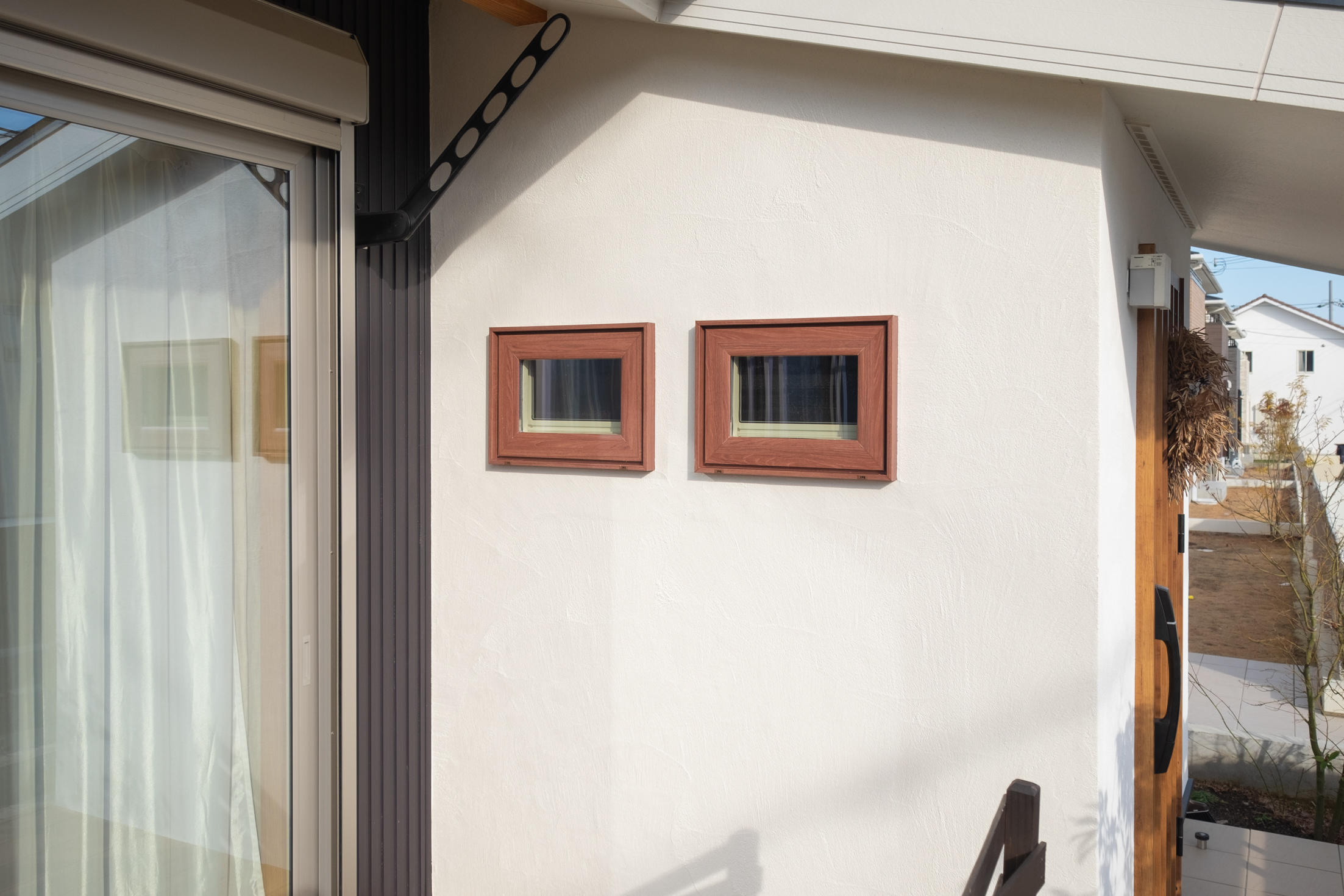 玄関に光を採りたいとう御依頼で、小窓(樹脂窓)を増設させて頂きました。外壁は、漆喰の左官仕上げ。