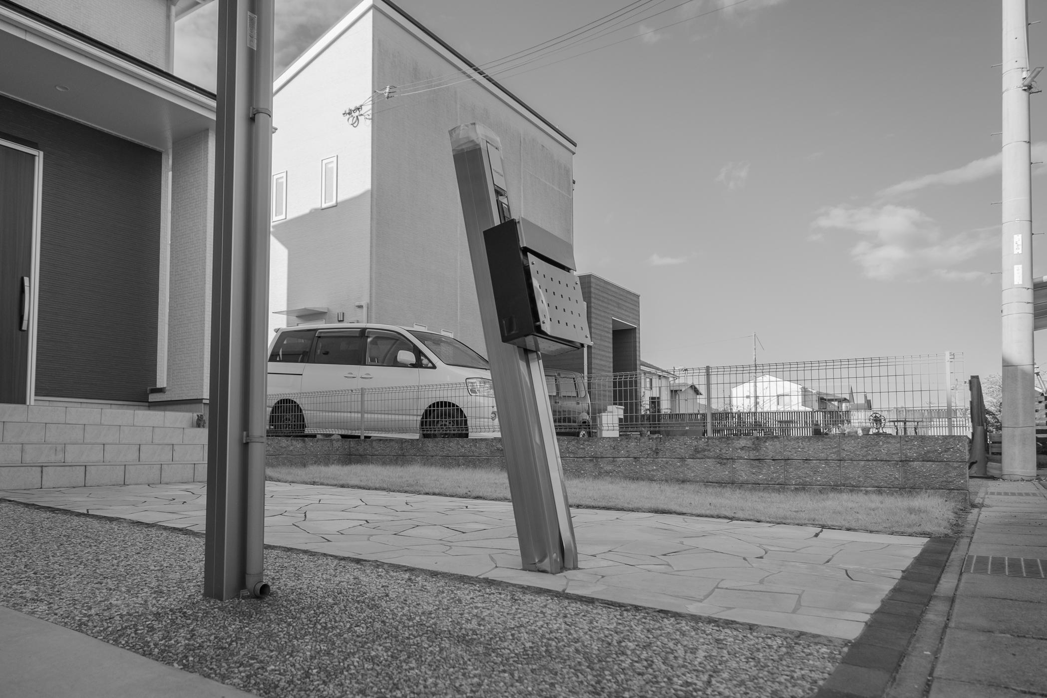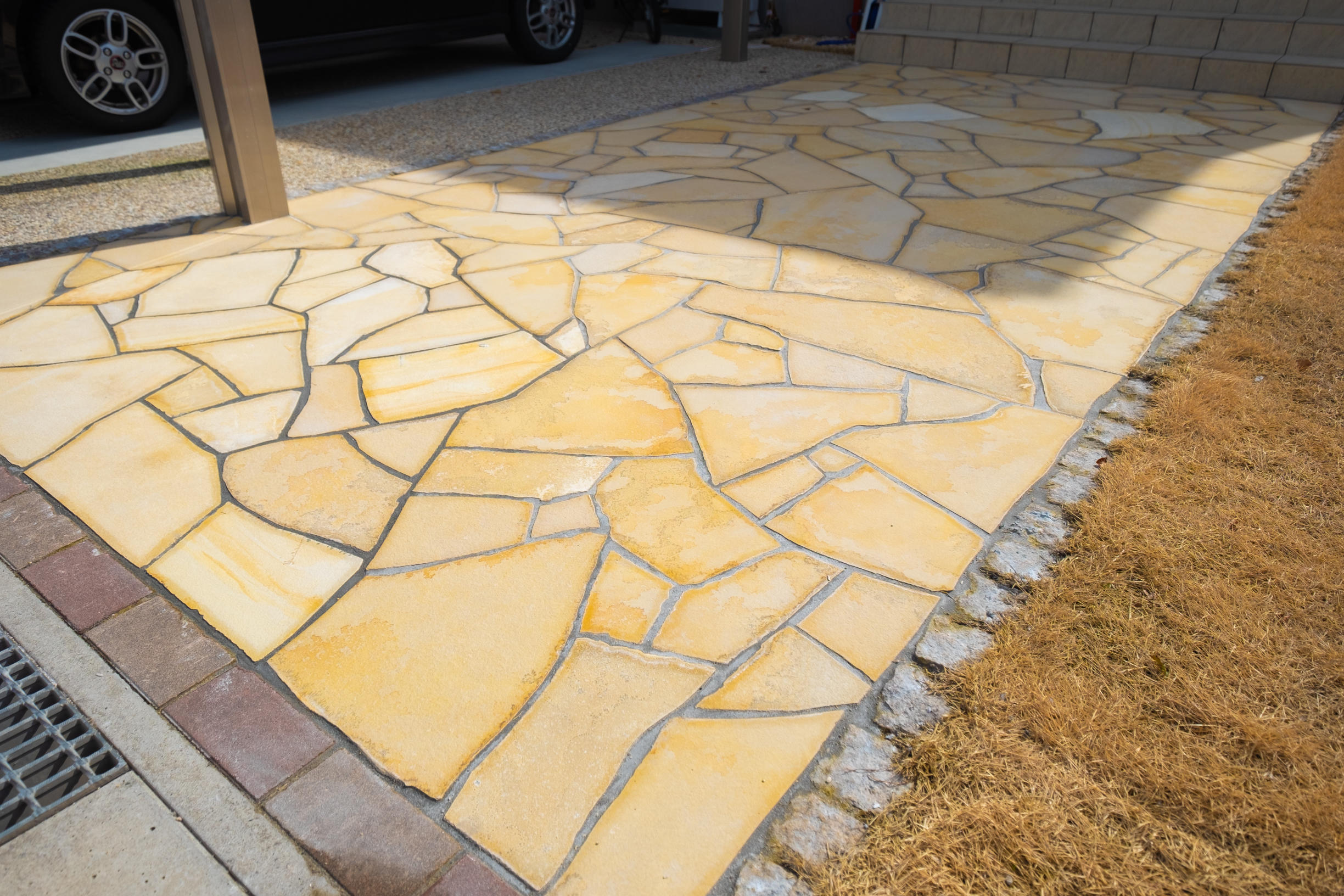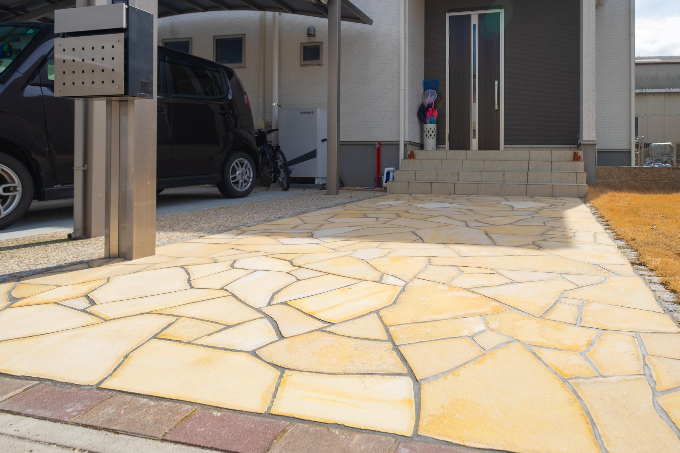 既設の門柱が事故により折れ曲がったための復旧工事。門柱の取替と玄関アプローチ部分の乱形タイルも全面張替えをさせて頂きました。