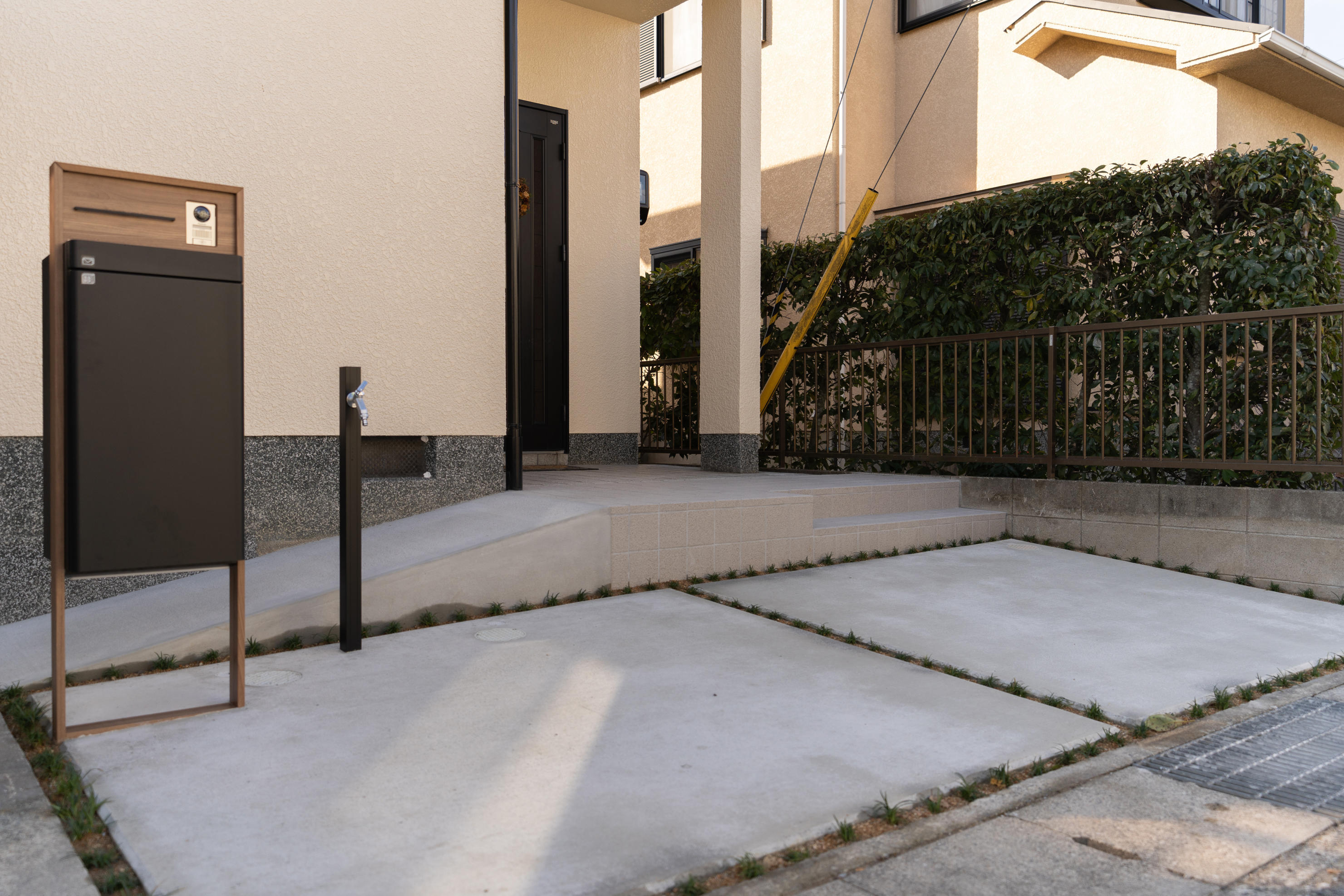 新しく駐車スペースの増設。そして、エントランス機能をひとつに。スマート宅配ポストの設置をさせて頂きました。