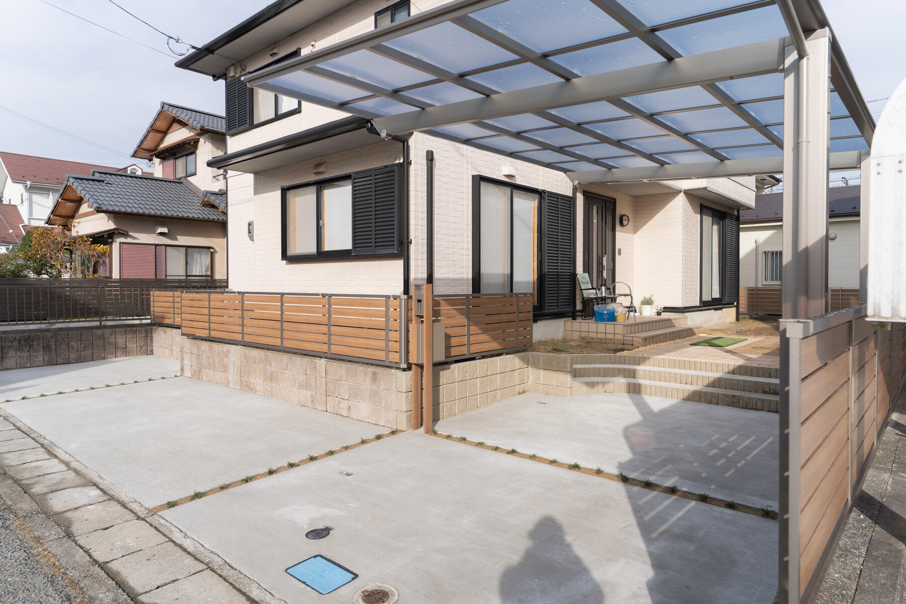 商品:LIXIL カーポート「フーゴ F 1台用」LIXIL フェンスAB「YS3型」LIXIL 機能門柱 「ファンクションユニット アクシィ2型」工事内容:カーポート設置、フェンス設置、土間コンクリート等