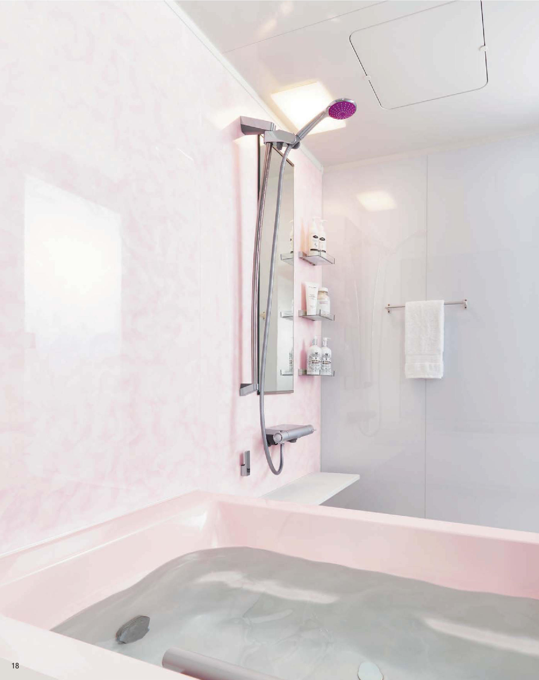さらに間取りの変更や柱位置に合わせたドア位置が選べます。100mm単位で移動でき最大400mmまで移動可能です。そして「リノビオV」のすべてのタイプで"ルフレトーン(人造大理石)浴槽"が標準装備となっています。大理石のような上品な光沢と華やかなきらめきをまとう新しい人造大理石浴槽です。