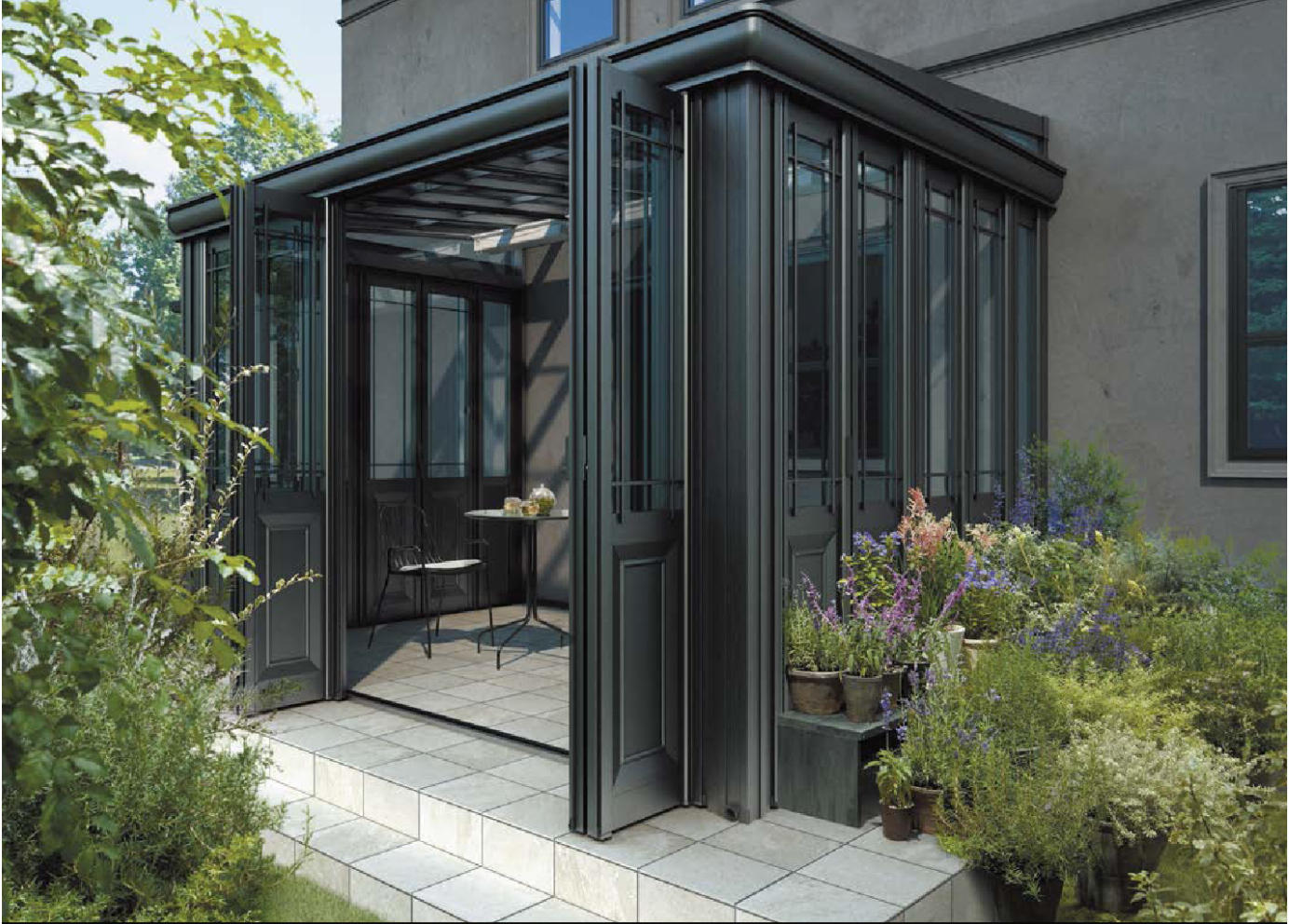 タイプとしては基本タイプと腰壁タイプの2タイプをご用意。まず基本タイプは前面・左右側面がすべて折戸パネルで構成。それぞれの面ごとにパネルを自由に開閉できます。全開にすれば開放感を味わえます。