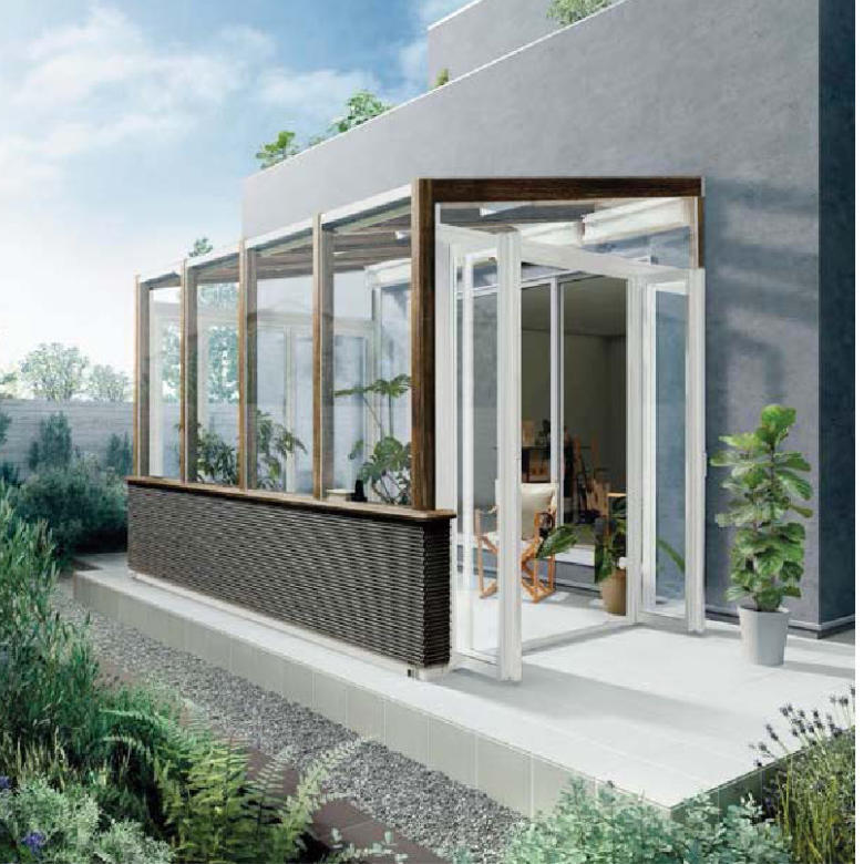 「ココマ」には様々なタイプをご用意しています。屋根、前面フィックス、側面折戸パネルに囲まれた、リビングとしても利用できる「ガーデンルームタイプ」。屋根、前面フィックスのみで両サイドがあいた開放感を満喫できる「サイドスルータイプ」。屋根を前柱で支えただけのシンプル構造。庭先のテラスなどに最適な「オープンテラスタイプ」。さらにどのタイプに併用できる「腰壁タイプ」もご用意。腰高の壁により囲まれる安心感を演出します。