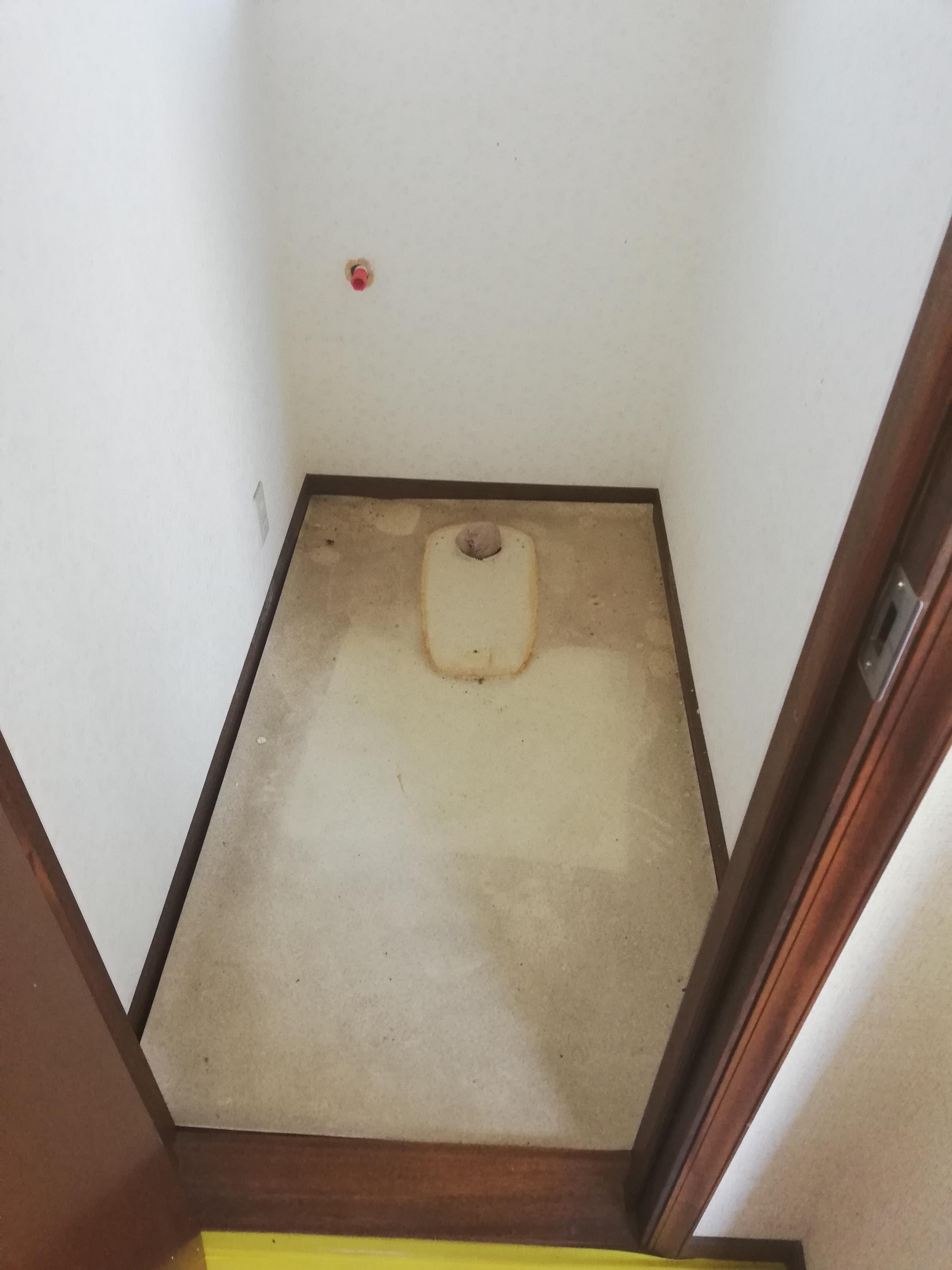 今回はトイレの解体状況を載せます。トイレ改装は天井・壁のクロス張り替え、床はCF(クッションフロア)張り替え、便器交換になります。