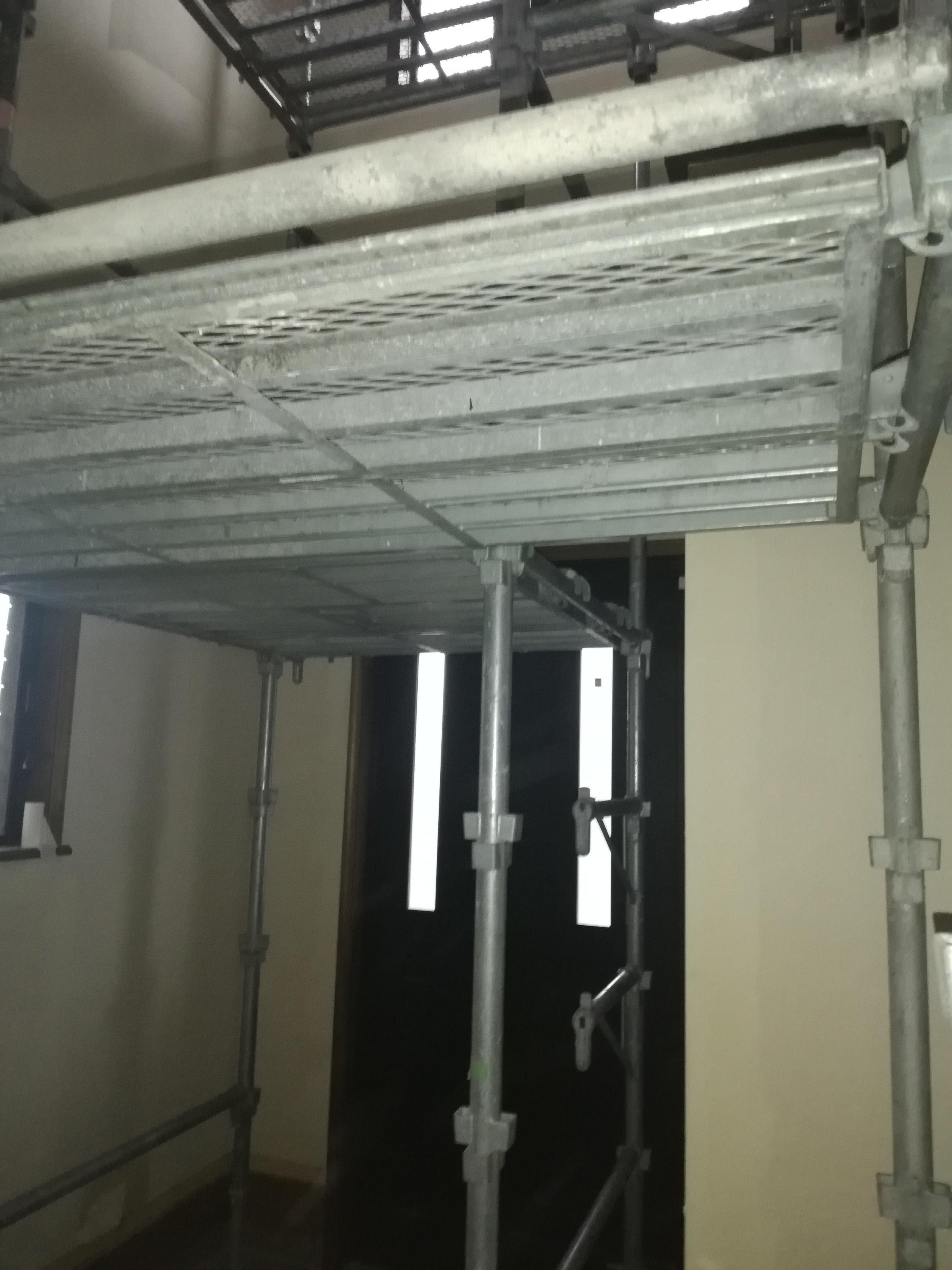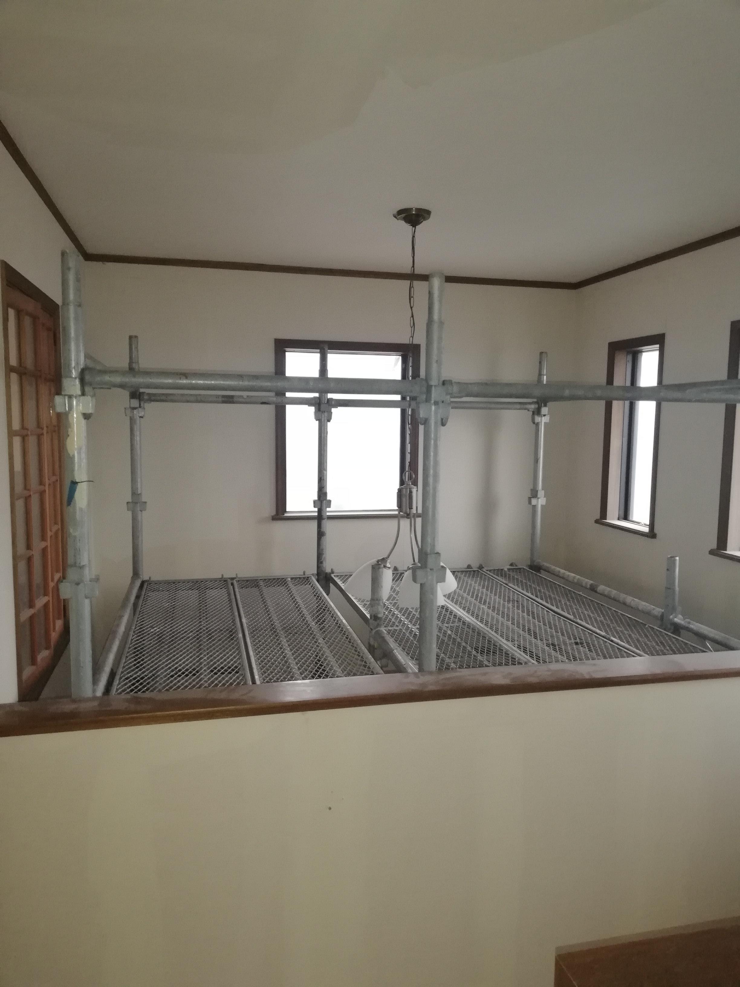 玄関エントランスに足場を組み吹き抜け部分を張っていきます。