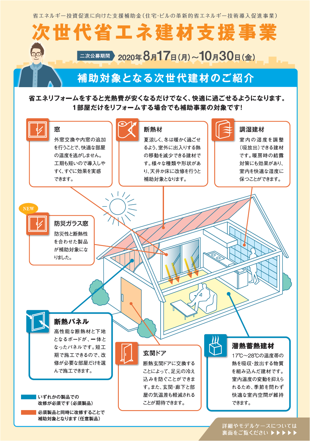 次世代省エネ建材支援事業とは既存住宅の改修工事を対象に省エネルギー化を図るため、一定の省エネルギー性能をゆうする高性能建材や潜熱蓄熱建材、防災ガラス窓等を短工期で住みながら導入可能な事業を支援し、市場の拡大と価格低減による次世代省エネ建材の自立的な普及拡大を図る。