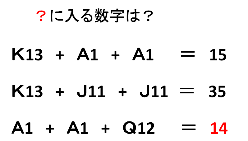 A→エース→1、J→ジャック→11、Q→クイーン→12、K→キング→13