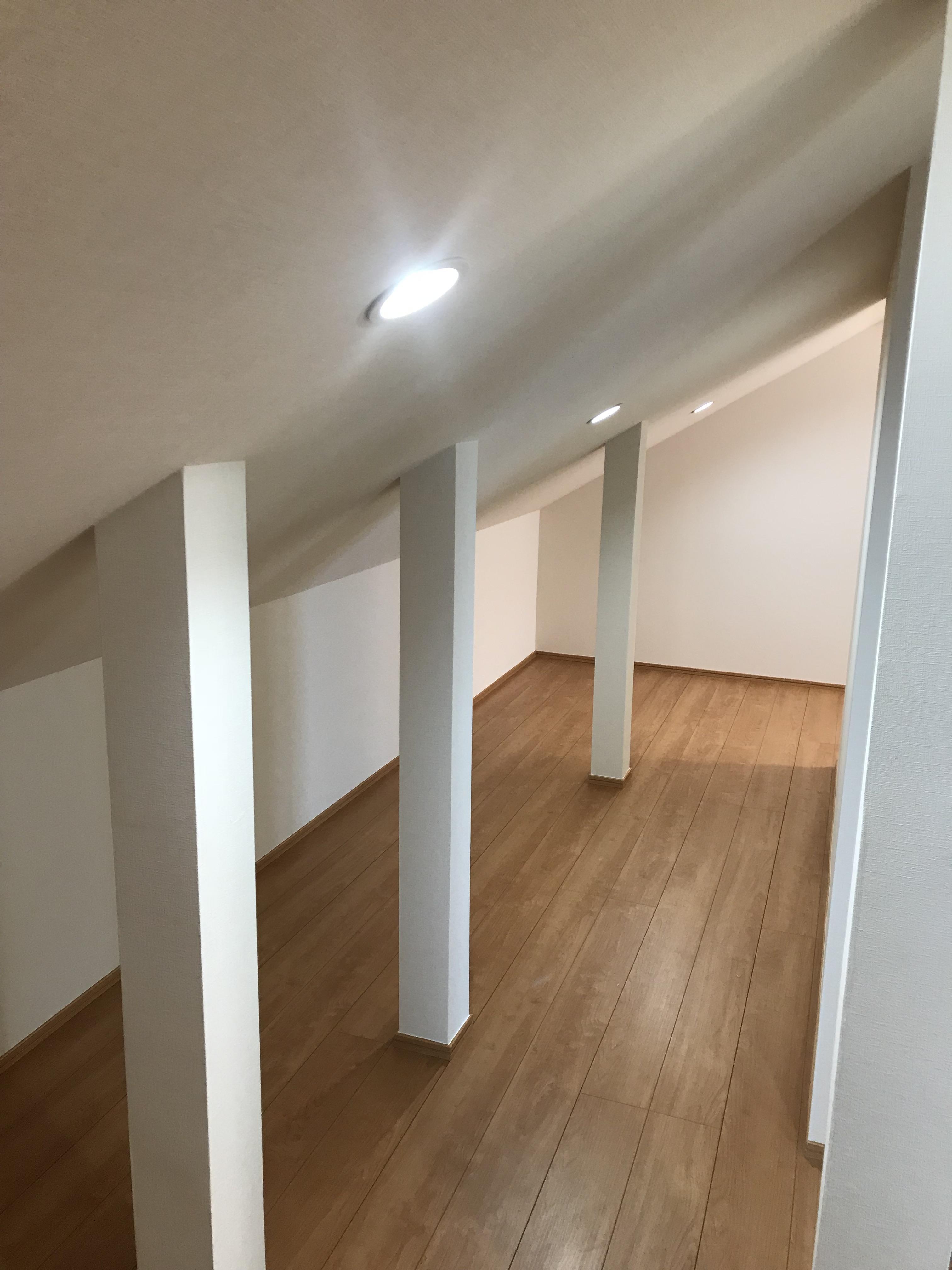 以前、当社でトイレリフォームをしていただいたお客様より、収納を増やしたいと要望があり、打ち合わせを重ねて屋根裏スペースに新たなお部屋を誕生させました。二階の子ども部屋を占拠していた本棚や息子さんが帰ったときにちょっとした寝室として使われるそうです。