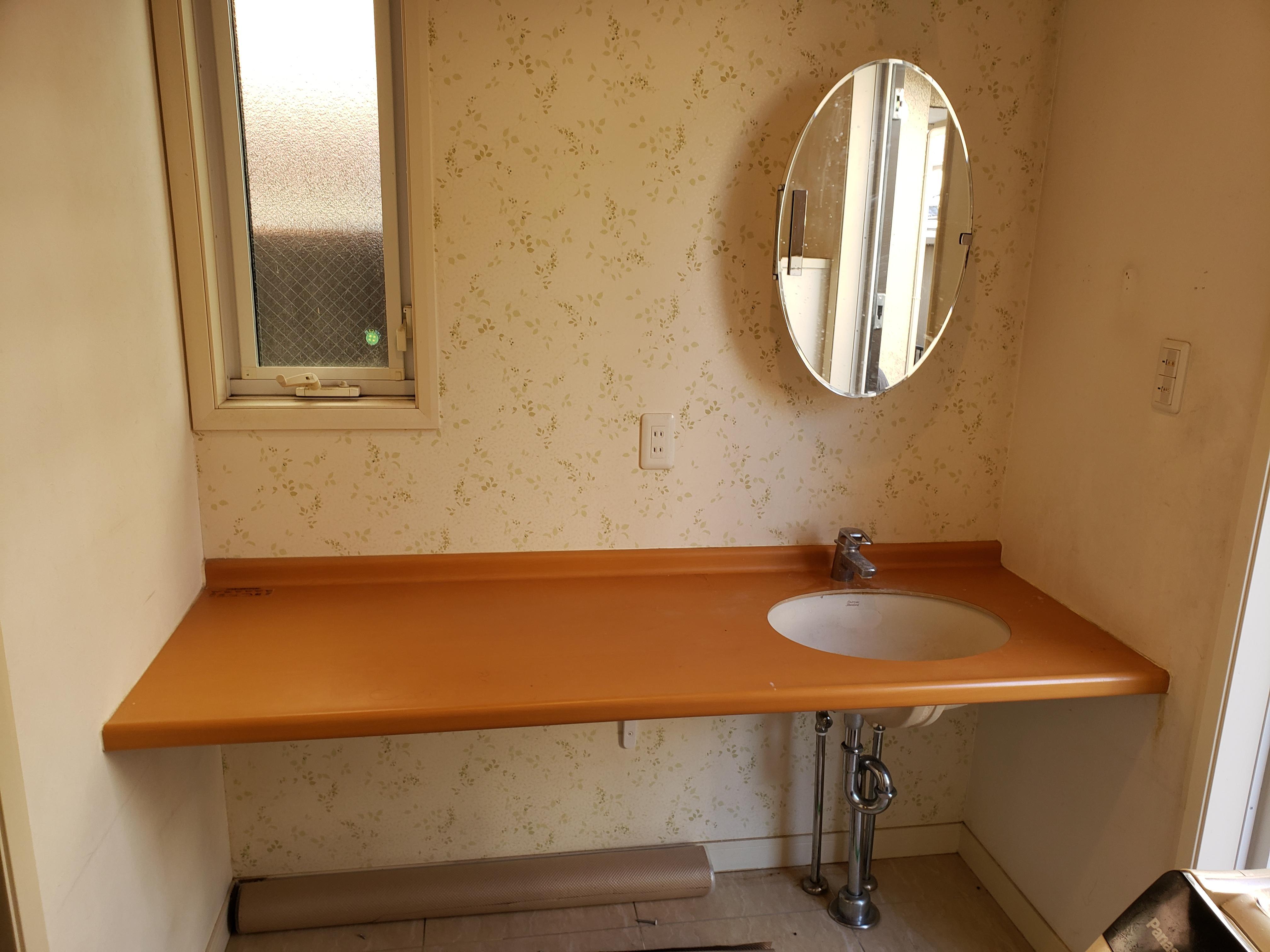 今回は洗面化粧台「ピアラ」の取替工事になります。 以前の洗面ボウルが破損しておりカウンターを取り除き、お客様お気に入りの収納棚を設置したいとのことでした。 脱衣室のクロスを張り替え、シンプルでおしゃれな空間になりました。