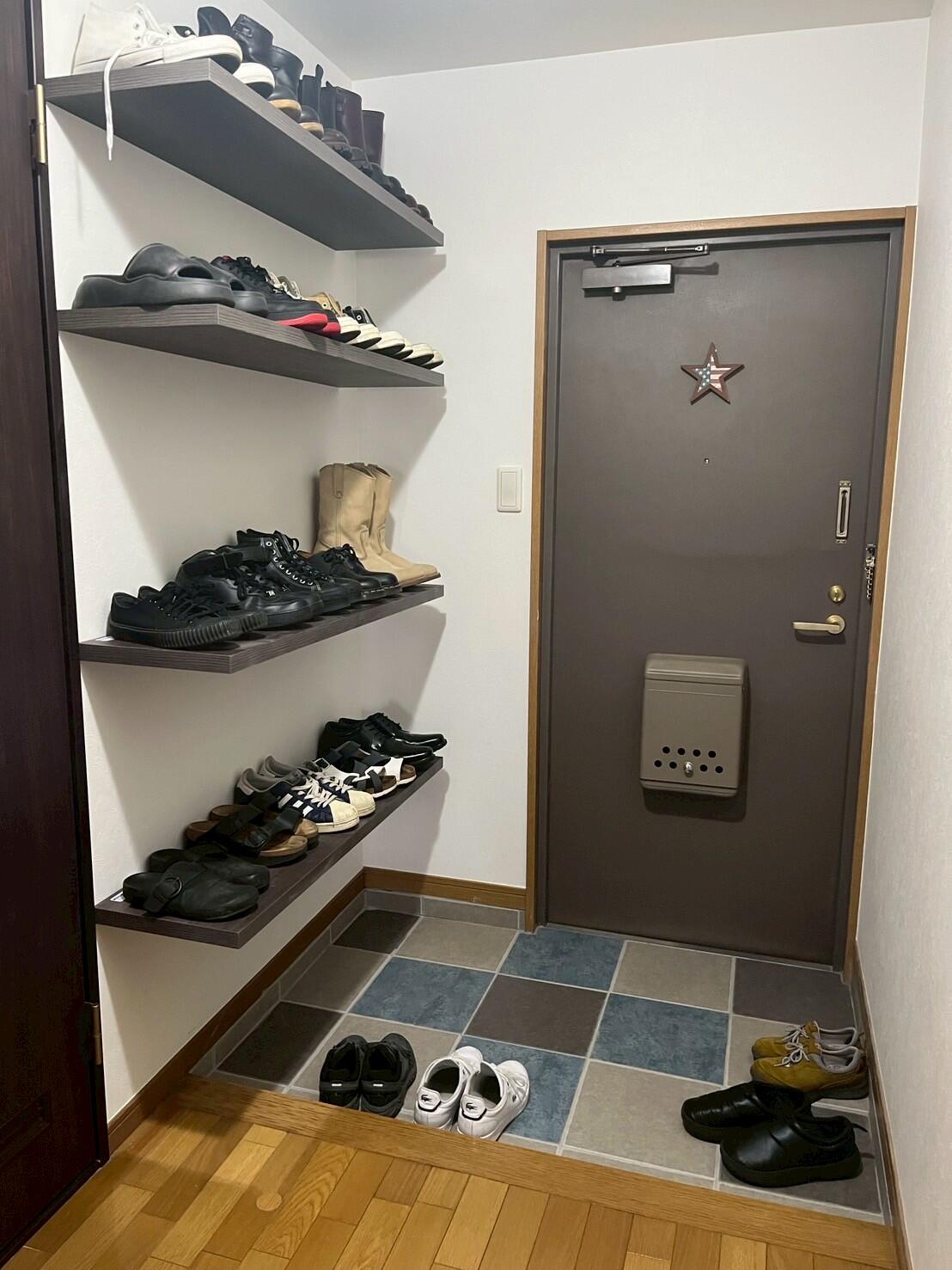 玄関収納は元々あった靴箱を撤去し、ヴィータスで棚を設置し見える収納にしたことで空間を広く使えるようになりました。