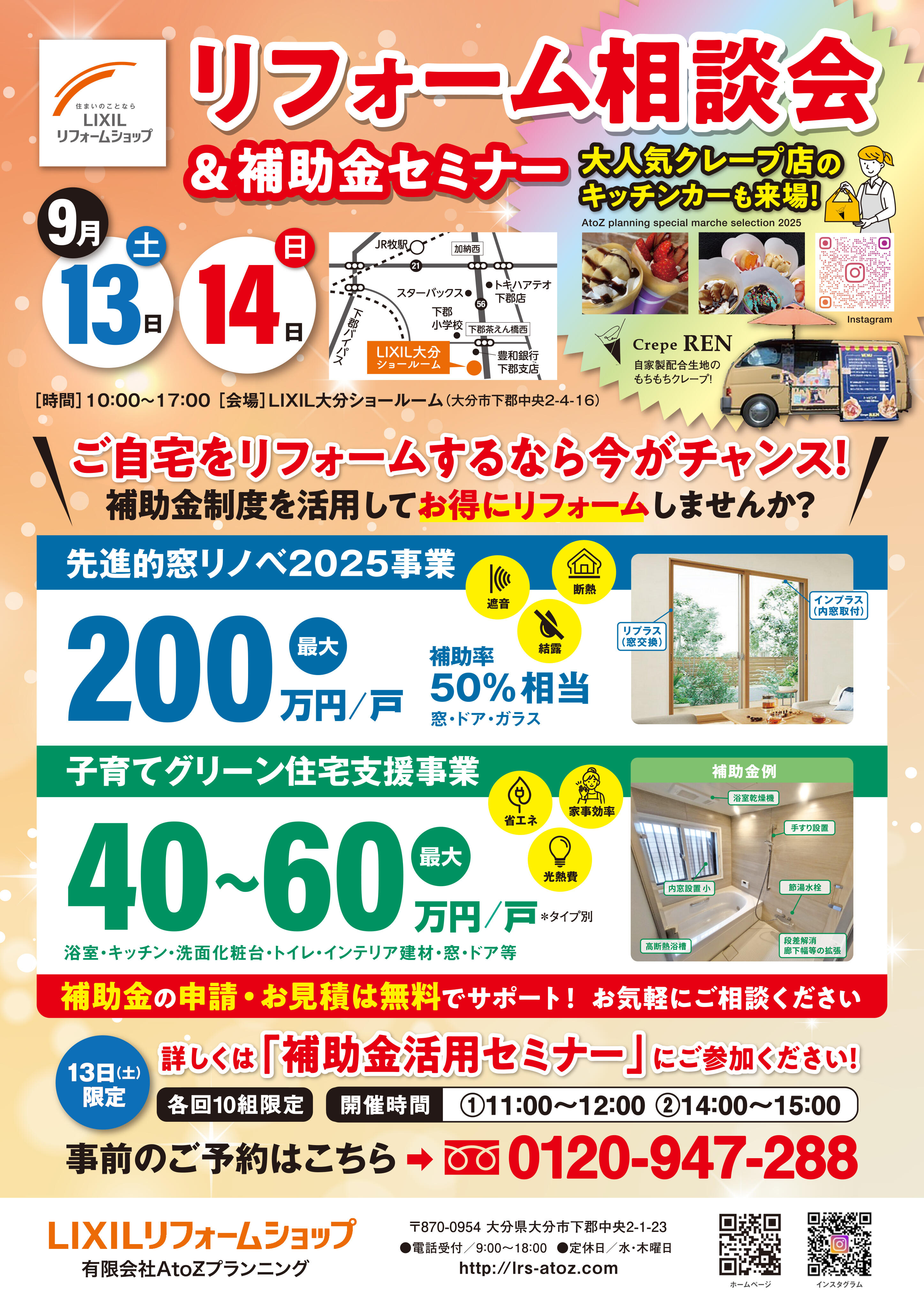 9/13(土)は毎回好評の『住宅省エネ2025キャンペーン』についての補助金セミナーを行います。