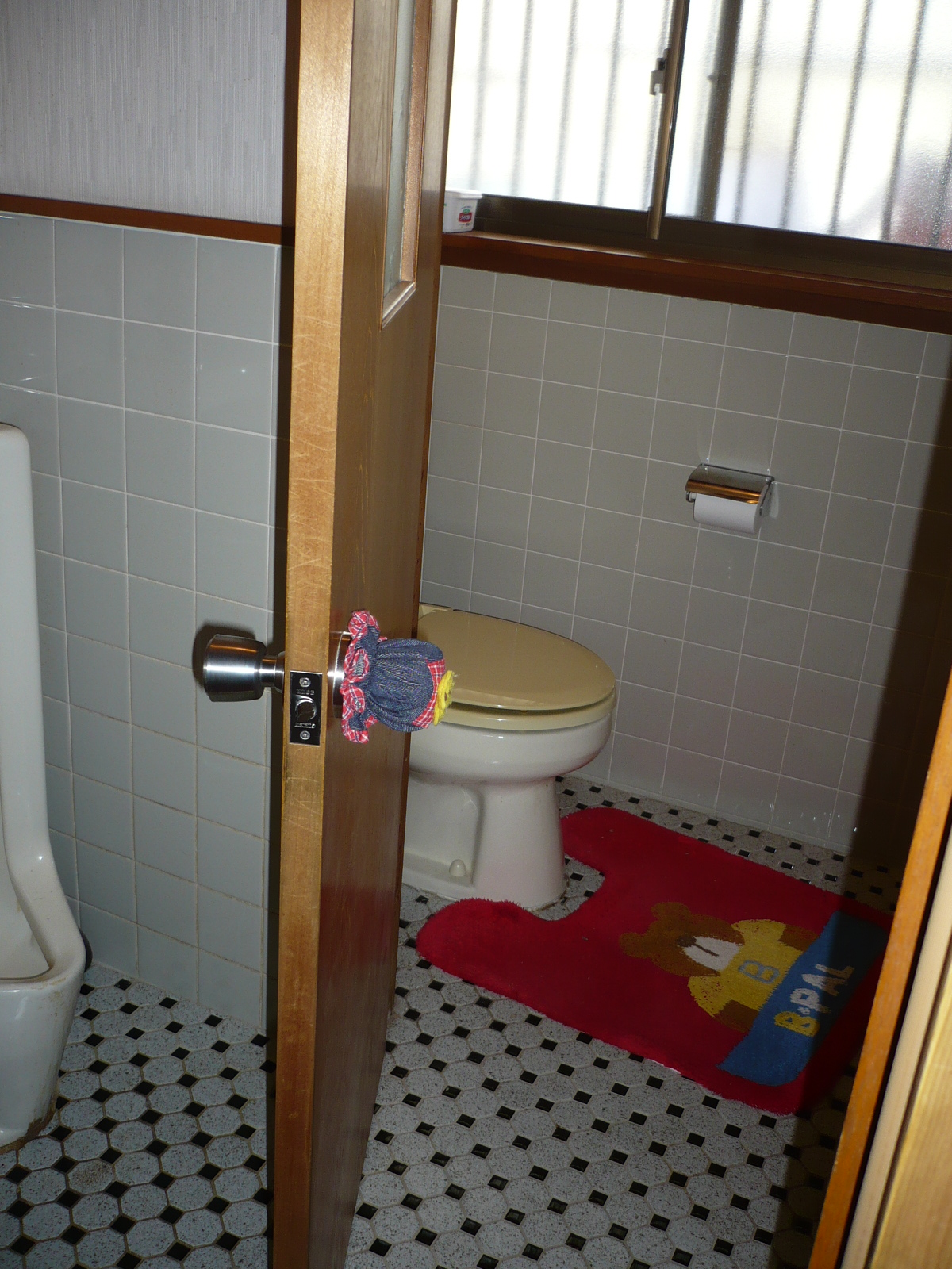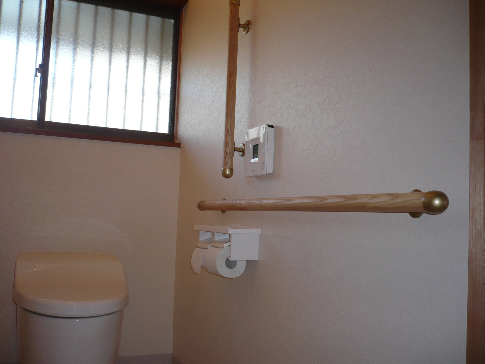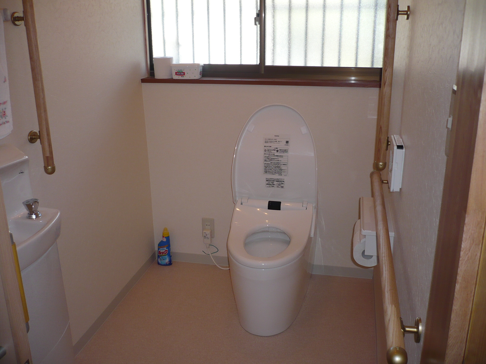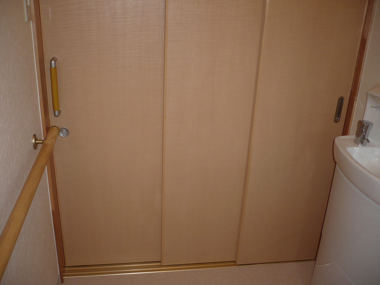 2室に分かれたトイレを撤去し、大きな空間にしました。入口も大きく開口できる扉に替え、将来の車イスでの使用も可能になりました。