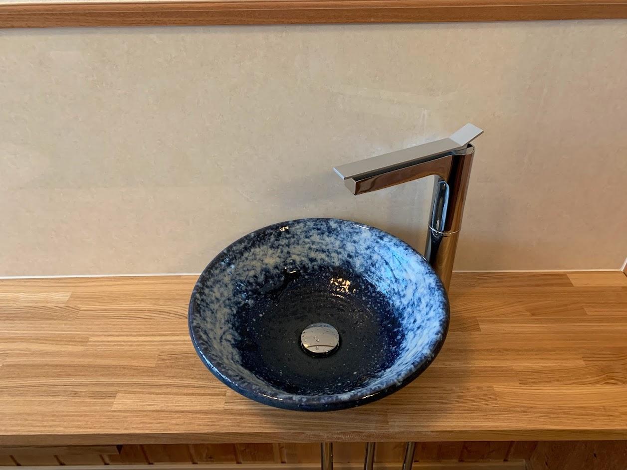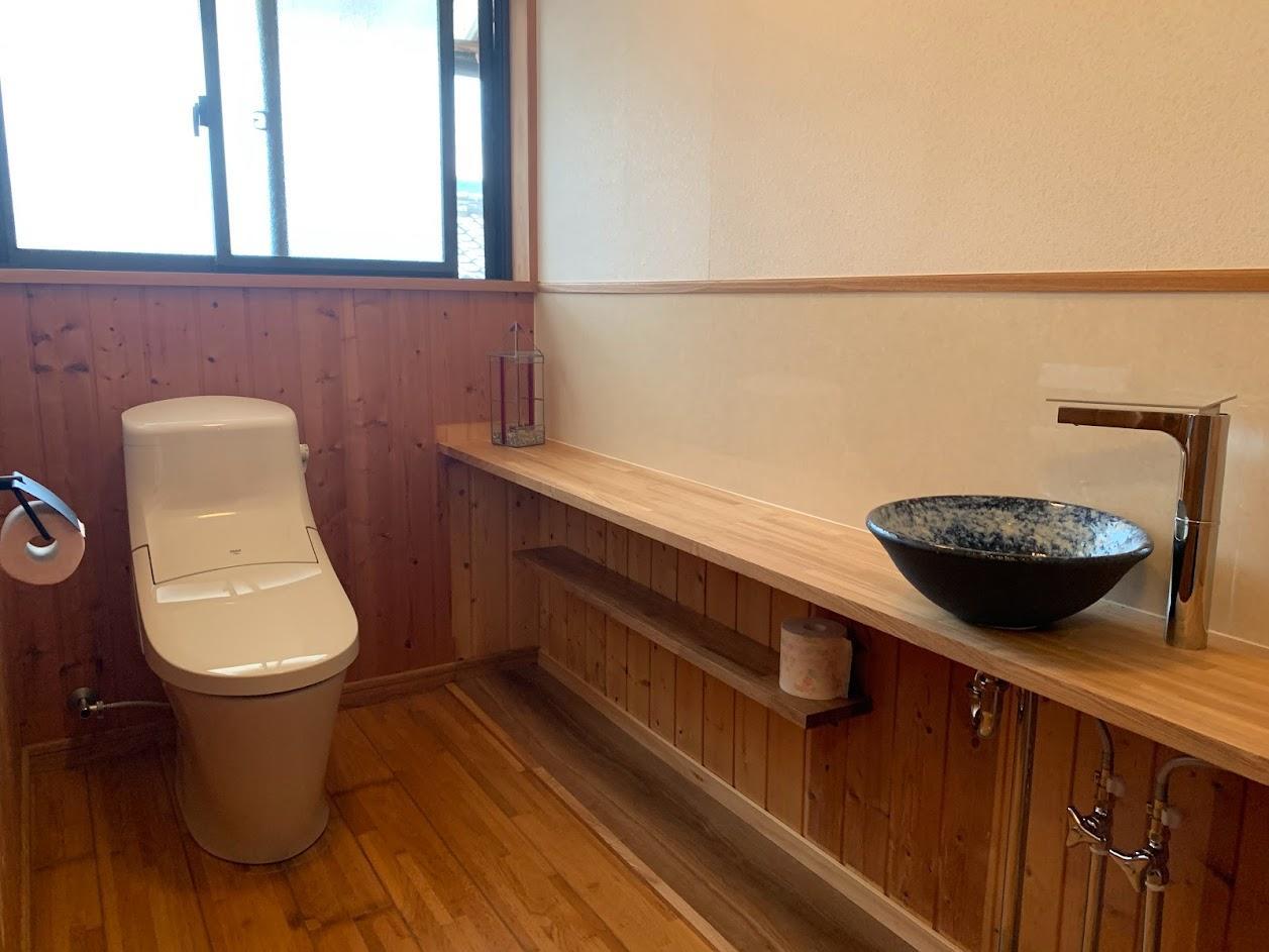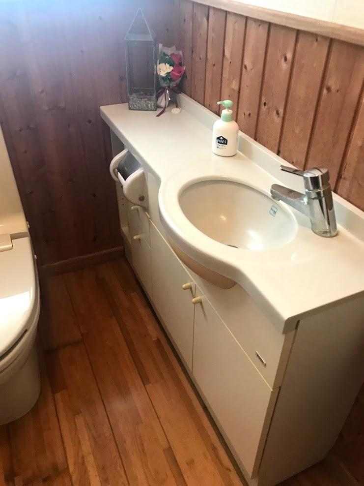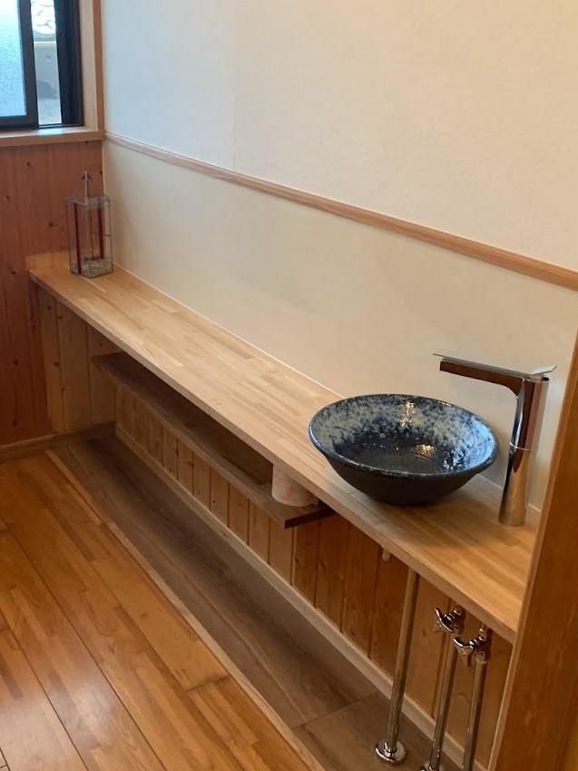 既存のカウンターと小便器を撤去して、既存の腰壁等は極力使用して新設の棚をつくり手洗いボールを設置いたしました。お客様と手洗いボールの景色をどこにするか一緒に悩んだり、とても素敵なトイレ空間が出来上がりました!メーカーさんの既製品のカウンターも素敵ですが、大工さんが一から造るカウンターも使いやすく、ご自分のお好きなデザインにできますよ!