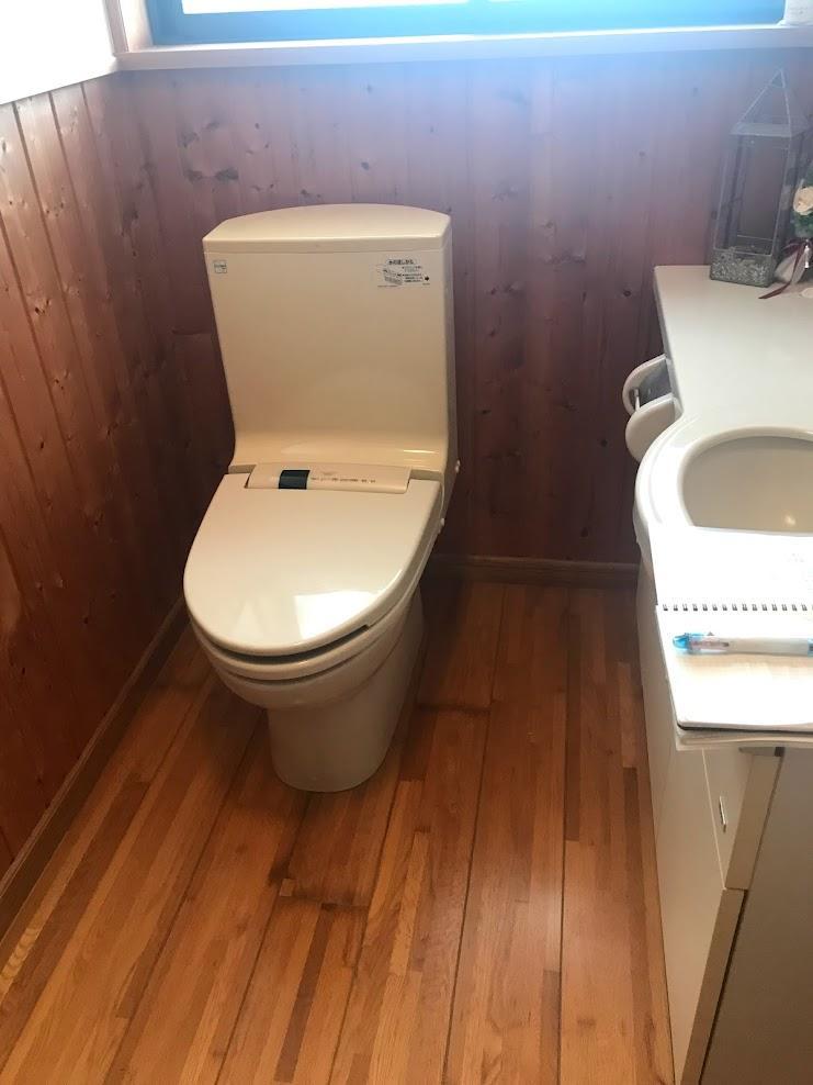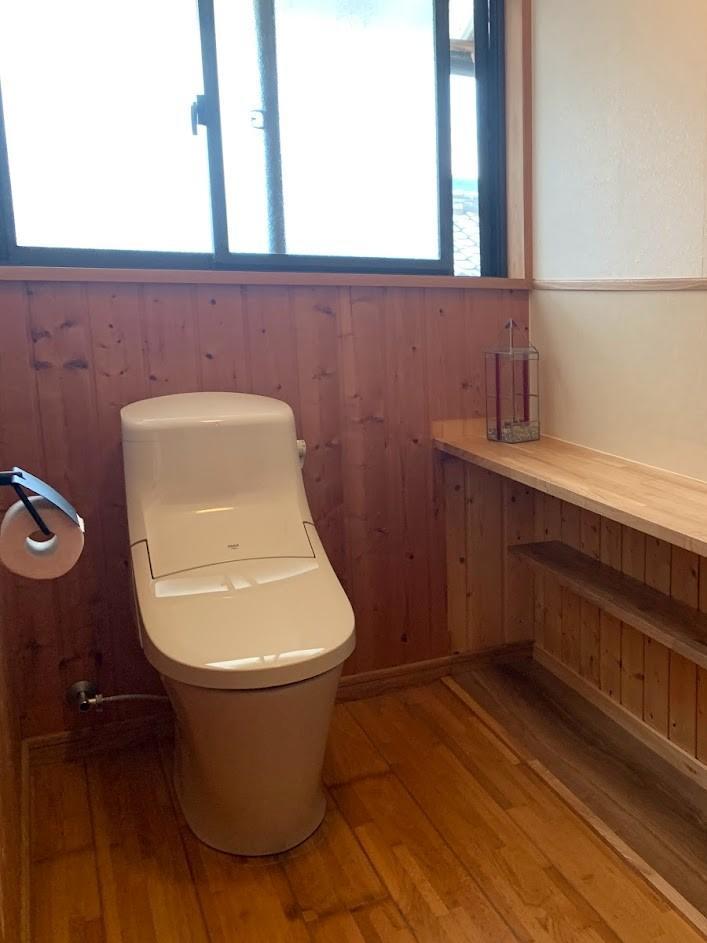 【お客様のご要望】 ゆったり使えるトイレにしたい。トイレットペーパーが2本置ける棚も。既存の腰壁などは使用したい。