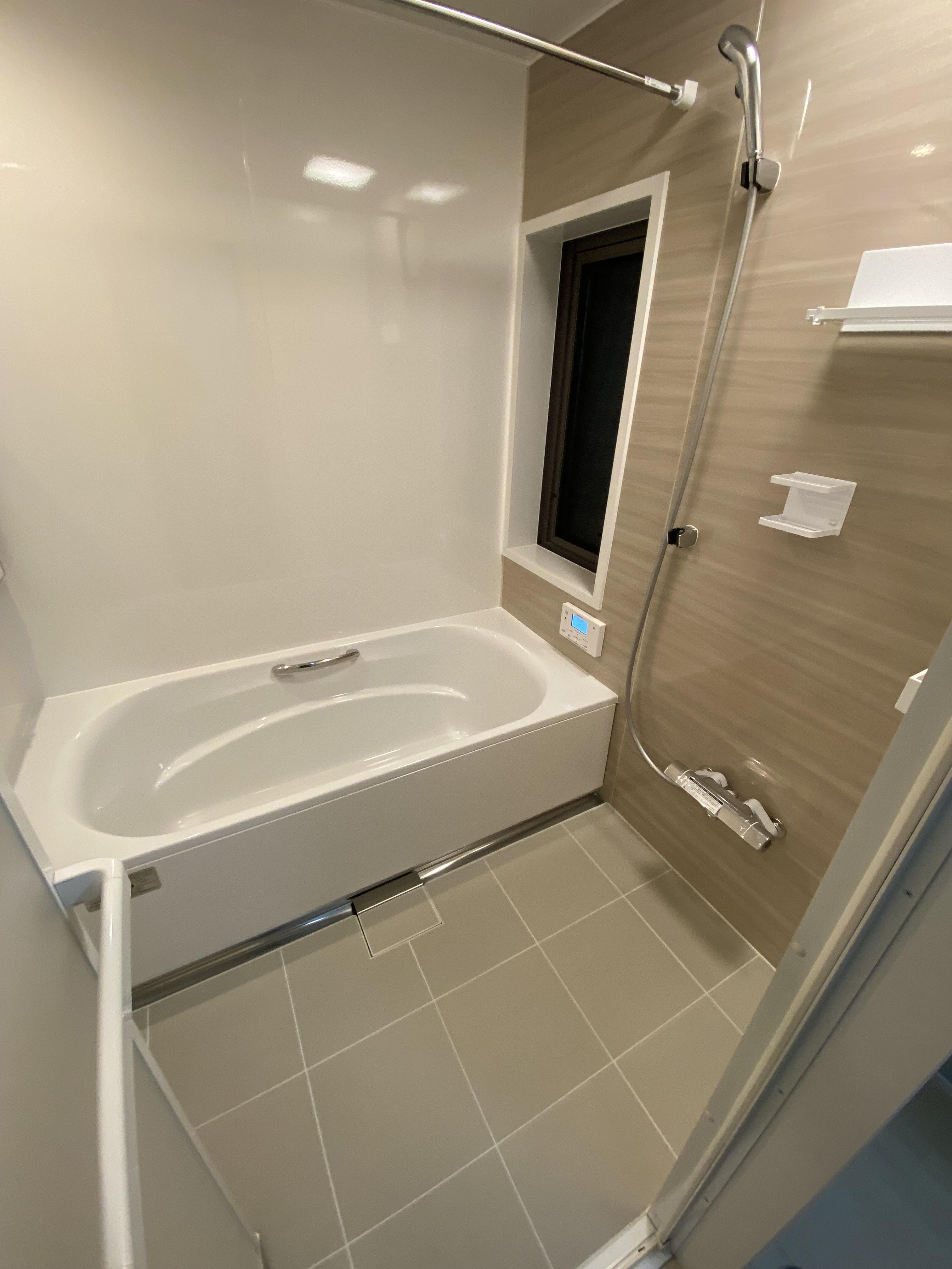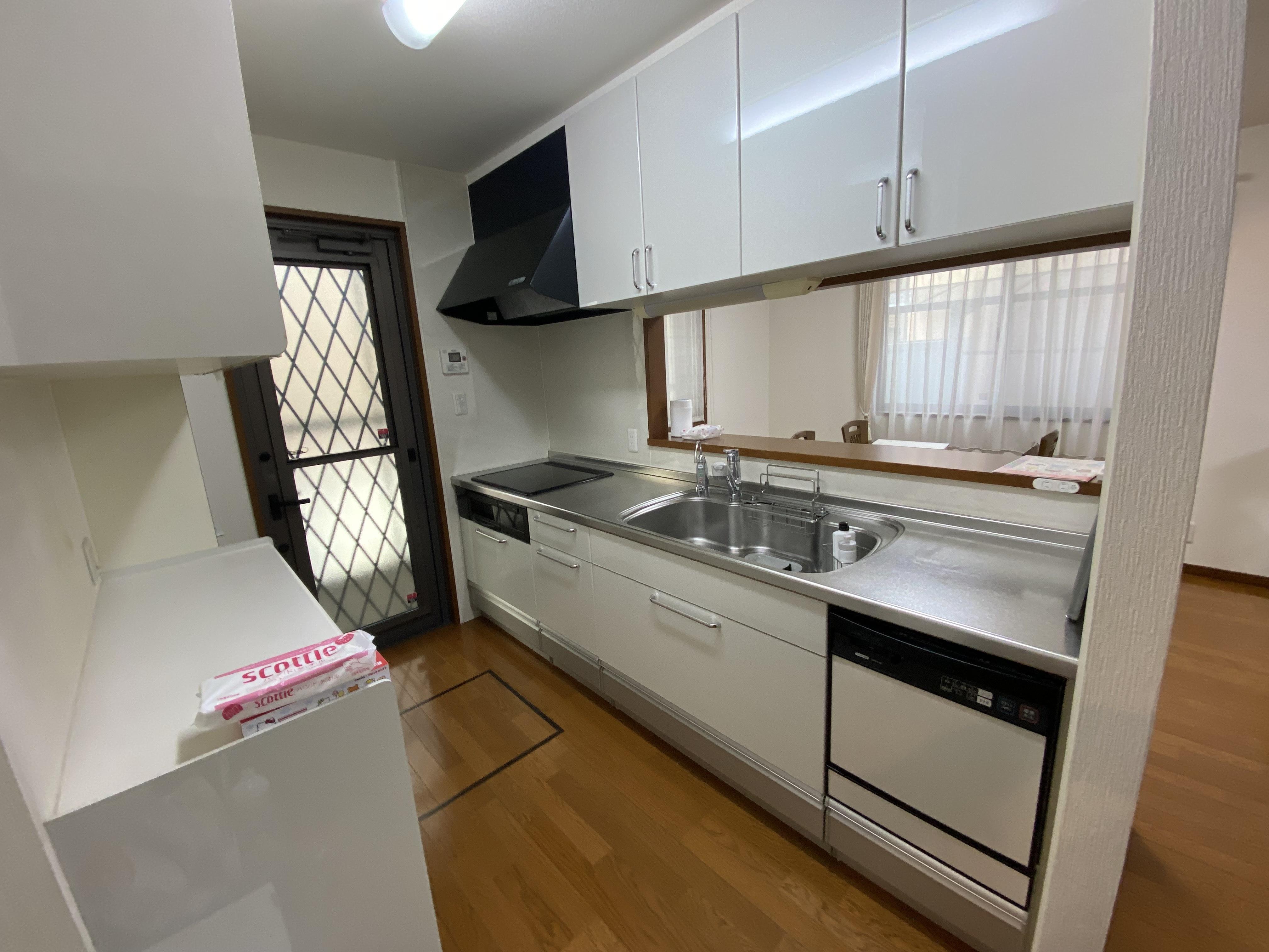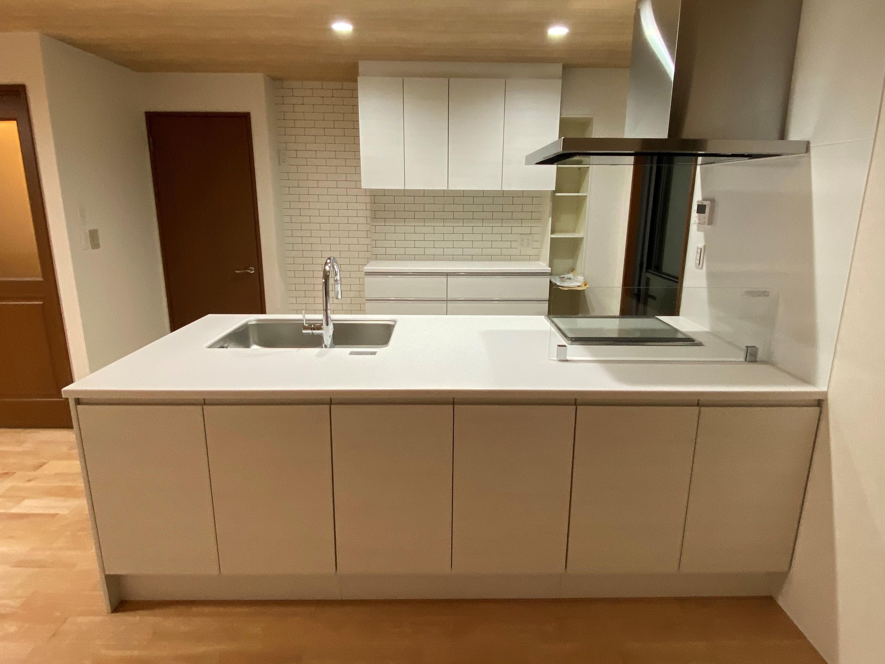 中古物件をご購入されてのリフォーム工事です。LDKは、設備だけでなく空間を一新するためにクロスの張替えだけでなく、床材をサクラの無垢床材に張替えました。キッチンも、下がり壁などがあったのも撤去してフルフラットのキッチンに変えて使いやすくなり、スタイリッシュな雰囲気になりました。