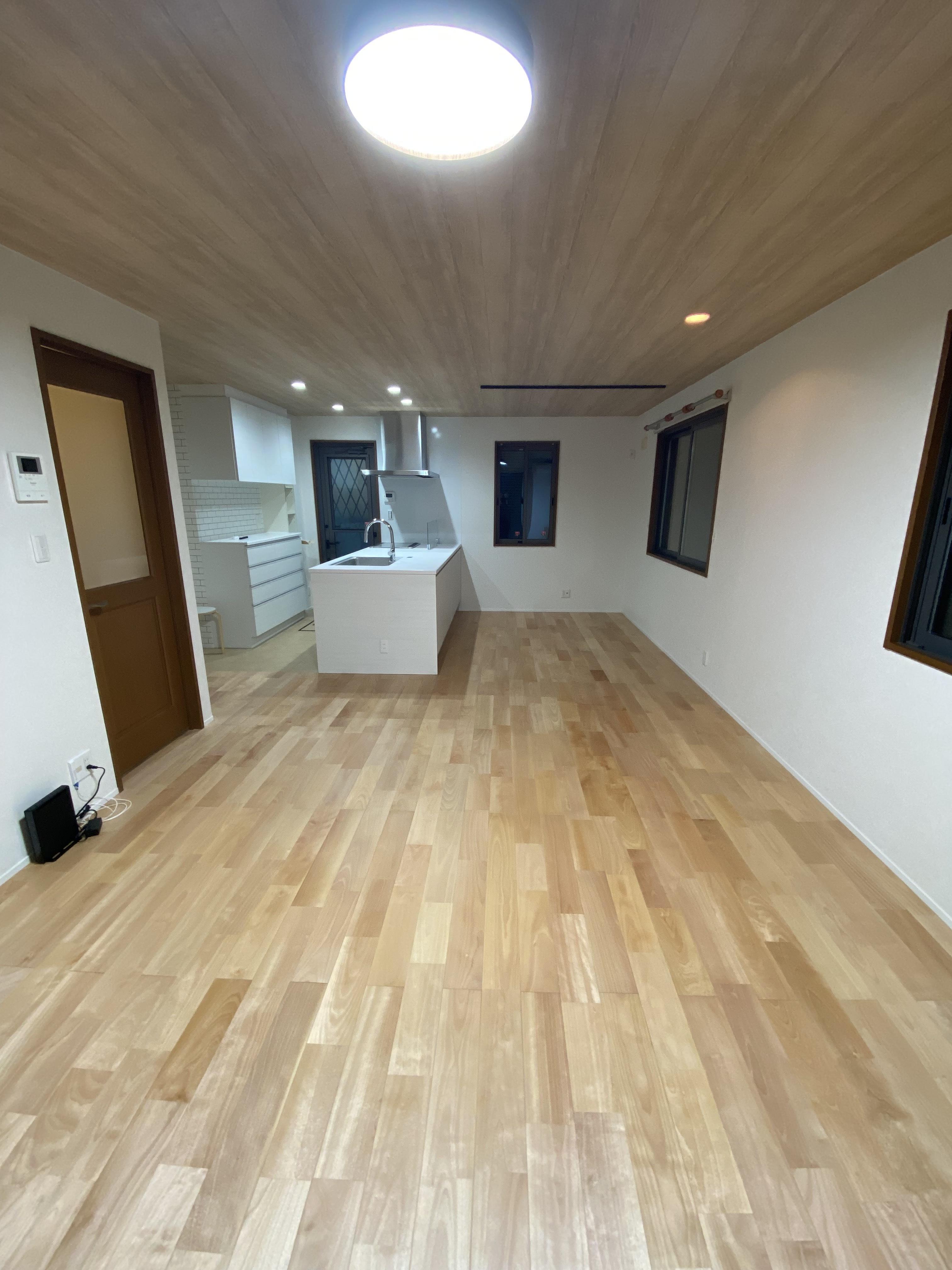 O様とは、家づくりをご検討され始めてから7年くらいのお付き合いでした。なかなか土地が出てこないエリアで探されてたのもあり物件探しには難航しました。そこでリフォームをすることでの可能性にも活路を見出して、タイミングよく出た中古物件にイメージを新しくするためLDKの空間提案をさせていただきました。こだわりのサクラの無垢床材も、しっかり悩まれて選んだ分、納得の仕上がりとなる綺麗な床となりました。