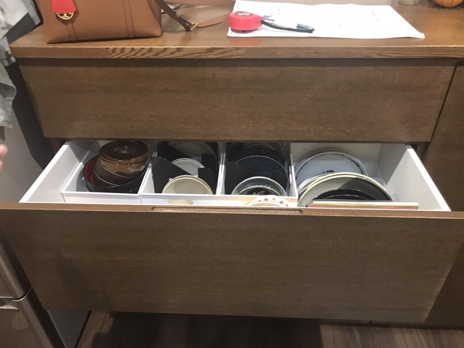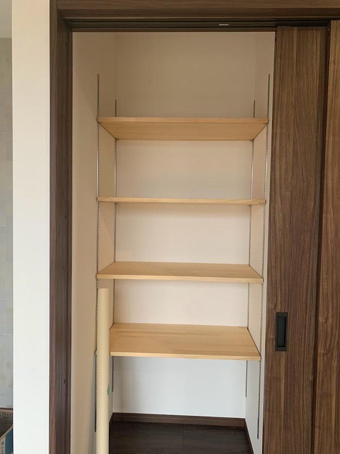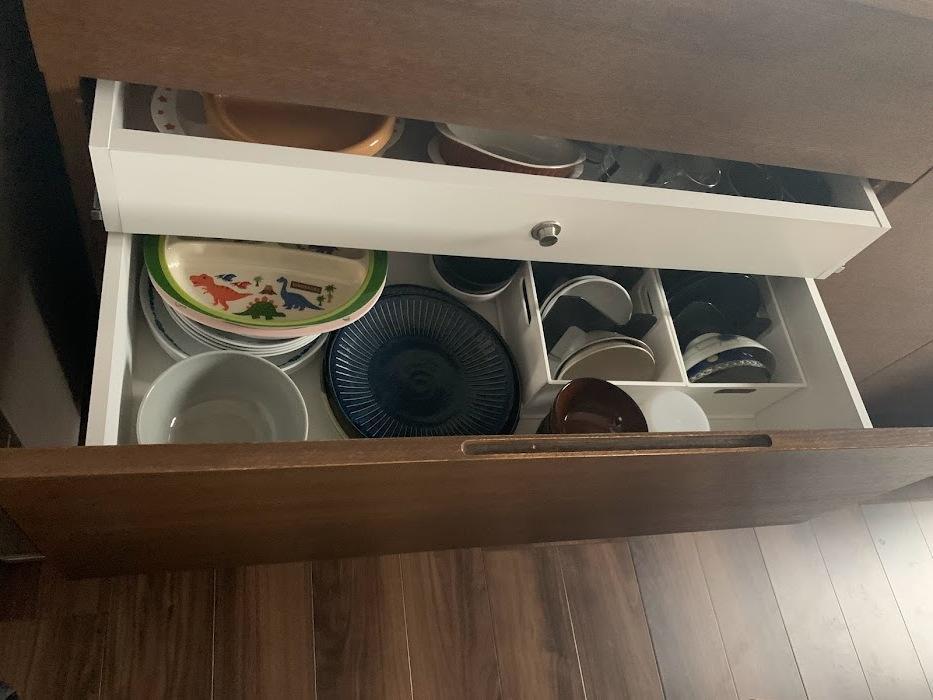 【タカ建築からのご提案】 和室の畳を樹脂畳にしてモダンな雰囲気へ。押入れには可動棚を付けて収納力もアップさせました。 キッチンの食器入れの収納力を上げる為、中にもう一つ引き出しを作りました。