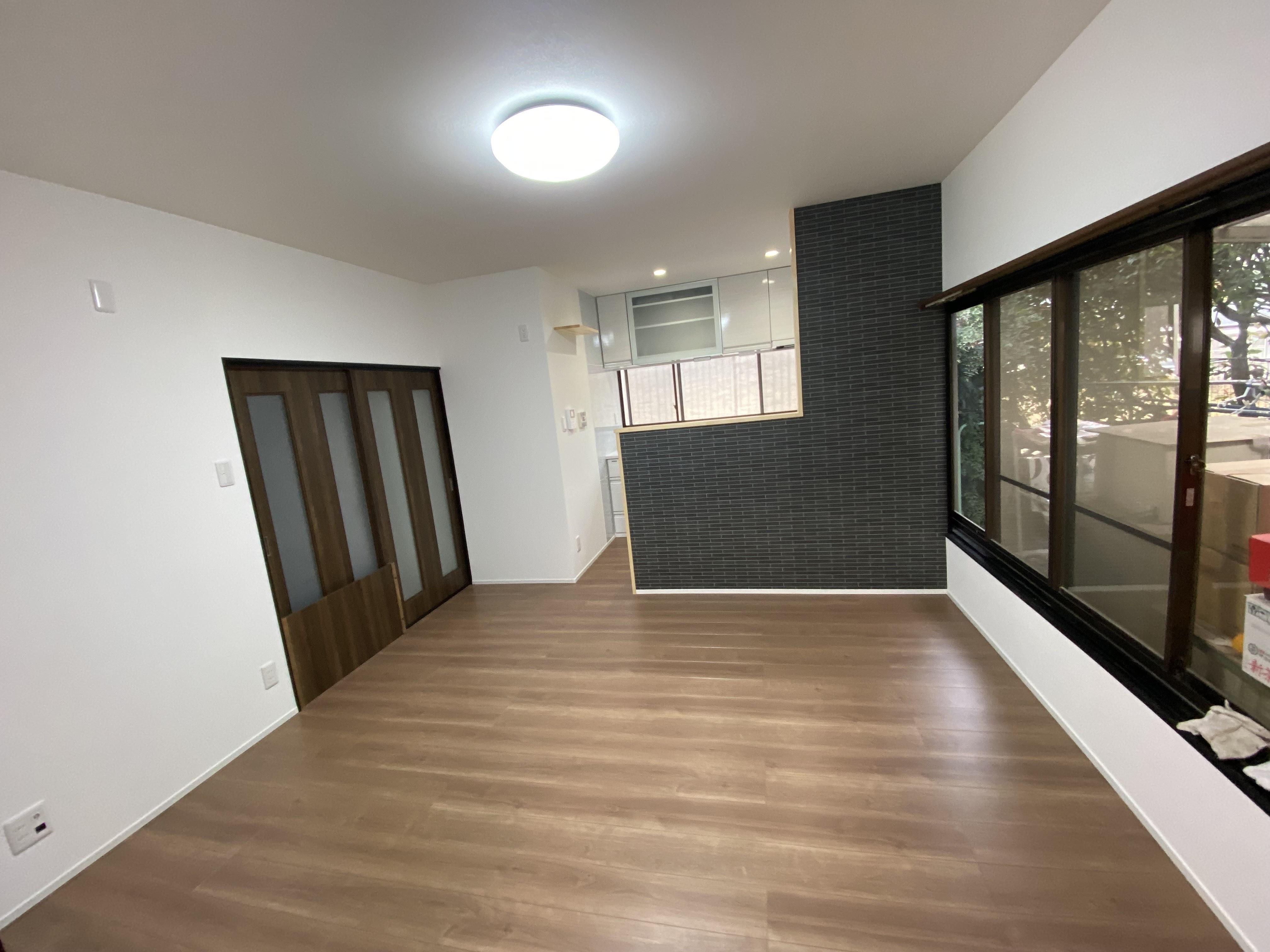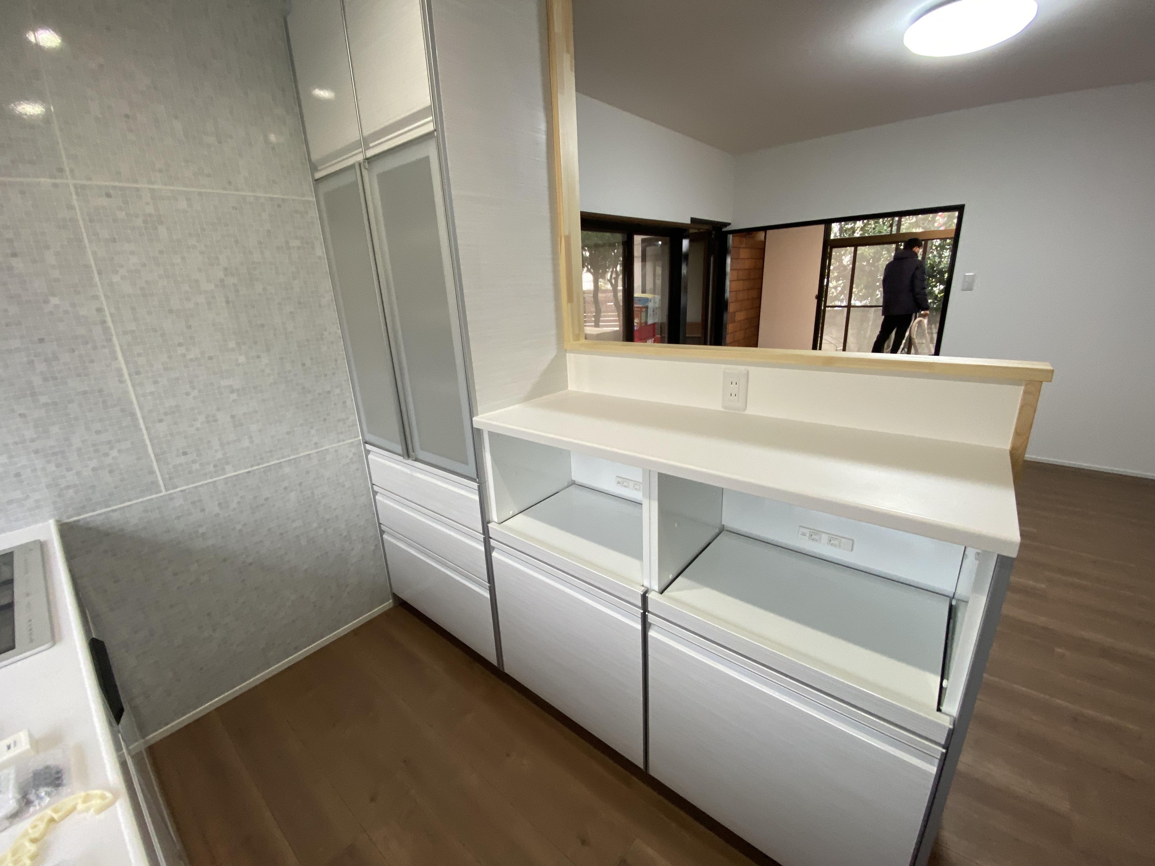 LDKを一新するリフォームをご希望されていたので、システムキッチンを交換しカップボード収納にもカウンターを作ることでキッチン側の物も見えなくなり、ダイニング側からは壁がアクセントになりました。また、よくある電気配線が露出されていてゴチャゴチャしていたので、この機会に全部隠蔽配線(壁や天井の表面にあるケーブルを内部に入れ込む)に変えて、使いやすり位置にスイッチ、コンセント設置を提案させて頂きました。