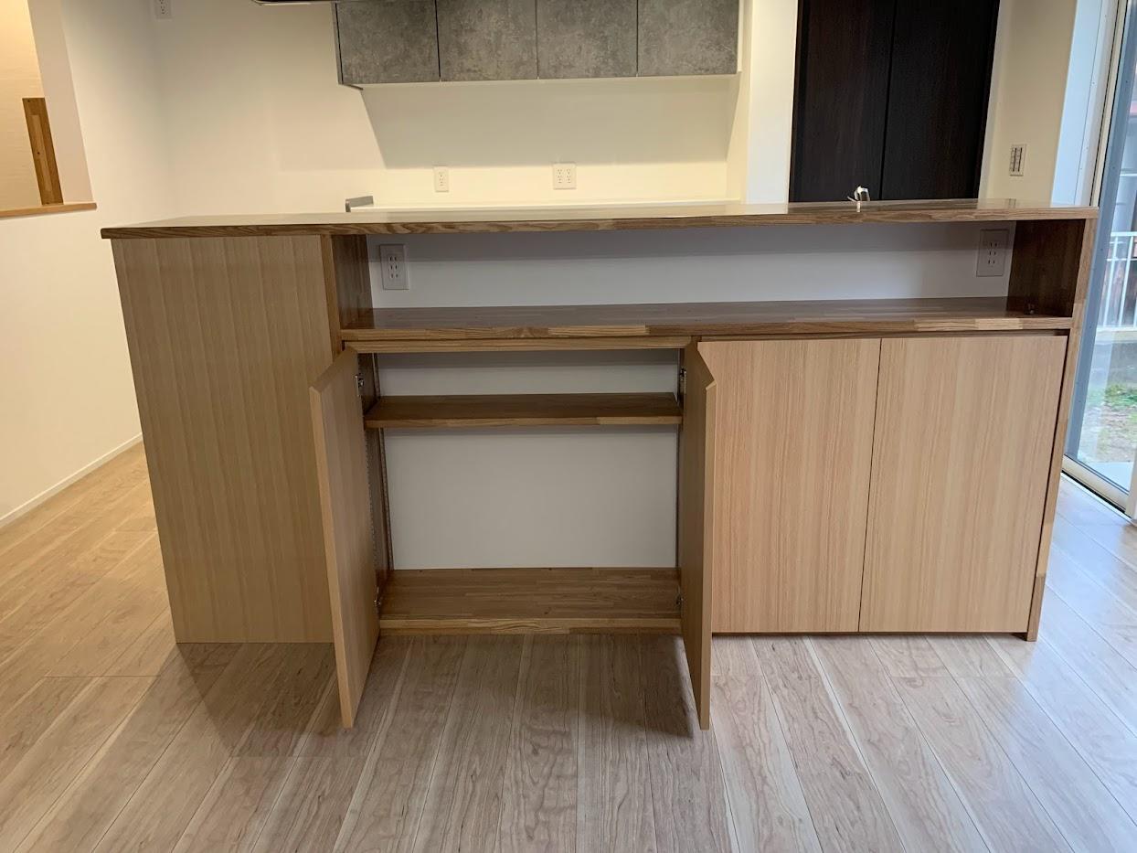 キッチン横には小上がりの和室を。そしてカウンターを設けてお子様がお勉強できる様に、ご両親も在宅でお仕事が出来る様に提案しました。お掃除のしやすいお風呂や、アイランドキッチンには収納スペースもしっかり確保しました。