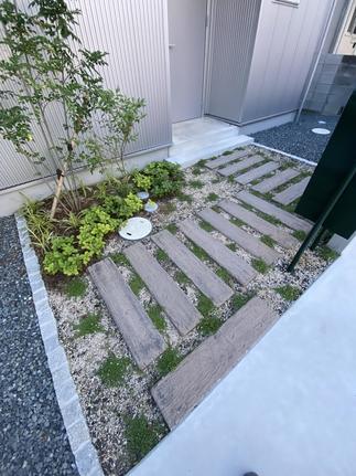 それだけでは無機質すぎるのでウリンのウッドフェンスと奥様がお気に入りの可愛らしい宅配ボックスをアクセントに。それにシンボルツリーとなる植栽と枕木が、温かみを感じられるようになりました。