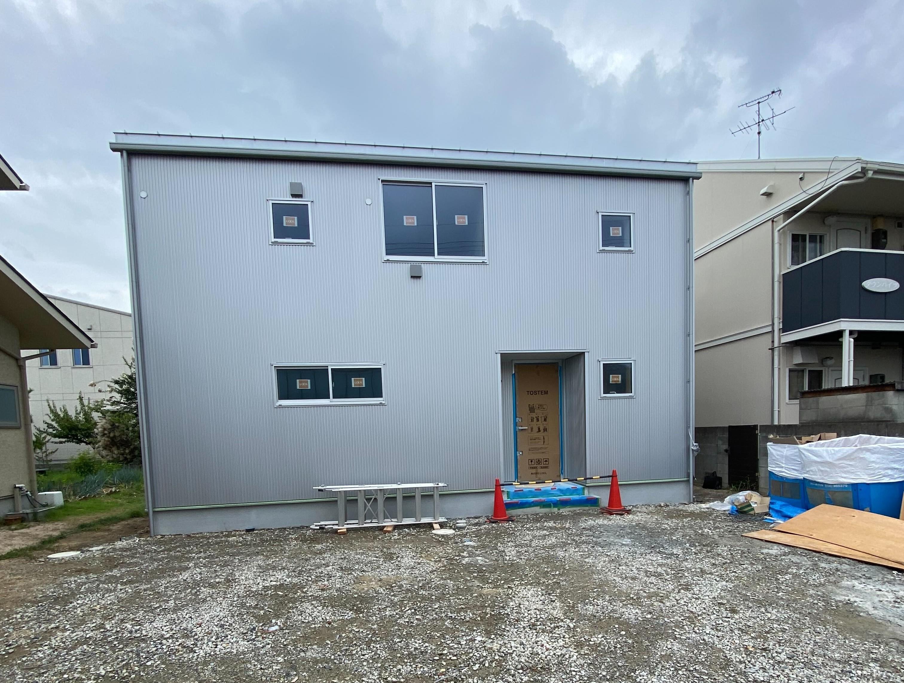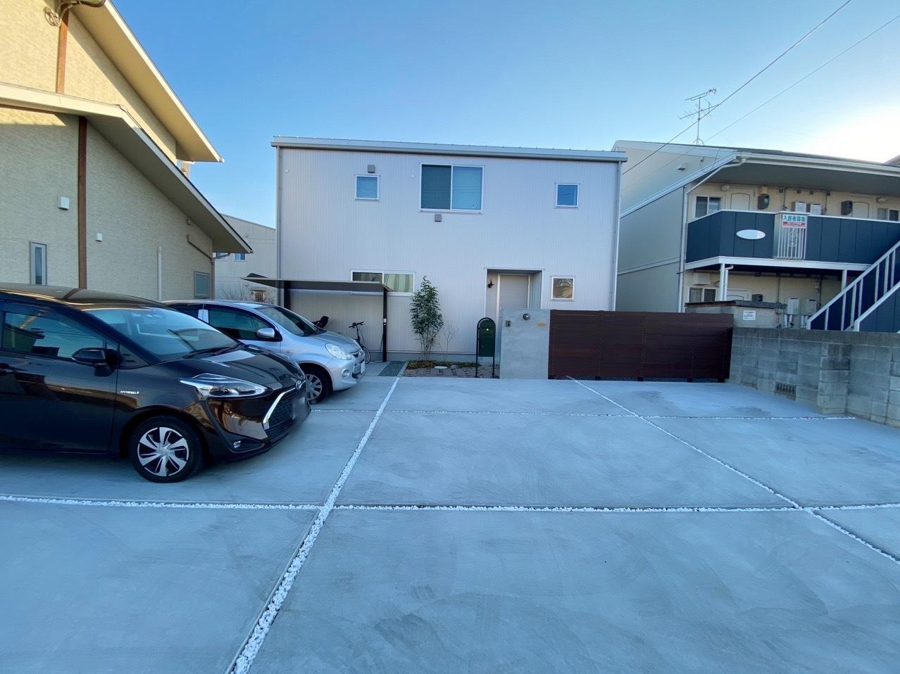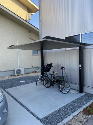 外壁がガルバリウムでスタイリッシュなお家なので、コンクリートを全面に打ち、スタイリッシュなサイクルボートのLIXILのSCを採用。門柱はスタイリッシュなモルタル仕上げ。