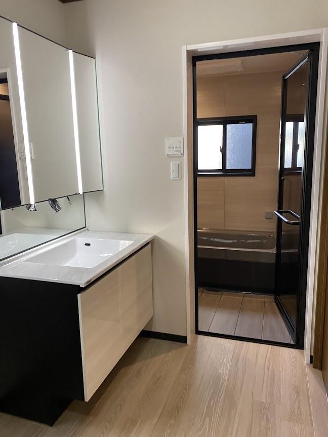 浴室は、ブラックをアクセントにしながらも明るい雰囲気で、またとても落ち着いたホテルライクな雰囲気にもなりました。キッチンも、ワンちゃんに負担をかけないようにシート施工をして雰囲気も変わりました。