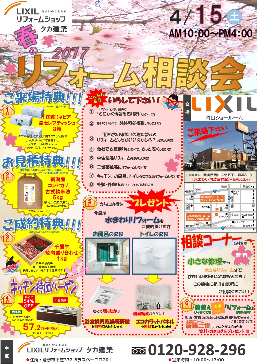 4月15日(土)にリクシル岡山ショールームにてリフォーム相談会を開催します。