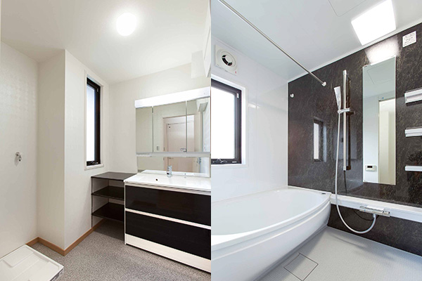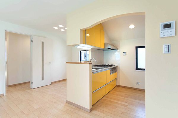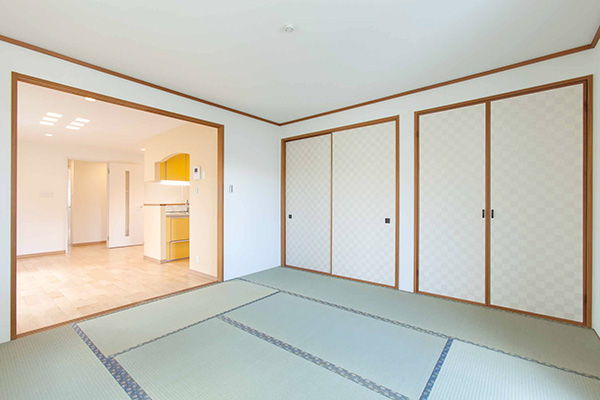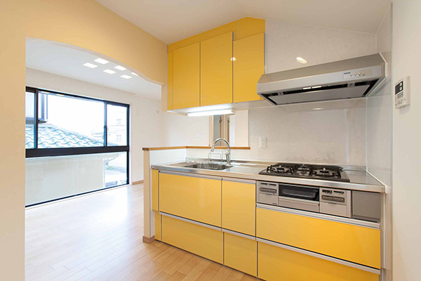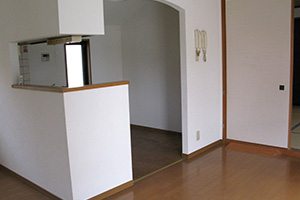 中古住宅を購入されてフルリフォームを希望のお客様。 玄関が2つあり、1階と2階に分かれている2世帯の住宅でした。 1階は4LDK、2階は2LDKと広い間取りをどのようにしてご希望に近づけていくか色々と密に打ち合わせを行いました。 1階の間仕切壁を取り壊し、リビングを広くして和室にもL型の引き戸を設置、開放感のある空間を創りだしました。 ダイニングには既存物のサイディング壁が設置されていましたが、これを活かしつつ表面をデザイン塗装することで、ひときわ目立つアクセントポイントとなりました。 2階は基本的に客