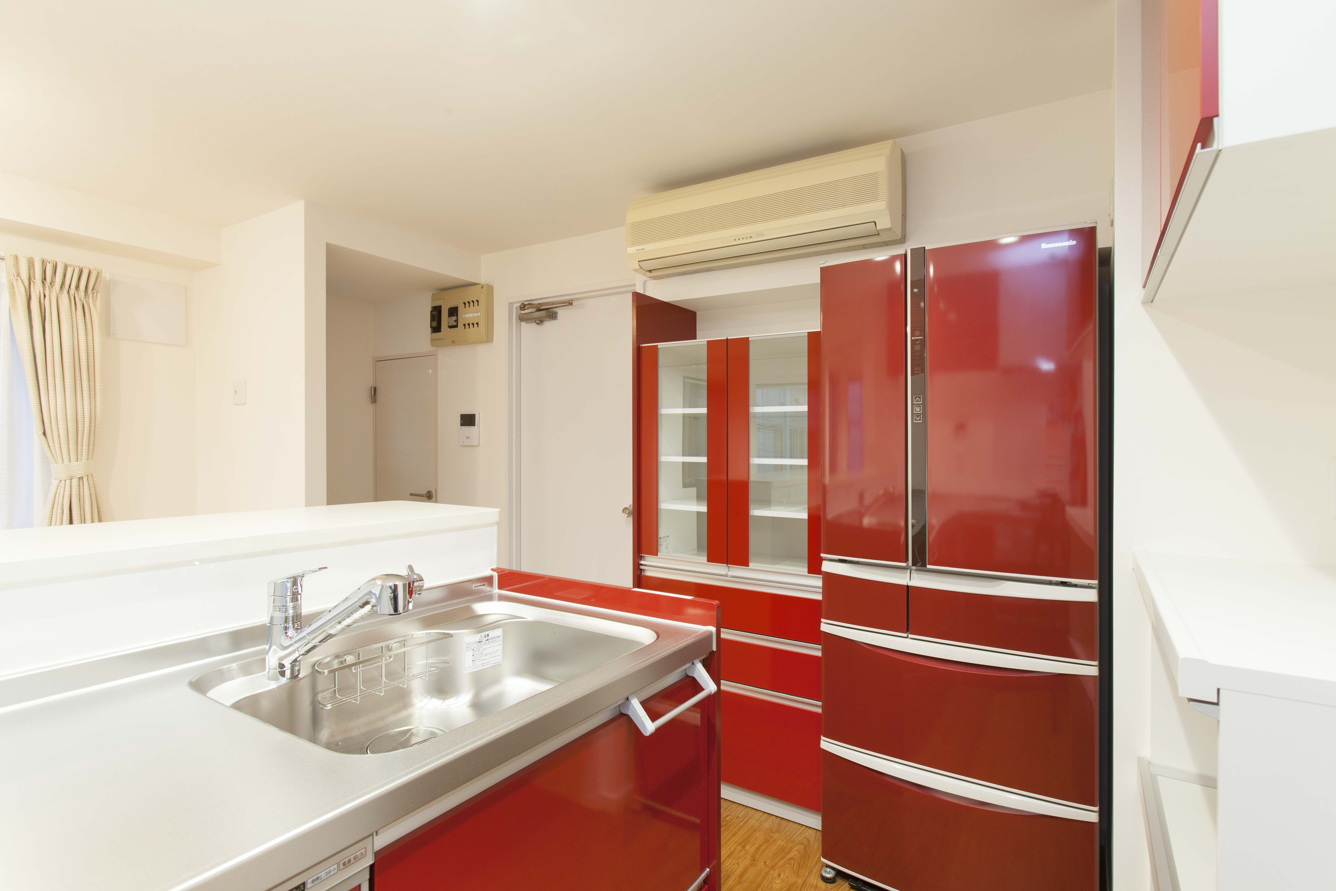 ご主人の仕事先移転に伴い、事務所中心として使われていた建物をご自宅としてリフォームされる事になりました。 今まで事務所として使われていた2階は事務所とダイニングキッチンに。 3階に水まわりをまとめ、4階を居室に。 奥様の選ばれた赤い扉のL型オープンキッチンと同色で特注された冷蔵庫がアクセントとなり、明るいおもてなし空間となっています。