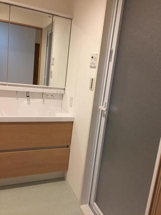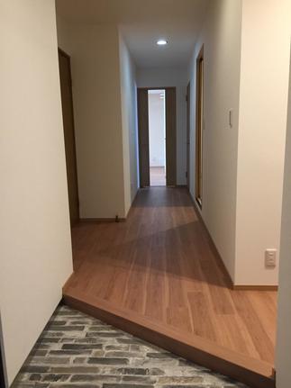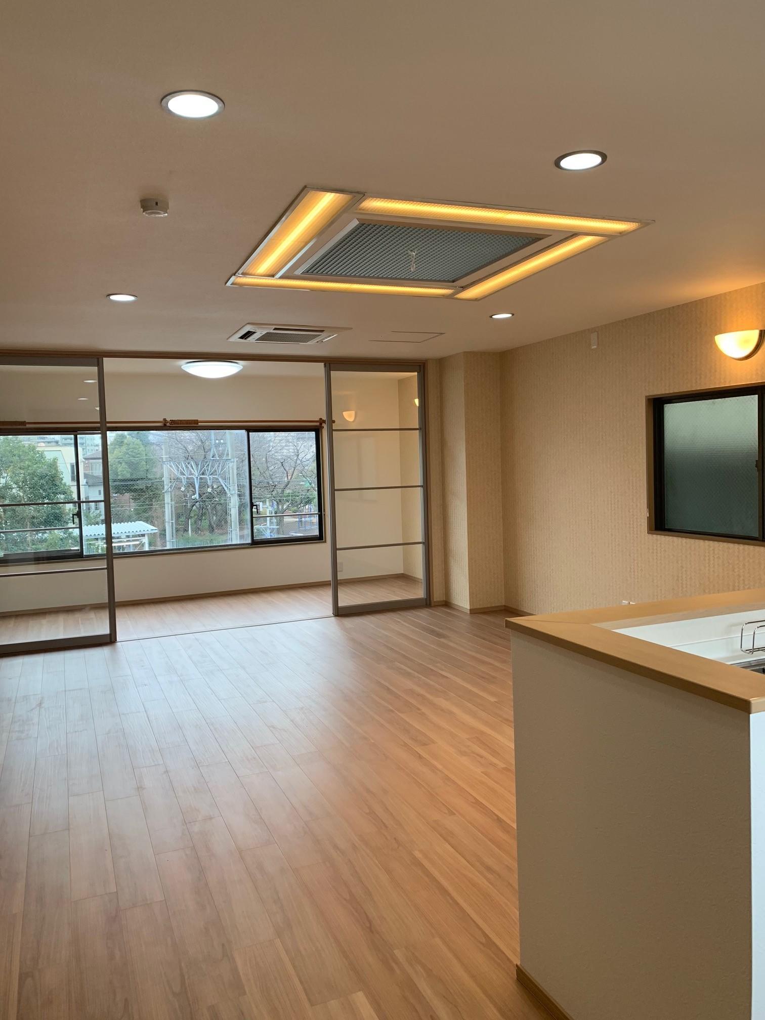 ご両親の住居をリフォームし、子世帯へ。設備(キッチン、ユニットバス、洗面化粧台、トイレ)交換・内装・間仕切り設置をさせて頂きました。ダーク系の空間から明るいオーク系へ変更し、大空間であったLDKはさらに広く開放的に生まれ変わりました。