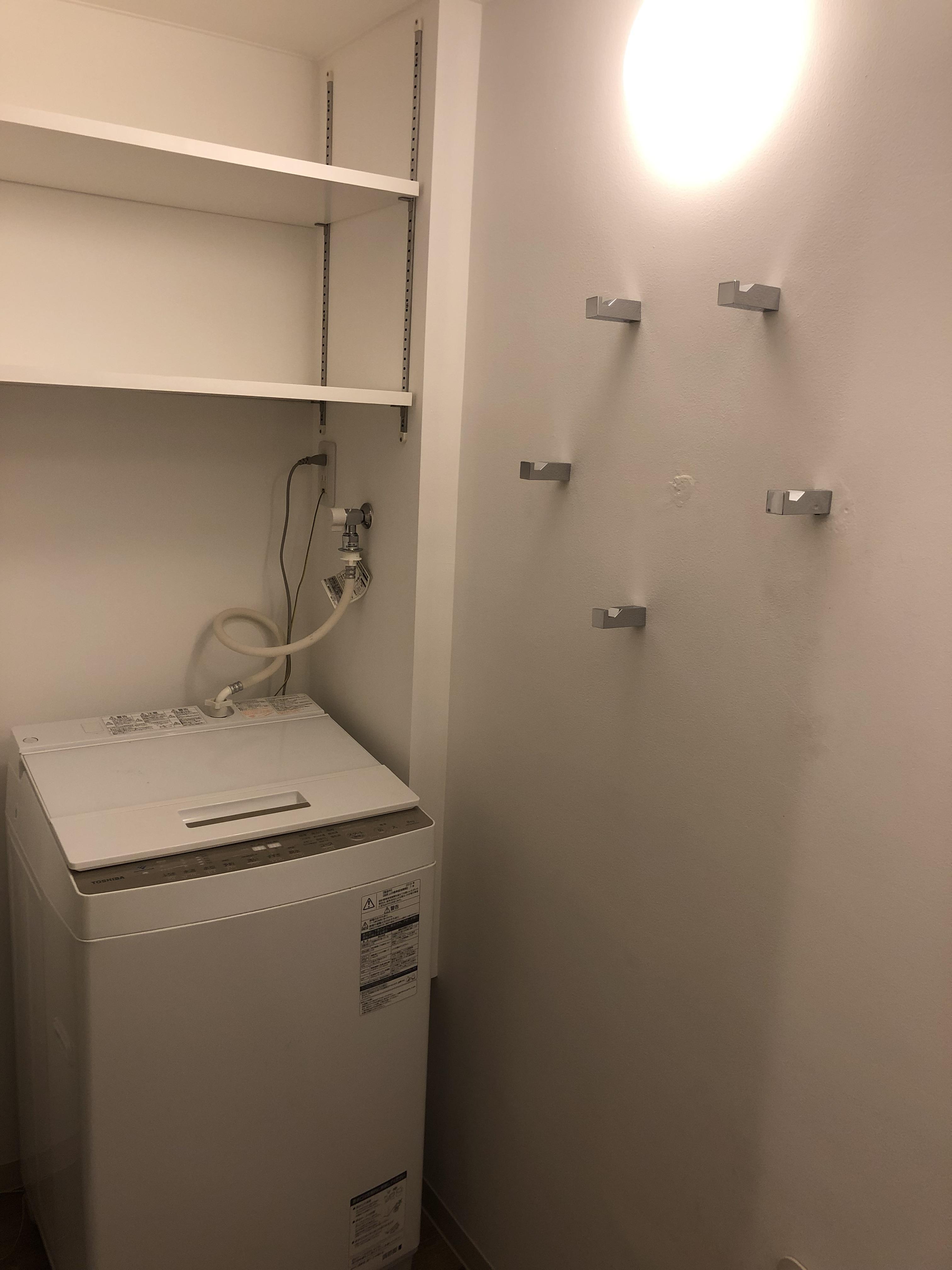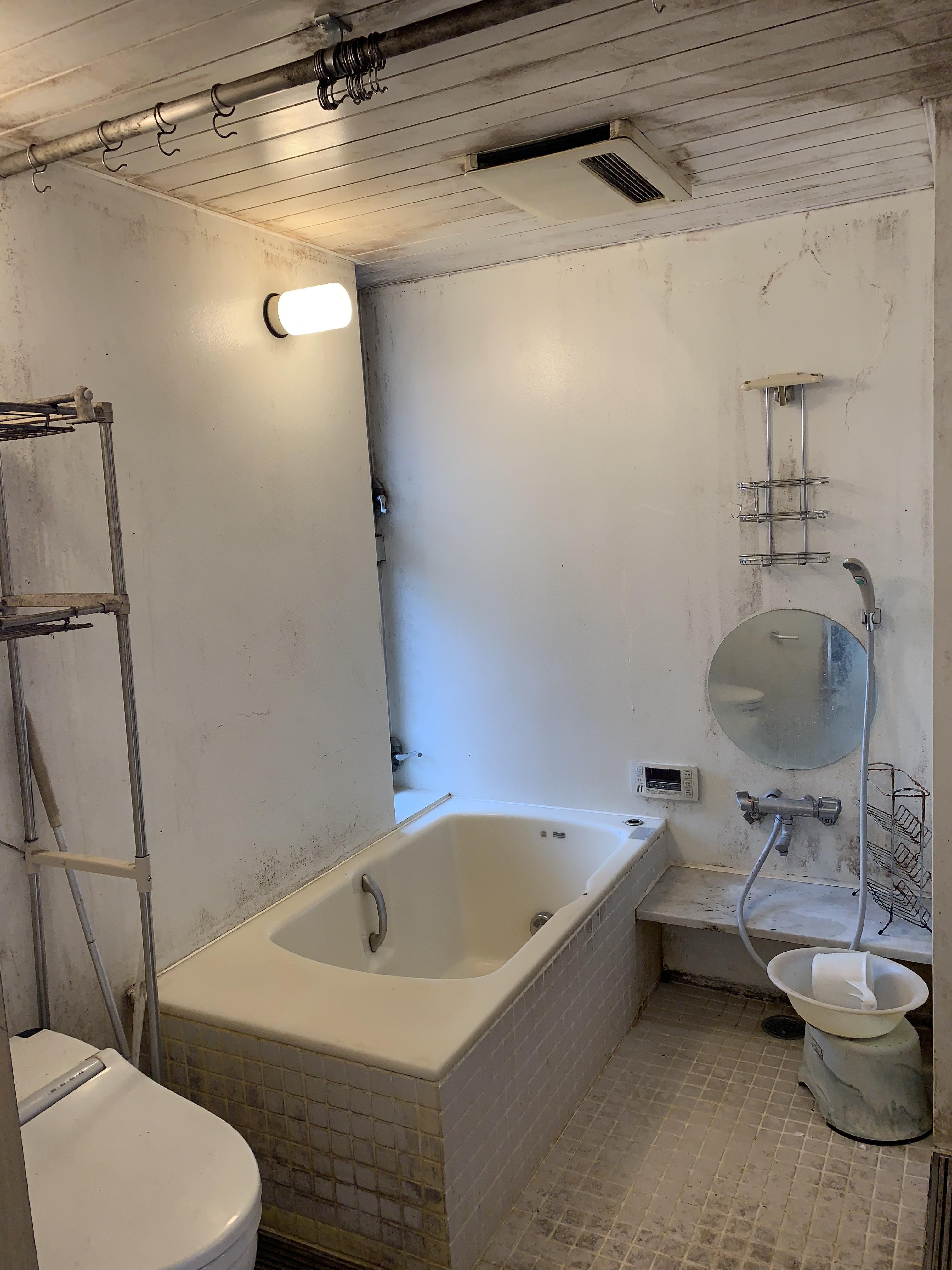 ホテルの様な仕切りのない空間に、バス・洗面・トイレがあり、カビで大変お困りであったK様。個室のユニットバスをご希望でした。新たな壁を設置する為、空間の関係上通常のシステム洗面が設置出来ず、、、試行錯誤の末、公共施設に使用される洗面ボールを見つけ、ご提案しました。その横には、家族5人分の可動棚と、5つのタオル掛けフックを設置。明るく快適な空間となりました。
