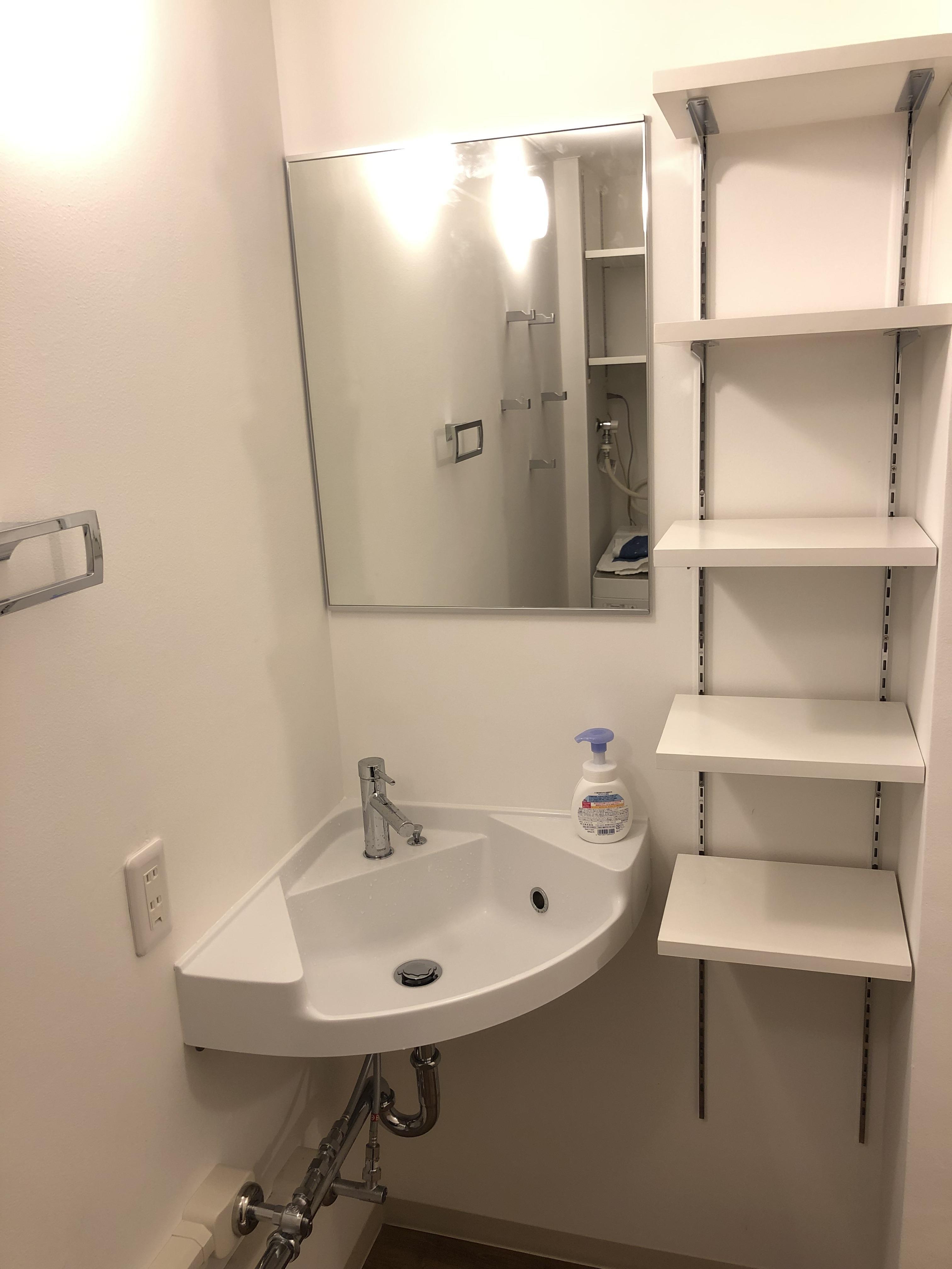 新築時、親御様の介護が必要であった為に、間仕切りのない一室に浴室・洗面・トイレが設置されていました。その後、3人のお子様達も成長され、個室をご希望との事で、ご来店いただきました。新たな壁を設置する為、空間の関係上通常のシステム洗面が設置出来ず、、、試行錯誤の末、公共施設に使用される洗面ボールを見つけ、ご提案しました。その横には、家族5人分の可動棚と、5つのタオル掛けフックを設置。快適になったとの嬉しいお言葉をいただき、私達もとても嬉しいです。