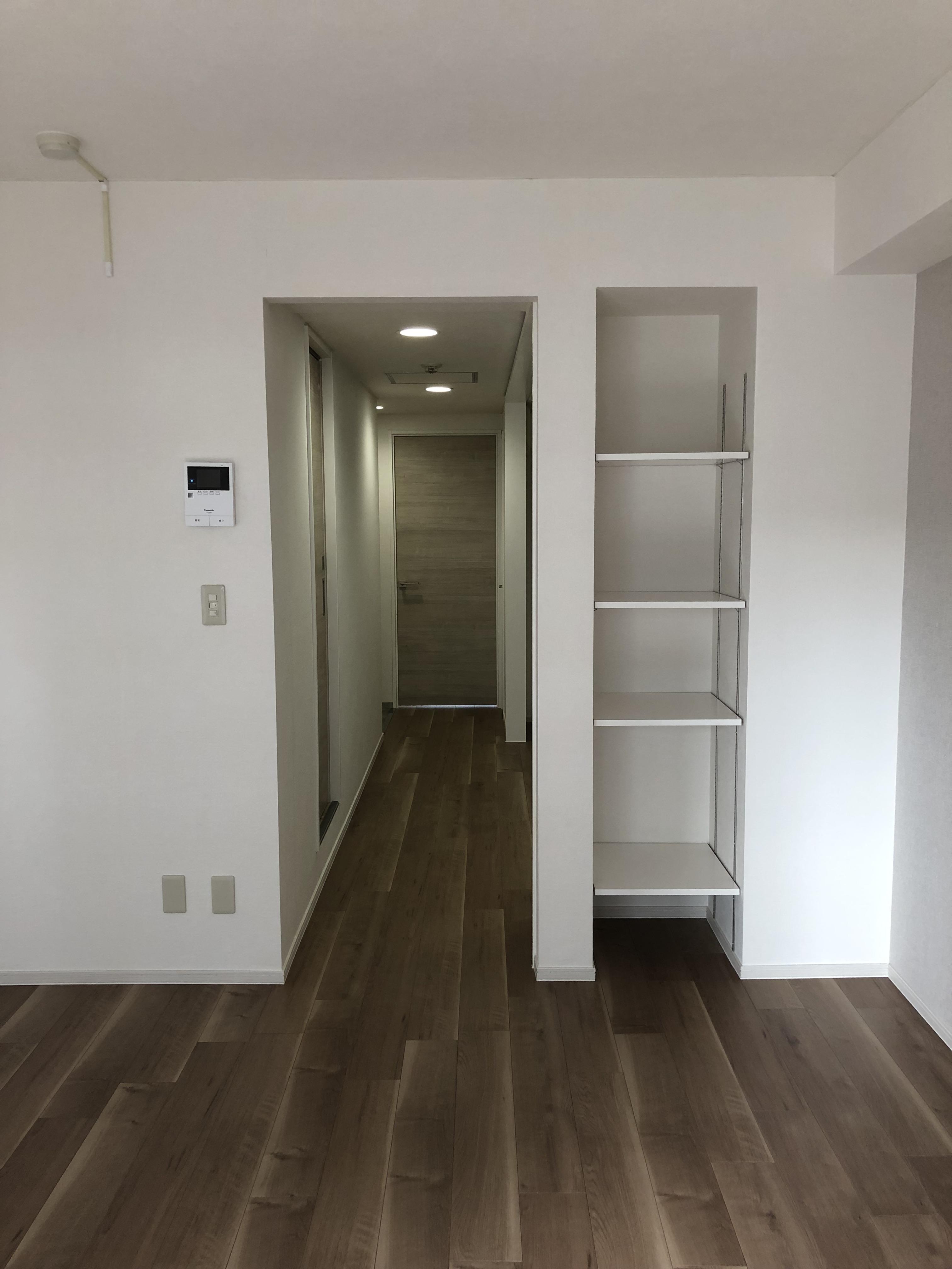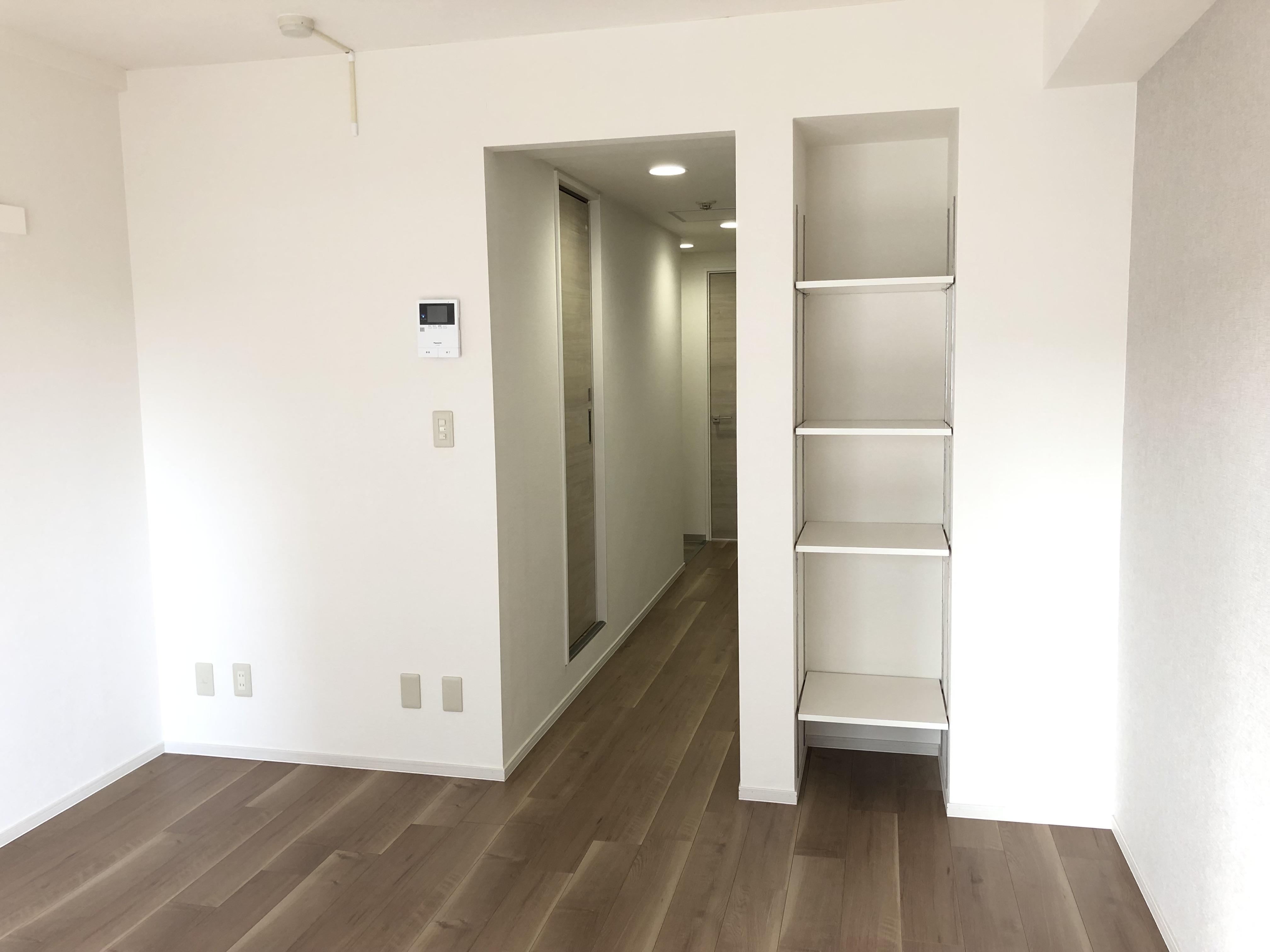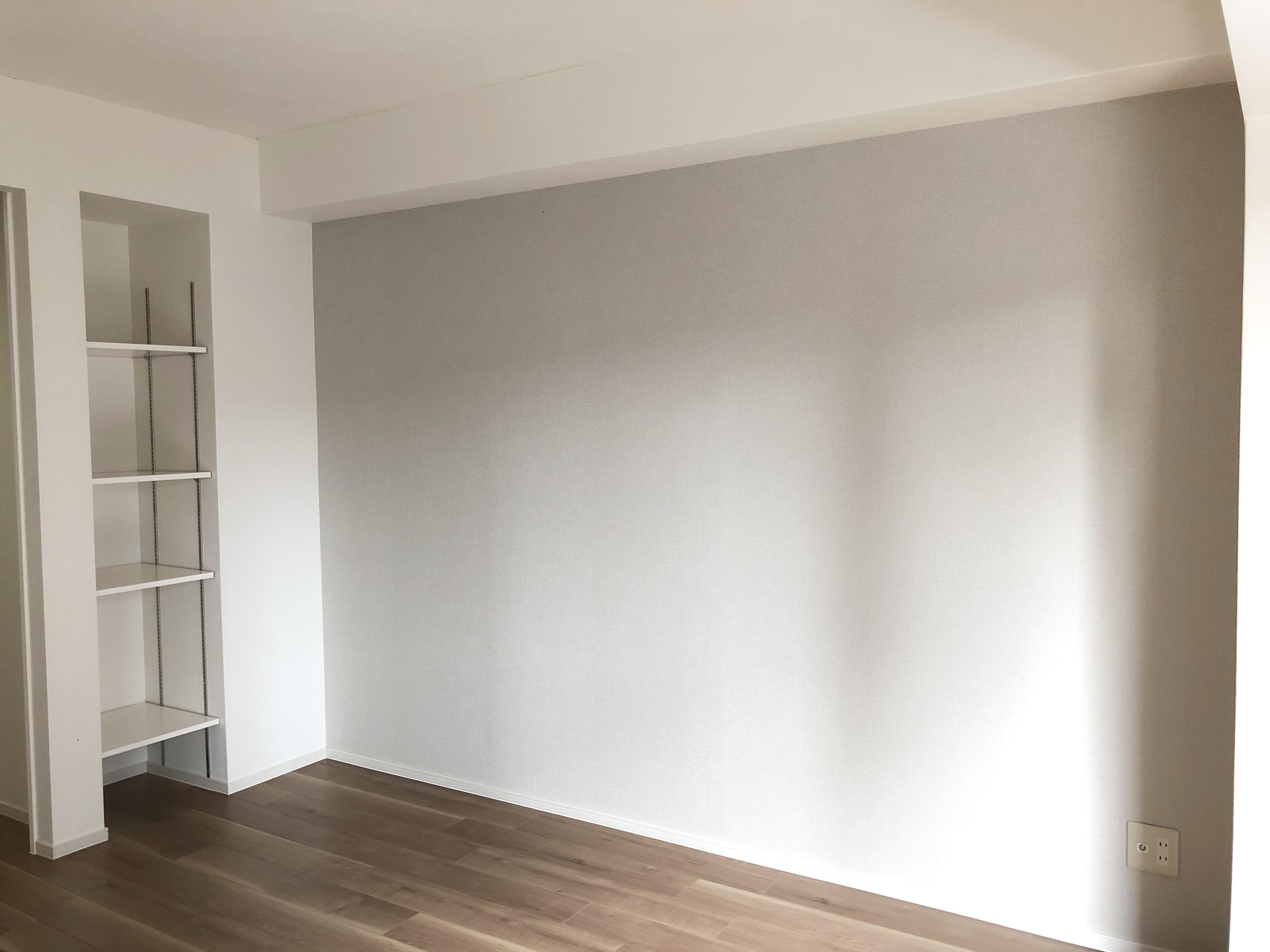 リビングの1面にグレーのアクセントクロスを配置。グレイッシュなフローリングともマッチ。既存のくぼみ部分は使い勝手を良くするために可動棚を設置。