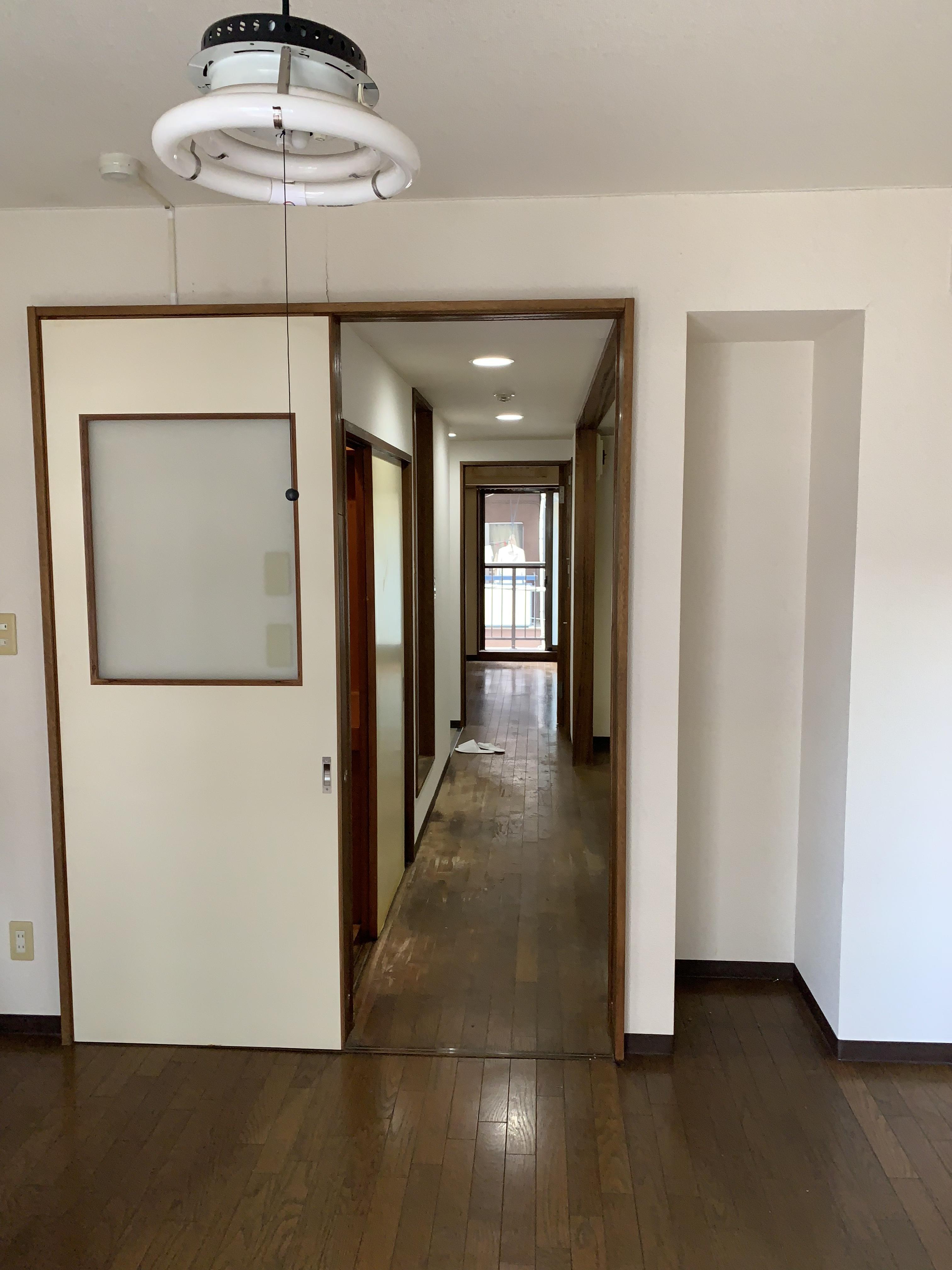 以前はキッチンのあるホール部分とリビングダイニングが分かれていたため、扉を撤去して広さも感じられる一体の空間としました。