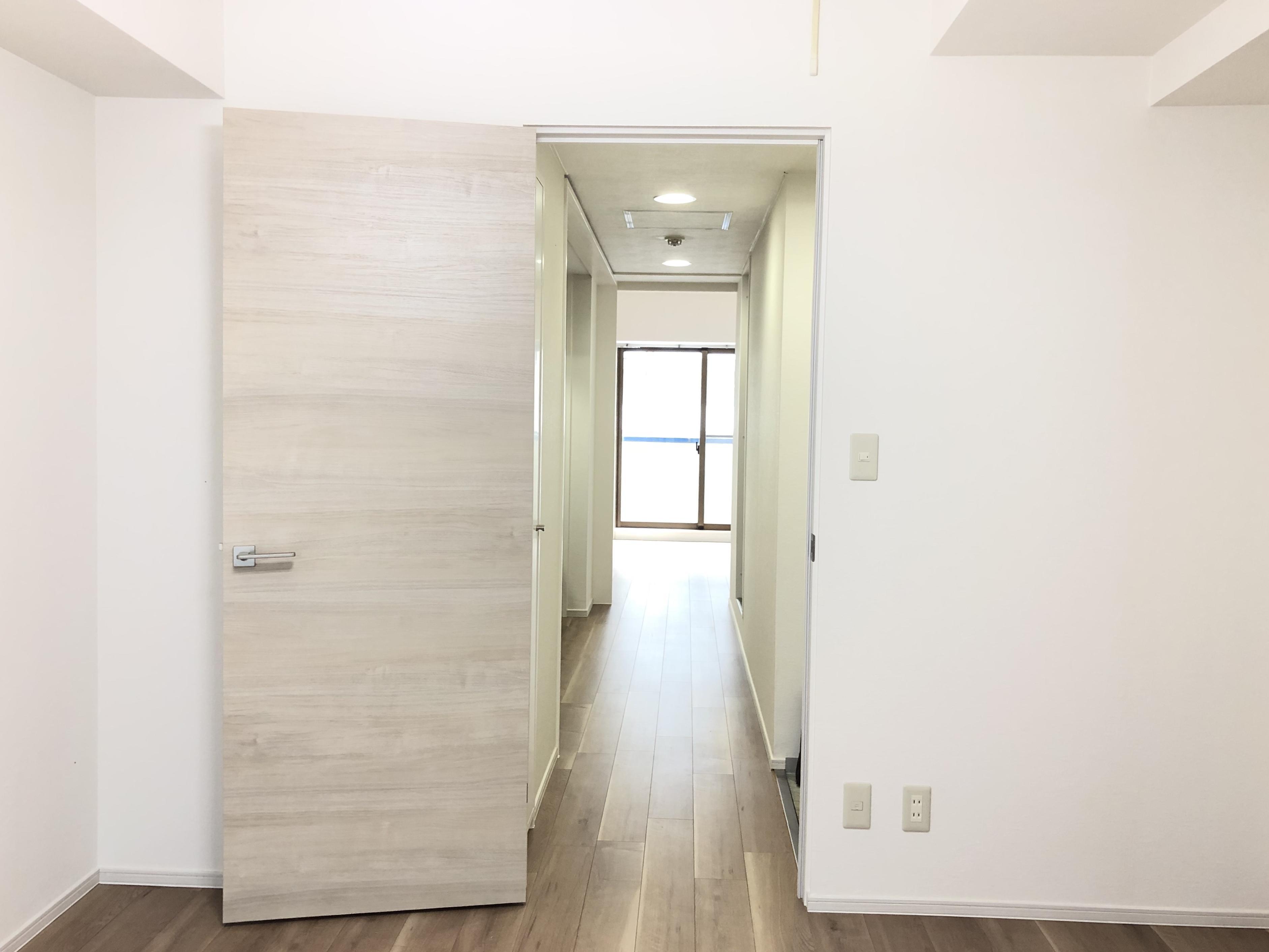 寝室の扉を開けると気持ちいい風が抜けてきます。フローリングも全て同じ色で見切りなく通すことで、奥行きの感じられる空間に。扉もグレイッシュなフローリングに合わせてご提案。